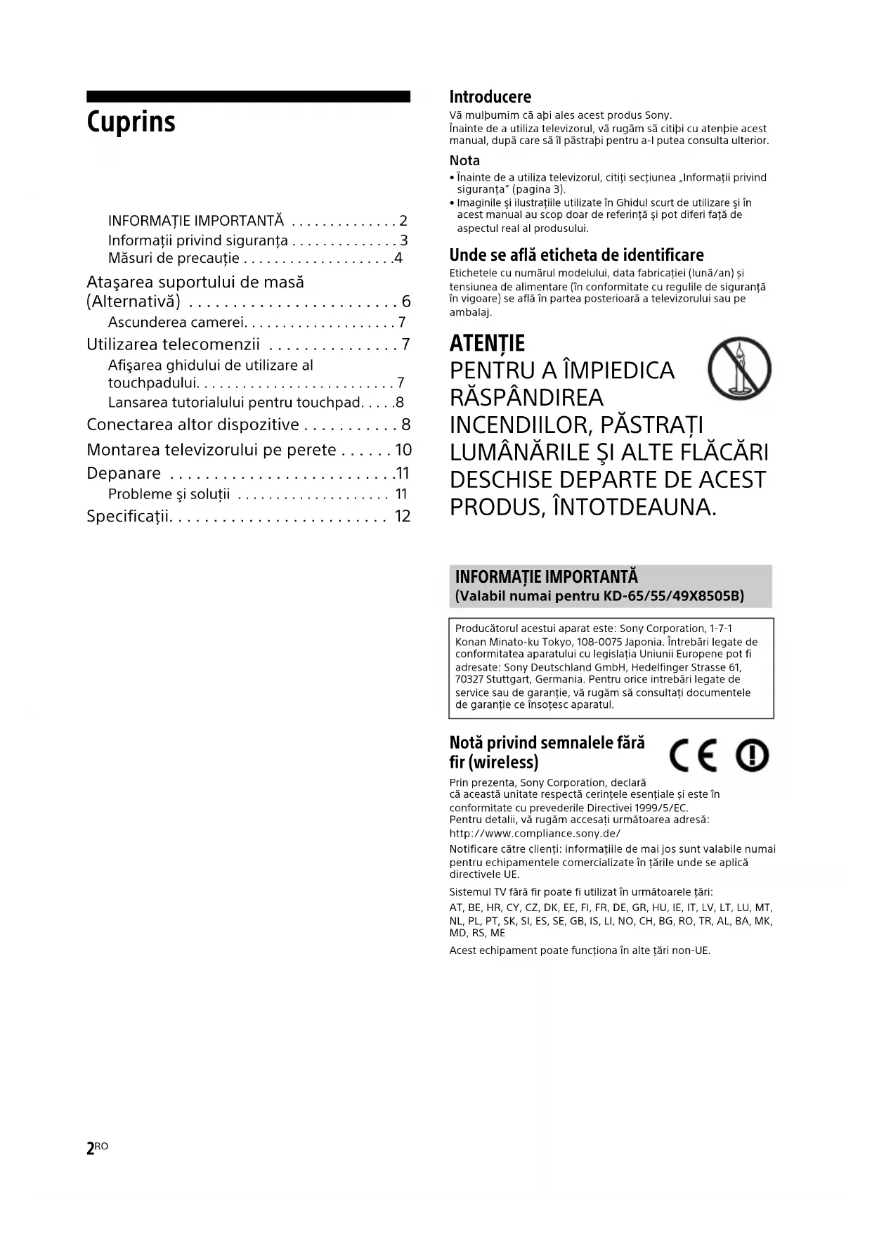(Valabil numai pentru KD-65/55/49X8505B)Producătorul acestui aparat este: Sony Corporation, 1-7-1 Konan Minato-ku Tokyo, 108-0075 Japonia. Întrebări legate de conformitatea aparatului cu legislaţia Uniunii Europene pot fi adresate: Sony Deutschland GmbH, Hedelfinger Strasse 61, 70327 Stuttgart, Germania. Pentru orice intrebări legate de service sau de garanţie, vă rugăm să consultaţi documentele de garanţie ce însoţesc aparatul.RO
