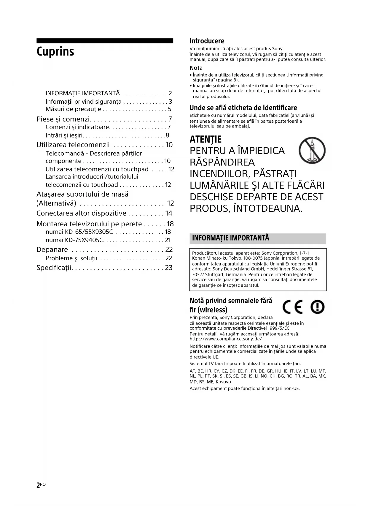 PRODUS, ÎNTOTDEAUNA. Notă privind semnalele fără fir (wireless) Prin prezenta, Sony Corporation, declară că această unitate respectă cerinţele esenţiale și este în conformitate cu prevederile Directivei 1999/5/EC.Pentru detalii, vă rugăm accesaţi următoarea adresă:http://www.compliance.sony.de/Notificare către clienţi: informaţiile de mai jos sunt valabile numai pentru echipamentele comercializate în ţările unde se aplică directivele UE.Sistemul TV fără fir poate fi utilizat în următoarele ţări:AT, BE, HR, CY, CZ, DK, EE, FI, FR, DE, GR, HU, IE, IT, LV, LT, LU, MT, NL, PL, PT, SK, SI, ES, SE, GB, IS, LI, NO, CH, BG, RO, TR, AL, BA, MK, MD, RS, ME, KosovoAcest echipament poate funcţiona în alte ţări non-UE.