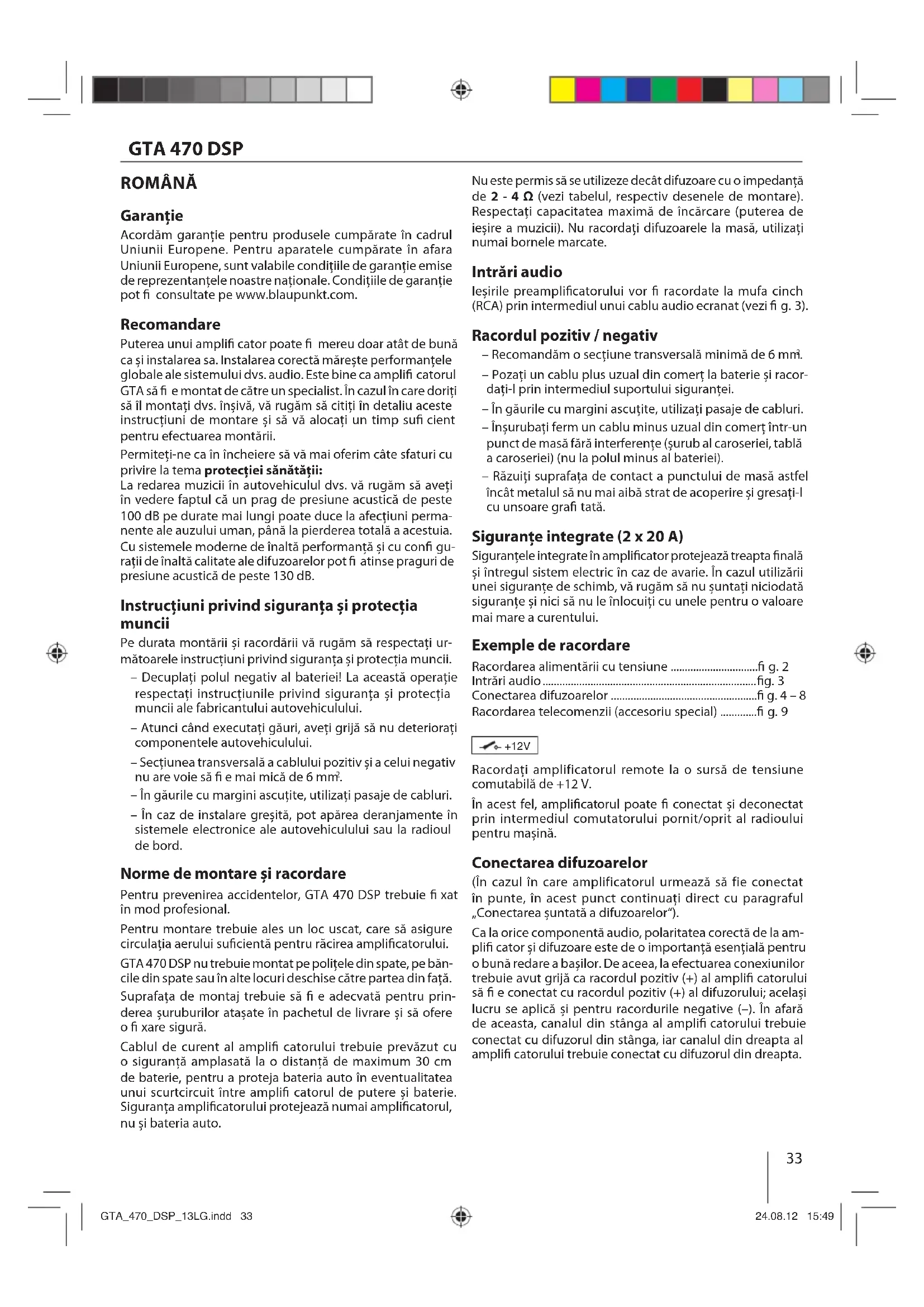 ROMÂNĂ Garanţie Acordăm garanţie pentru produsele cumpărate în cadrul Uniunii Europene. Pentru aparatele cumpărate în afara Uniunii Europene, sunt valabile condiţiile de garanţie emise de reprezentanţele noastre naţionale. Condiţiile de garanţie pot consultate pe www.blaupunkt.com. Recomandare Puterea unui ampli cator poate mereu doar atât de bună ca și instalarea sa. Instalarea corectă mărește performanţele globale ale sistemului dvs. audio. Este bine ca ampli catorul GTA să e montat de către un specialist. În cazul în care doriţi să îl montaţi dvs. înșivă, vă rugăm să citiţi în detaliu aceste instrucţiuni de montare și să vă alocaţi un timp su cient pentru efectuarea montării. Permiteţi-ne ca în încheiere să vă mai oferim câte sfaturi cu privire la tema protecţiei sănătăţii: La redarea muzicii în autovehiculul dvs. vă rugăm să aveţi în vedere faptul că un prag de presiune acustică de peste 100 dB pe durate mai lungi poate duce la afecţiuni perma- nente ale auzului uman, până la pierderea totală a acestuia. Cu sistemele moderne de înaltă performanţă și cu con gu- raţii de înaltă calitate ale difuzoarelor pot atinse praguri de presiune acustică de peste 130 dB. Instrucţiuni privind siguranţa și protecţia muncii Pe durata montării și racordării vă rugăm să respectaţi ur- mătoarele instrucţiuni privind siguranţa și protecţia muncii. – Decuplaţi polul negativ al bateriei! La această operaţie respectaţi instrucţiunile privind siguranţa și protecţia muncii ale fabricantului autovehiculului. – Atunci când executaţi găuri, aveţi grijă să nu deterioraţi componentele autovehiculului. – Secţiunea transversală a cablului pozitiv și a celui negativ nu are voie să e mai mică de 6 mm
