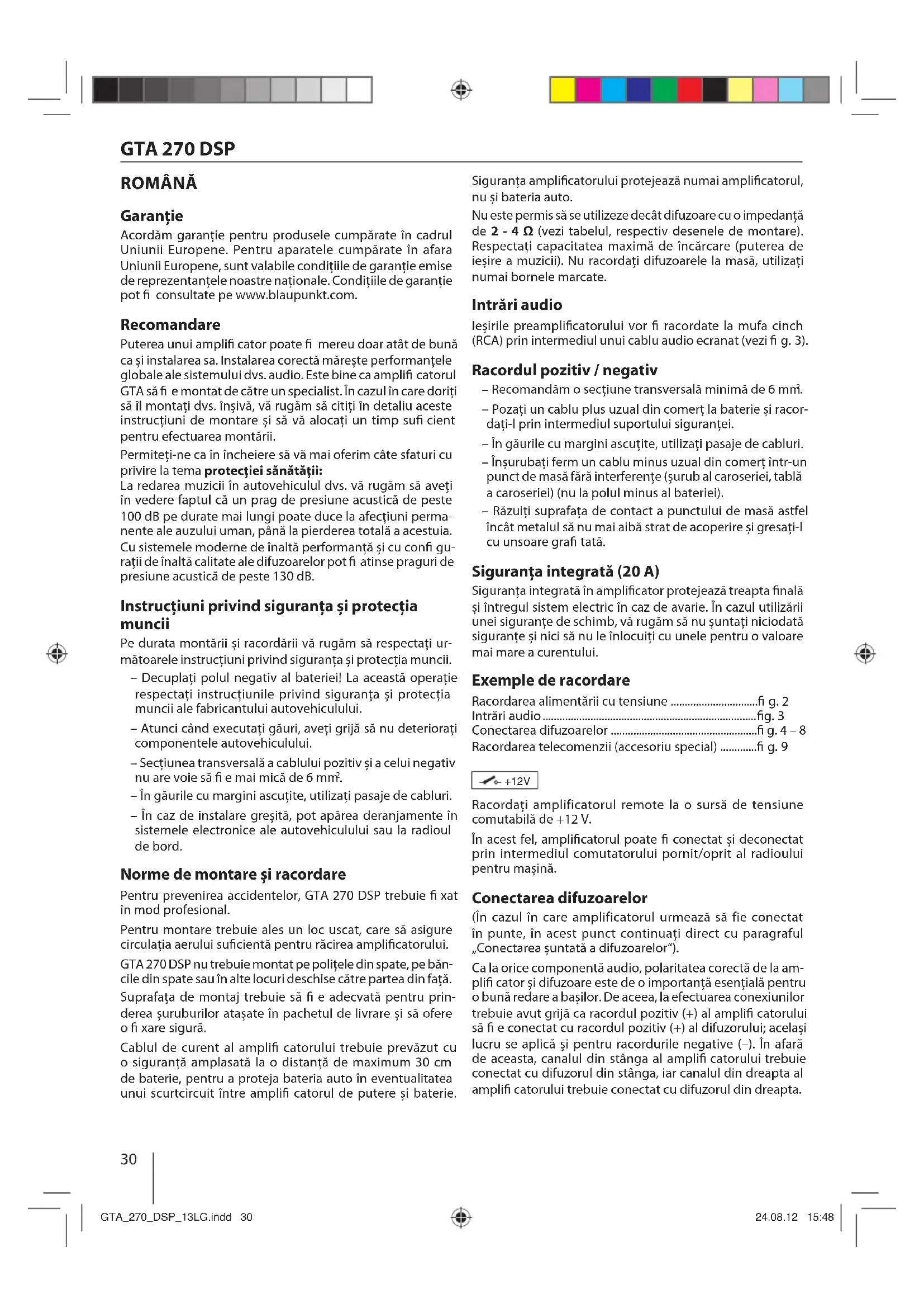 ROMÂNĂ Garanţie Acordăm garanţie pentru produsele cumpărate în cadrul Uniunii Europene. Pentru aparatele cumpărate în afara Uniunii Europene, sunt valabile condiţiile de garanţie emise de reprezentanţele noastre naţionale. Condiţiile de garanţie pot consultate pe www.blaupunkt.com. Recomandare Puterea unui ampli cator poate mereu doar atât de bună ca și instalarea sa. Instalarea corectă mărește performanţele globale ale sistemului dvs. audio. Este bine ca ampli catorul GTA să e montat de către un specialist. În cazul în care doriţi să îl montaţi dvs. înșivă, vă rugăm să citiţi în detaliu aceste instrucţiuni de montare și să vă alocaţi un timp su cient pentru efectuarea montării. Permiteţi-ne ca în încheiere să vă mai oferim câte sfaturi cu privire la tema protecţiei sănătăţii: La redarea muzicii în autovehiculul dvs. vă rugăm să aveţi în vedere faptul că un prag de presiune acustică de peste 100 dB pe durate mai lungi poate duce la afecţiuni perma- nente ale auzului uman, până la pierderea totală a acestuia. Cu sistemele moderne de înaltă performanţă și cu con gu- raţii de înaltă calitate ale difuzoarelor pot atinse praguri de presiune acustică de peste 130 dB. Instrucţiuni privind siguranţa și protecţia muncii Pe durata montării și racordării vă rugăm să respectaţi ur- mătoarele instrucţiuni privind siguranţa și protecţia muncii. – Decuplaţi polul negativ al bateriei! La această operaţie respectaţi instrucţiunile privind siguranţa și protecţia muncii ale fabricantului autovehiculului. – Atunci când executaţi găuri, aveţi grijă să nu deterioraţi componentele autovehiculului. – Secţiunea transversală a cablului pozitiv și a celui negativ nu are voie să e mai mică de 6 mm