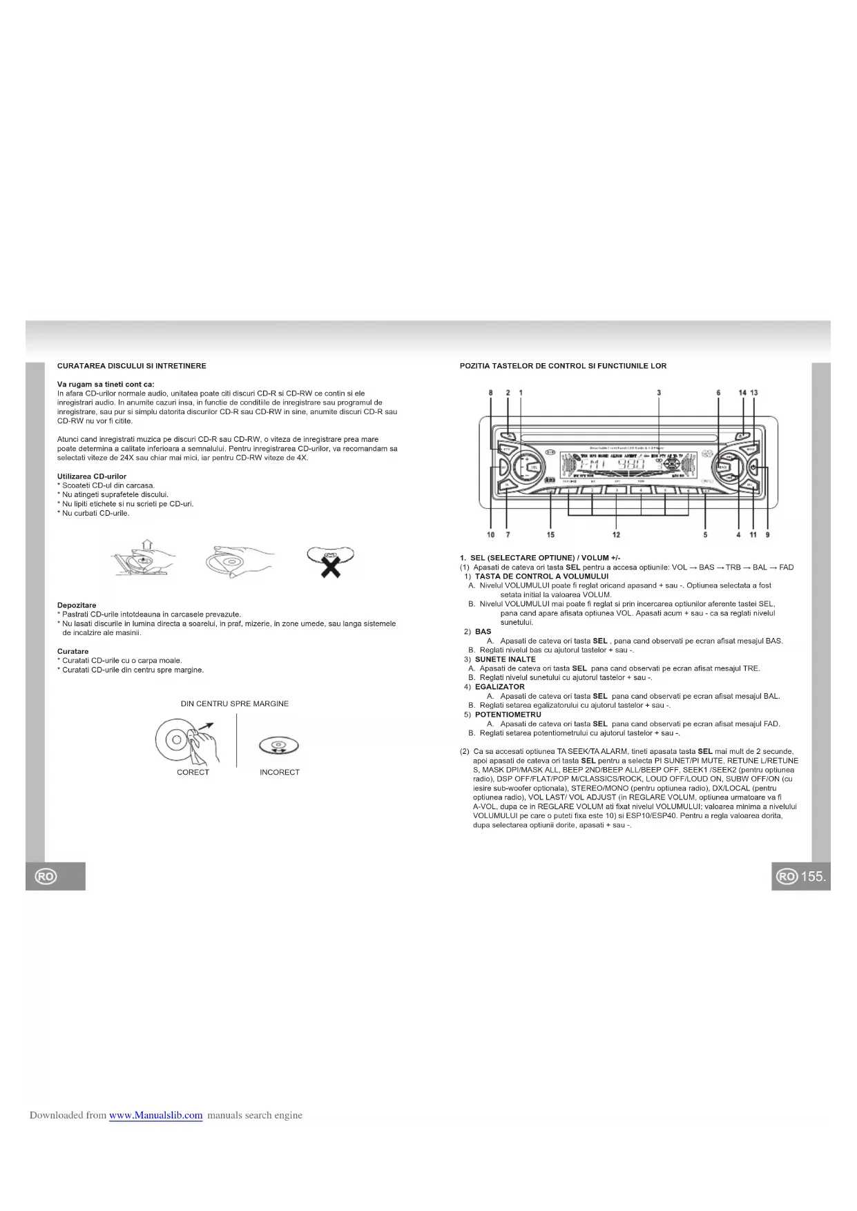 B) In optiunea de redare a discului, apasati tasta TOP / pentru a intrerupe citirea; apasati din nou tasta TOP / pentru a continua citirea. Tineti apasata tasta TOP/ pentru a citi prima inregistrare a discului. C) In optiunea de redare CD / MP3, apasati tasta INT pentru a citi primele 10 secunde ale fiecarei inregistrari. Veti observa afisajul S-INT. Tineti apasata tasta INT pentru a citi primele 10 secunde ale fiecarei inregistrari aflate in fisierul curent. Veti observa afisajul D-INT. Apasati din nou tasta INT pentru a reveni la optiunea anterioara de citire. D) In optiunea de redare CD / MP3, apasati tasta RPT pentru a repeta inregistrarea in curs. Veti observa afisajul S-RPT. Tineti apasata tasta RPT pentru a repeta fisierul curent. Veti observa afisajul D-RPT. Apasati din nou tasta RPT pentru a iesi din optiunea de repetitie. E) In optiunea de redare CD / MP3, apasati tasta RDM pentru a repeta inregistrarile in mod aleatoriu. Veti observa afisajul S-RDM. Tineti apasata tasta RDM pentru a repeta toate inregistrarile aflate in fisier, in mod aleatoriu. Veti observa afisajul D-RDM. Apasati din nou tasta RDM pentru a iesi din optiunea aleatorie. F) In optiunea de redare MP3, tastele postului prestabilit 5 si 6 pot accesa 10-inregistrari inainte si inapoi.