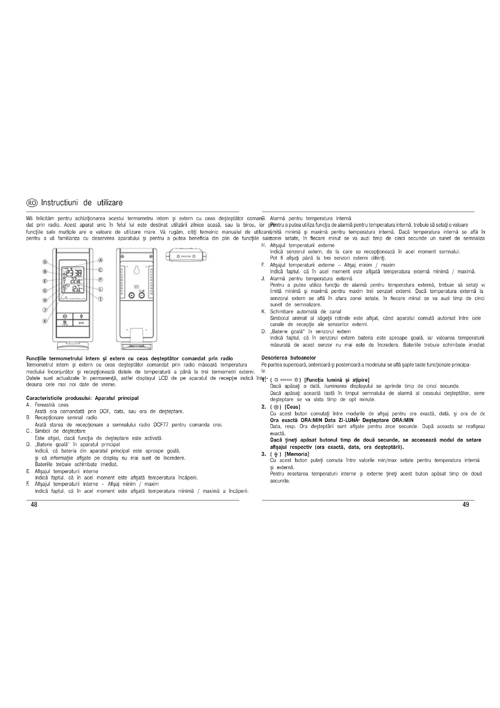 Wă felicităm pentru achiziţionarea acestui termometru intern şi extern cu ceas deşteptător coman- dat prin radio. Acest aparat unic în felul lui este destinat utilizării zilnice acasă, sau la birou, iar prin funcţiile sale multiple are o valoare de utilizare mare. Vă rugăm, citiţi temeinic manualul de utilizare, pentru a vă familiariza cu deservirea aparatului şi pentru a putea benecia din plin de funcţiile sale. Funcţiile termometrului intern şi extern cu ceas deşteptător comandat prin radio Termometrul intern şi extern cu ceas deşteptător comandat prin radio măsoară temperatura mediului înconjurător şi recepţionează datele de temperatură a până la trei termometri externi. Datele sunt actualizate în permanenţă, astfel displayul LCD de pe aparatul de recepţie indică întot- deauna cele mai noi date de vreme. Caracteristicile produsului: Aparatul principal A . Fereastră ceas Arată ora comandată prin DCF, data, sau ora de deşteptare.