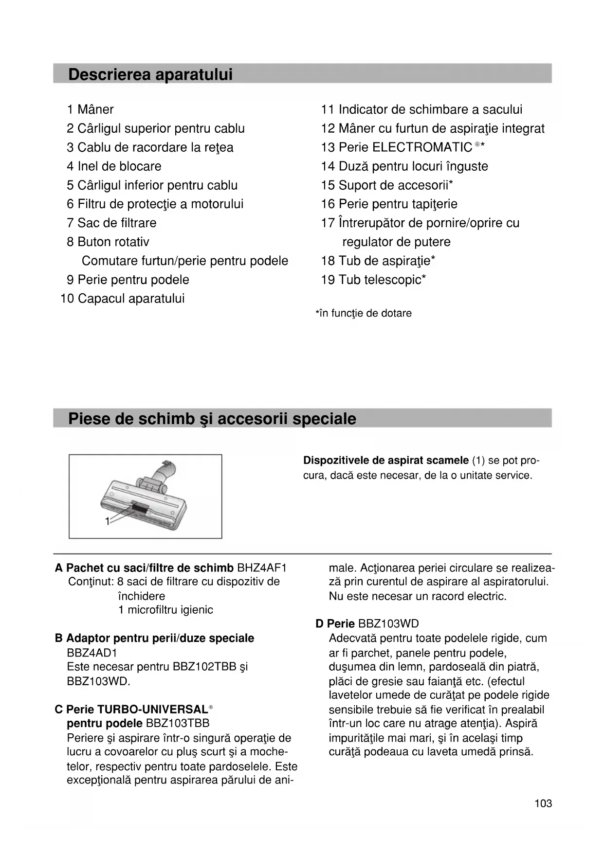 în funcøie de dotare A Pachet cu saci/filtre de schimb BHZ4AF1 Conøinut: 8 saci de filtrare cu dispozitiv de închidere 1 microfiltru igienic B Adaptor pentru perii/duze speciale BBZ4AD1 Este necesar pentru BBZ102TBB µi BBZ103WD. C Perie TURBO-UNIVERSAL