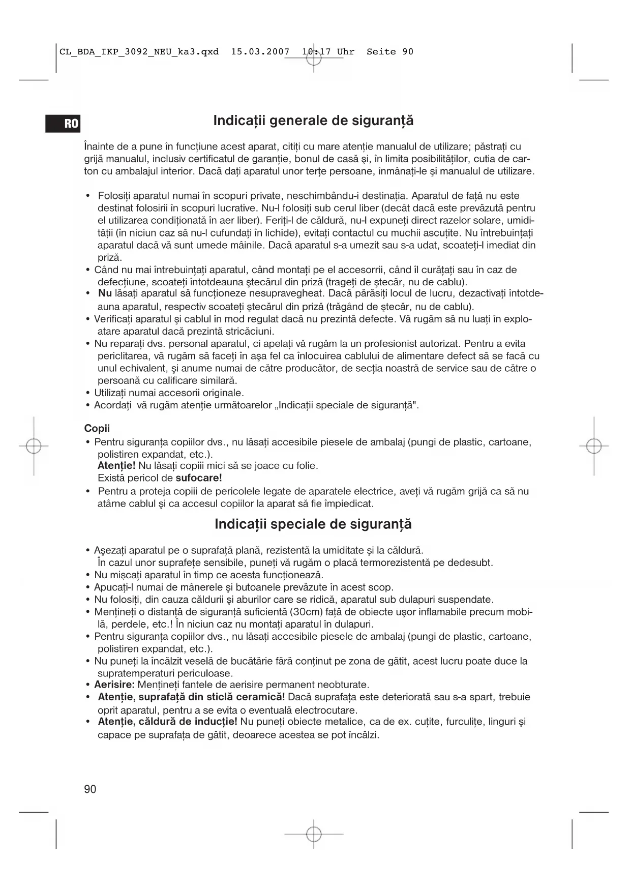 - Atenţie, căldură de inducţie! Nu puneţi obiecte metalice, ca de ex. cuţite, furculiţe, linguri şi capace pe suprafaţa de gătit, deoarece acestea se pot încălzi. CL_BDA_IKP_3092_NEU_ka3.qxd 15.03.2007 10:17 Uhr Seite 9091