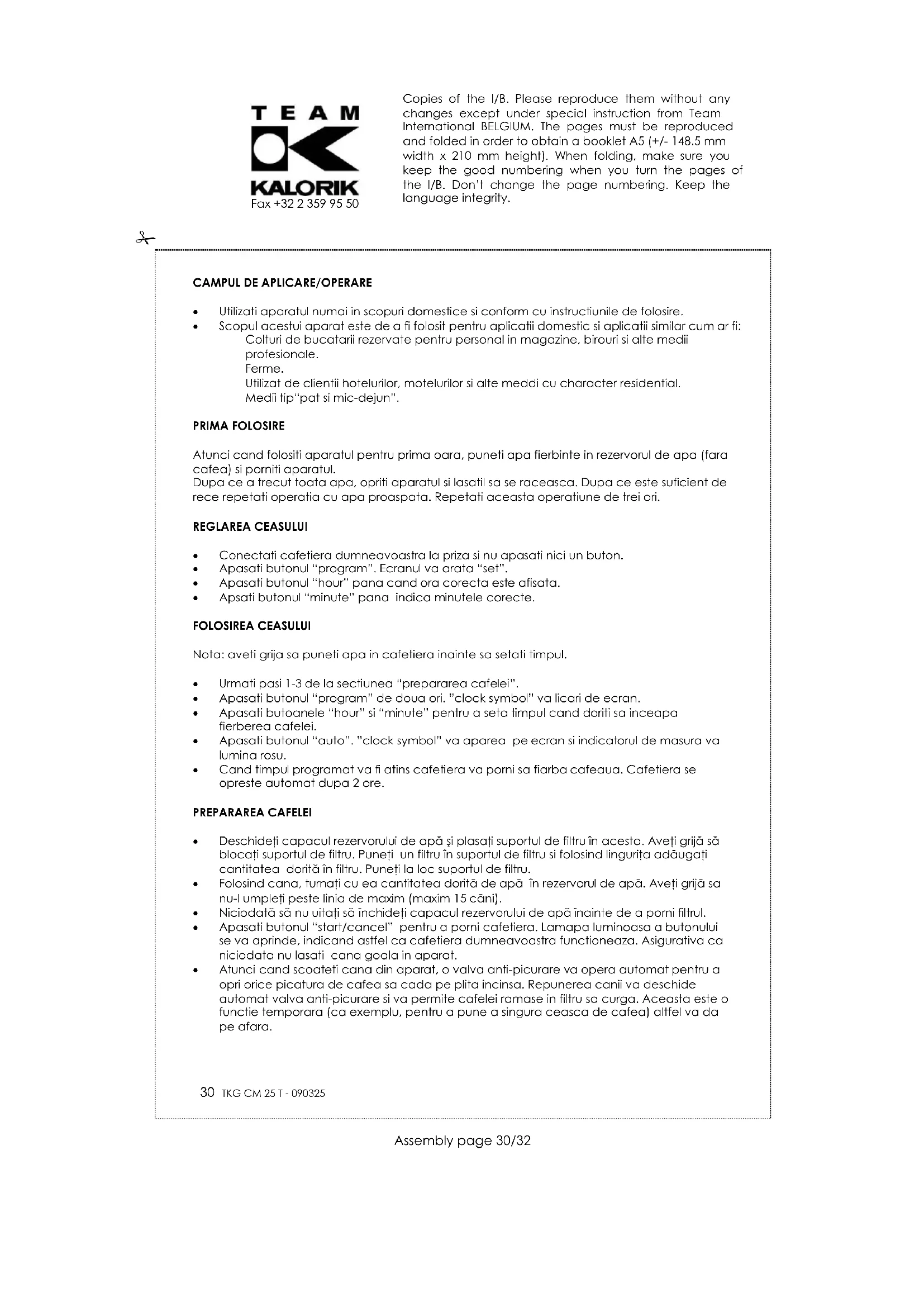 Utilizati aparatul numai in scopuri domestice si conform cu instructiunile de folosire. Scopul acestui aparat este de a fi folosit pentru aplicatii domestic si aplicatii similar cum ar fi: Colturi de bucatarii rezervate pentru personal in magazine, birouri si alte medii profesionale. Ferme. Utilizat de clientii hotelurilor, motelurilor si alte meddi cu character residential. Medii tip“pat si mic-dejun”. PRIMA FOLOSIRE Atunci cand folositi aparatul pentru prima oara, puneti apa fierbinte in rezervorul de apa (fara cafea) si porniti aparatul. Dupa ce a trecut toata apa, opriti aparatul si lasatil sa se raceasca. Dupa ce este suficient de rece repetati operatia cu apa proaspata. Repetati aceasta operatiune de trei ori. REGLAREA CEASULUI Conectati cafetiera dumneavoastra la priza si nu apasati nici un buton. Apasati butonul “program”. Ecranul va arata “set”. Apasati butonul “hour” pana cand ora corecta este afisata. Apsati butonul “minute” pana indica minutele corecte. FOLOSIREA CEASULUI Nota: aveti grija sa puneti apa in cafetiera inainte sa setati timpul. Urmati pasi 1-3 de la sectiunea “prepararea cafelei”. Apasati butonul “program” de doua ori. ”clock symbol” va licari de ecran. Apasati butoanele “hour” si “minute” pentru a seta timpul cand doriti sa inceapa fierberea cafelei. Apasati butonul “auto”. ”clock symbol” va aparea pe ecran si indicatorul de masura va lumina rosu. Cand timpul programat va fi atins cafetiera va porni sa fiarba cafeaua. Cafetiera se opreste automat dupa 2 ore. PREPARAREA CAFELEI Deschideţi capacul rezervorului de apă şi plasaţi suportul de filtru în acesta. Aveţi grijă să blocaţi suportul de filtru. Puneţi un filtru în suportul de filtru si folosind linguriţa adăugaţi cantitatea dorită în filtru. Puneţi la loc suportul de filtru. Folosind cana, turnaţi cu ea cantitatea dorită de apă în rezervorul de apă. Aveţi grijă sa nu-l umpleţi peste linia de maxim (maxim 15 căni). Niciodată să nu uitaţi să închideţi capacul rezervorului de apă înainte de a porni filtrul. Apasati butonul “start/cancel” pentru a porni cafetiera. Lamapa luminoasa a butonului se va aprinde, indicand astfel ca cafetiera dumneavoastra functioneaza. Asigurativa ca niciodata nu lasati cana goala in aparat. Atunci cand scoateti cana din aparat, o valva anti-picurare va opera automat pentru a opri orice picatura de cafea sa cada pe plita incinsa. Repunerea canii va deschide automat valva anti-picurare si va permite cafelei ramase in filtru sa curga. Aceasta este o functie temporara (ca exemplu, pentru a pune a singura ceasca de cafea) altfel va da pe afara. Copies of the I/B. Please reproduce them without any changes except under special instruction from Team International BELGIUM. The pages must be reproduced and folded in order to obtain a booklet A5 (+/- 148.5 mm width x 210 mm height). When folding, make sure you keep the good numbering when you turn the pages of the I/B. Don’t change the page numbering. Keep the language integrity.