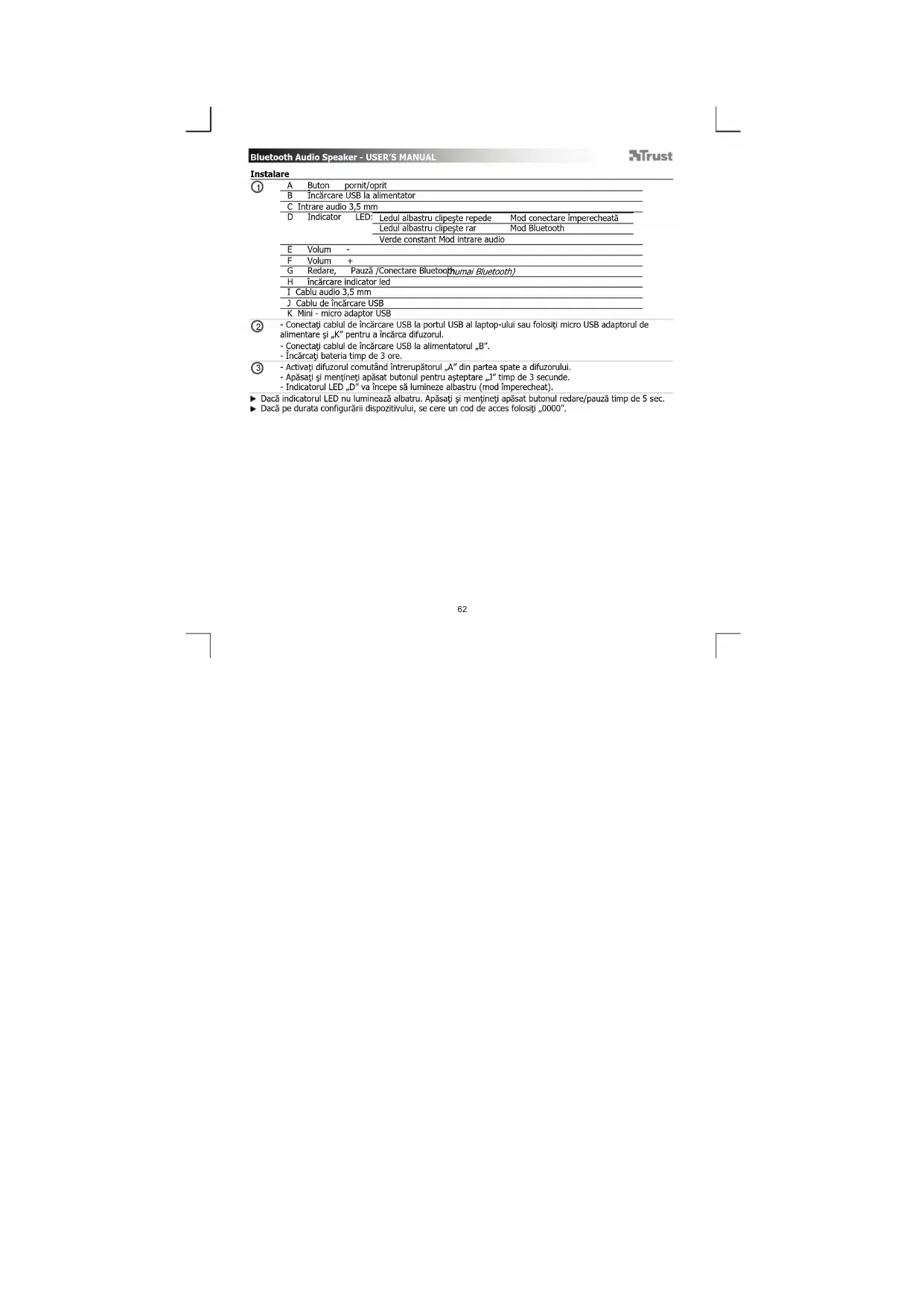 - Conectaţi cablul de încărcare USB la portul USB al laptop-ului sau folosiţi micro USB adaptorul de alimentare şi „K” pentru a încărca difuzorul. - Conectaţi cablul de încărcare USB la alimentatorul „B”. - Încărcaţi bateria timp de 3 ore. - Activaţi difuzorul comutând întrerupătorul „A” din partea spate a difuzorului. - Apăsaţi şi menţineţi apăsat butonul pentru aşteptare „J” timp de 3 secunde. - Indicatorul LED „D” va începe să lumineze albastru (mod împerecheat). Dacă indicatorul LED nu luminează albatru. Apăsaţi şi menţineţi apăsat butonul redare/pauză timp de 5 sec. Dacă pe durata configurării dispozitivului, se cere un cod de acces folosiţi „0000”.