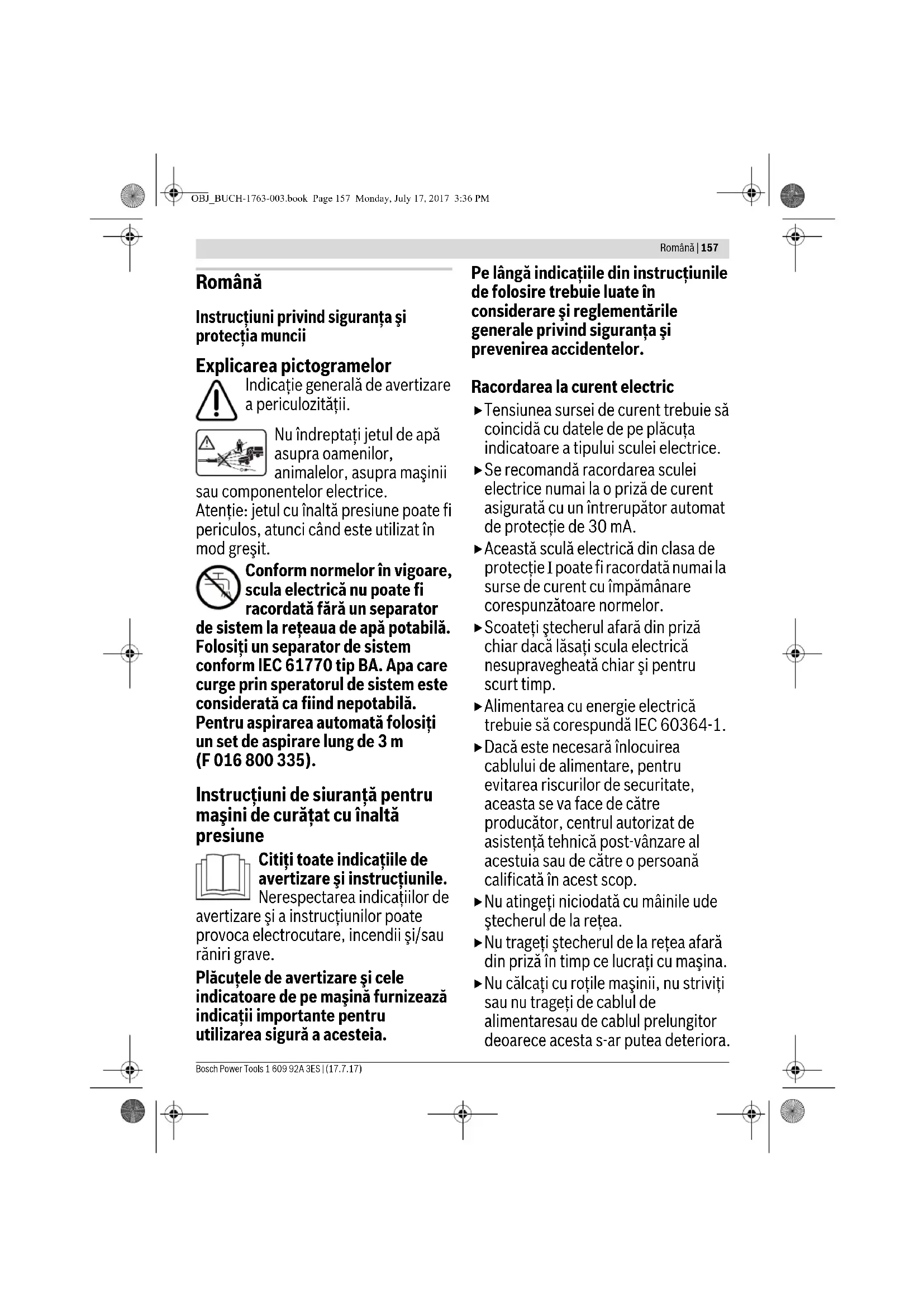Можливі зміни. OBJ_BUCH-1763-003.book Page 156 Monday, July 17, 2017 3:36 PMRomână | 157 Bosch Power Tools 1 609 92A 3ES | (17.7.17) Română Instrucţiuni privind siguranţa şi protecţia muncii Explicarea pictogramelor Indicaţie generală de avertizare a periculozităţii. Nu îndreptaţi jetul de apă asupra oamenilor, animalelor, asupra maşinii sau componentelor electrice. Atenţie: jetul cu înaltă presiune poate fi periculos, atunci când este utilizat în mod greşit. Conform normelor în vigoare, scula electrică nu poate fi racordată fără un separator de sistem la reţeaua de apă potabilă. Folosiţi un separator de sistem conform IEC 61770 tip BA. Apa care curge prin speratorul de sistem este considerată ca fiind nepotabilă. Pentru aspirarea automată folosiţi un set de aspirare lung de 3 m (F 016 800 335). Instrucţiuni de siuranţă pentru maşini de curăţat cu înaltă presiune Citiţi toate indicaţiile de avertizare şi instrucţiunile. Nerespectarea indicaţiilor de avertizare şi a instrucţiunilor poate provoca electrocutare, incendii şi/sau răniri grave. Plăcuţele de avertizare şi cele indicatoare de pe maşină furnizează indicaţii importante pentru utilizarea sigură a acesteia. Pe lângă indicaţiile din instrucţiunile de folosire trebuie luate în considerare şi reglementările generale privind siguranţa şi prevenirea accidentelor. Racordarea la curent electric Tensiunea sursei de curent trebuie să coincidă cu datele de pe plăcuţa indicatoare a tipului sculei electrice. Se recomandă racordarea sculei electrice numai la o priză de curent asigurată cu un întrerupător automat de protecţie de 30 mA. Această sculă electrică din clasa de protecţie I poate fi racordată numai la surse de curent cu împămânare corespunzătoare normelor. Scoateţi ştecherul afară din priză chiar dacă lăsaţi scula electrică nesupravegheată chiar şi pentru scurt timp. Alimentarea cu energie electrică trebuie să corespundă IEC 60364-1. Dacă este necesară înlocuirea cablului de alimentare, pentru evitarea riscurilor de securitate, aceasta se va face de către producător, centrul autorizat de asistenţă tehnică post-vânzare al acestuia sau de către o persoană calificată în acest scop. Nu atingeţi niciodată cu mâinile ude ştecherul de la reţea. Nu trageţi ştecherul de la reţea afară din priză în timp ce lucraţi cu maşina. Nu călcaţi cu roţile maşinii, nu striviţi sau nu trageţi de cablul de alimentaresau de cablul prelungitor deoarece acesta s-ar putea deteriora. OBJ_BUCH-1763-003.book Page 157 Monday, July 17, 2017 3:36 PM158 | Română 1 609 92A 3ES | (17.7.17) Bosch Power Tools Feriţi cablulu de căldură, ulei şi muchii ascuţite. Nu mai continuaţi să folosiţi scula electrică în cazul în care cablul de alimentare sau componente importante precum furtunul de înaltă presiune, pistolul de stropit sau echipamentele de siguranţă sunt deteriorate. Atenţie: Cablurile prelungitoare neconforme normelor pot fi periculoase. În cazul utilizării unui cablu prelungitor. ştecherul şi cupla trebuie să fie impermeabile la apă. Cablul prelungitor trebuie să aibă secţiunea specificată în instrucţiunile de folosire şi să fie protejat împotriva stropilor de apă. Conectorul nu trebuie să se afle în apă. În caz de înlocuire, cablurile de alimentare sau cele prelungitoare noi trebuie să fie deasemeni protejate împotriva stropilor de apă şi să prezinte aceeaşi stabilitate mecanică, ca a celor vechi. Racordare la sursa de alimentare cu apă Respectaţi prescripţiile regiei furnizoare de apă. Îmbinarea prin înşurubare a furtunurilor de racordare trebuie să fie etanşă. Scula electrică nu trebuie racordată în niciun caz la sursa de alimentare cu apă potabilă fără supapă de siguranţă pentru suprapresiune. Apa care s-a scurs prin supapa de siguranţă pentru suprapresiune nu mai este potabilă. Furtunul de înaltă presiune nu trebuie să fie deteriorat (pericol de explozie). Un furtun de înaltă presiune deteriorat trebuie schimbat neîntârziat. În acest scop se vor folosi numai furtunuri şi racorduri recomandate de producător. Furtunurile de înaltă presiune, armăturile şi cuplajele sunt importante pentru siguranţa maşinii. Folosiţi numai furtunuri, armături şi cuplaje recomandate de producător. Pentru alimentare se va folosi numai apă curată sau filtrată. Utilizare Înainte de utilizare, maşina şi accesoriile trebuie controlate cu privire la starea lor corespunzătoare şi la siguranţa de funcţionare. În cazul în care starea acestora nu este impecabilă, nu este permisă utilizarea lor. Nu îndreptaţi jetul de apă asupra dumneavoastră sau asupra altor persoane, pentru curăţarea îmbrăcăminţii sau a încălţămintei. Nu este permisă aspirarea de lichide care conţin solvenţi, de acizi nediluaţi, de acetonă sau solvenţi inclusiv benzină, de diluanţi pentru vopsele şi de păcură, deoarece dispersiile de pulverizare ale acestora sunt foarte inflamabile, explozibile şi toxice. În cazul utilizării maşinilor în zone periculoase (de ex. staţii de benzină) trebuie respectate aceleaşi OBJ_BUCH-1763-003.book Page 158 Monday, July 17, 2017 3:36 PMRomână | 159 Bosch Power Tools 1 609 92A 3ES | (17.7.17) prescripţii privind siguranţa. Este interzisă exploatarea în spaţii cu pericol de explozie. Maşina trebuie aşezată pe o suprafaţă stabilă. În cazul utilizării în spaţii închise aveţi grijă să aerisiţi corespunzător. Asiguraţi-vă că vehiculele sunt oprite (motorul oprit) în timpul curăţării lor. Pentru manevrarea maşinii de curăţat cu înaltă presiune sunt necesare ambele mâini. De aceea, nu lucraţi fiind suiţi pe o scară. Atunci când lucraţi pe balcoane sau pe alte suprafeţe proeminente, asiguraţi-vă că vedeţi în orice moment toate marginile acestora. Folosiţi numai detergenţii recoman