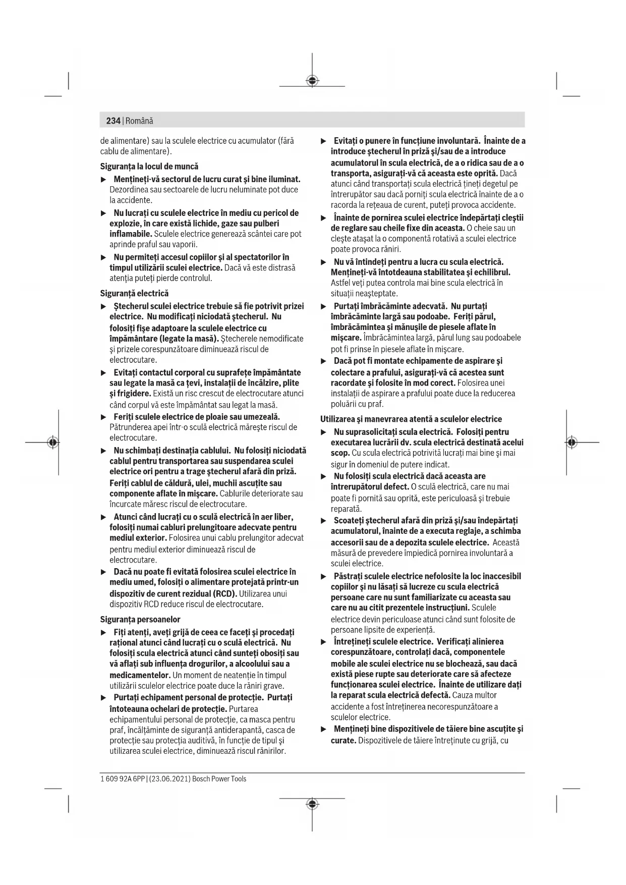 – электр құралына артық жүктеме түскеннен орын алған ақаулар. (Құралға артық жүктеме түсудің шартсыз белгілеріне мыналар жатады: құбылу түсінің пайда болуы немесе электр құралы бөліктері мен түйіндерінің деформациясы немесе қорытылуы, жоғары температура әсерінен электр қозғалтқышындағы сымдар оқшаулағышының қараюы немесе көмірленуі.) Кәдеге жарату Электр құралдар, жабдықтар және бумаларын айналаны қорғайтын кәдеге жаратуға апару қажет. Электр құралдарды үй қоқысына тастамаңыз! Тек қана ЕО елдері үшін: Электр және электрондық ескі құралдар бойынша Еуропа 2012/19/EU ережесі және ұлттық заңдарға сайкес пайдалануға жарамсыз электр құралдары бөлек жиналып, кәдеге жаратылуы қажет. Română Instrucţiuni de siguranţă Indicaţii generale de avertizare pentru scule electrice AVERTIS- MENT Citiţi toate indicaţiile de avertizare şi instrucţiunile. Nerespectarea indicaţiilor de avertizare şi a instrucţiunilor poate provoca electrocutare, incendii şi/sau răniri grave. Păstraţi toate indicaţiile de avertizare şi instrucţiunile în vederea utilizărilor viitoare. Termenul "sculă electrică" folosit în indicaţiile de avertizare se referă la sculele electrice alimentate de la reţea (cu cablu Bosch Power Tools 1 609 92A 6PP | (23.06.2021)234 | Română de alimentare) sau la sculele electrice cu acumulator (fără cablu de alimentare). Siguranţa la locul de muncă u Menţineţi‑vă sectorul de lucru curat şi bine iluminat. Dezordinea sau sectoarele de lucru neluminate pot duce la accidente. u Nu lucraţi cu sculele electrice în mediu cu pericol de explozie, în care există lichide, gaze sau pulberi inflamabile. Sculele electrice generează scântei care pot aprinde praful sau vaporii. u Nu permiteţi accesul copiilor şi al spectatorilor în timpul utilizării sculei electrice. Dacă vă este distrasă atenţia puteţi pierde controlul. Siguranţă electrică u Ştecherul sculei electrice trebuie să fie potrivit prizei electrice. Nu modificaţi niciodată ştecherul. Nu folosiţi fişe adaptoare la sculele electrice cu împământare (legate la masă). Ştecherele nemodificate şi prizele corespunzătoare diminuează riscul de electrocutare. u Evitaţi contactul corporal cu suprafeţe împământate sau legate la masă ca ţevi, instalaţii de încălzire, plite şi frigidere. Există un risc crescut de electrocutare atunci când corpul vă este împământat sau legat la masă. u Feriţi sculele electrice de ploaie sau umezeală. Pătrunderea apei într‑o sculă electrică măreşte riscul de electrocutare. u Nu schimbaţi destinaţia cablului. Nu folosiţi niciodată cablul pentru transportarea sau suspendarea sculei electrice ori pentru a trage ştecherul afară din priză. Feriţi cablul de căldură, ulei, muchii ascuţite sau componente aflate în mişcare. Cablurile deteriorate sau încurcate măresc riscul de electrocutare. u Atunci când lucraţi cu o sculă electrică în aer liber, folosiţi numai cabluri prelungitoare adecvate pentru mediul exterior. Folosirea unui cablu prelungitor adecvat pentru mediul exterior diminuează riscul de electrocutare. u Dacă nu poate fi evitată folosirea sculei electrice în mediu umed, folosiţi o alimentare protejată printr-un dispozitiv de curent rezidual (RCD). Utilizarea unui dispozitiv RCD reduce riscul de electrocutare. Siguranţa persoanelor u Fiţi atenţi, aveţi grijă de ceea ce faceţi şi procedaţi raţional atunci când lucraţi cu o sculă electrică. Nu folosiţi scula electrică atunci când sunteţi obosiţi sau vă aflaţi sub influenţa drogurilor, a alcoolului sau a medicamentelor. Un moment de neatenţie în timpul utilizării sculelor electrice poate duce la răniri grave. u Purtaţi echipament personal de protecţie. Purtaţi întoteauna ochelari de protecţie. Purtarea echipamentului personal de protecţie, ca masca pentru praf, încălţăminte de siguranţă antiderapantă, casca de protecţie sau protecţia auditivă, în funcţie de tipul şi utilizarea sculei electrice, diminuează riscul rănirilor. u Evitaţi o punere în funcţiune involuntară. Înainte de a introduce ştecherul în priză şi/sau de a introduce acumulatorul în scula electrică, de a o ridica sau de a o transporta, asiguraţi‑vă că aceasta este oprită. Dacă atunci când transportaţi scula electrică ţineţi degetul pe întrerupător sau dacă porniţi scula electrică înainte de a o racorda la reţeaua de curent, puteţi provoca accidente. u Înainte de pornirea sculei electrice îndepărtaţi cleştii de reglare sau cheile fixe din aceasta. O cheie sau un cleşte ataşat la o componentă rotativă a sculei electrice poate provoca răniri. u Nu vă întindeţi pentru a lucra cu scula electrică. Menţineţi-vă întotdeauna stabilitatea şi echilibrul. Astfel veţi putea controla mai bine scula electrică în situaţii neaşteptate. u Purtaţi îmbrăcăminte adecvată. Nu purtaţi îmbrăcăminte largă sau podoabe. Feriţi părul, îmbrăcămintea şi mănuşile de piesele aflate în mişcare. Îmbrăcămintea largă, părul lung sau podoabele pot fi prinse în piesele aflate în mişcare. u Dacă pot fi montate echipamente de aspirare şi colectare a prafului, asiguraţi‑vă că acestea sunt racordate şi folosite în mod corect. Folosirea unei instalaţii de aspirare a prafului poate duce la reducerea poluării cu praf. Utilizarea şi manevrarea 