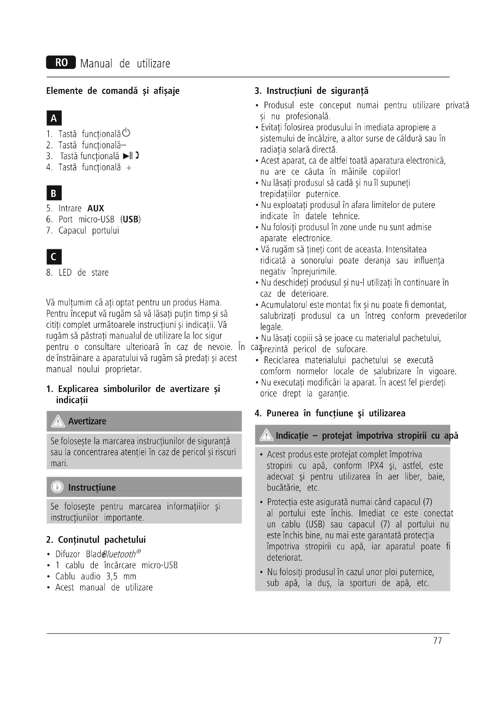 - Nu folosiți produsul în cazul unor ploi puternice, sub apă, la duș, la sporturi de apă, etc. M Manual de utilizare78