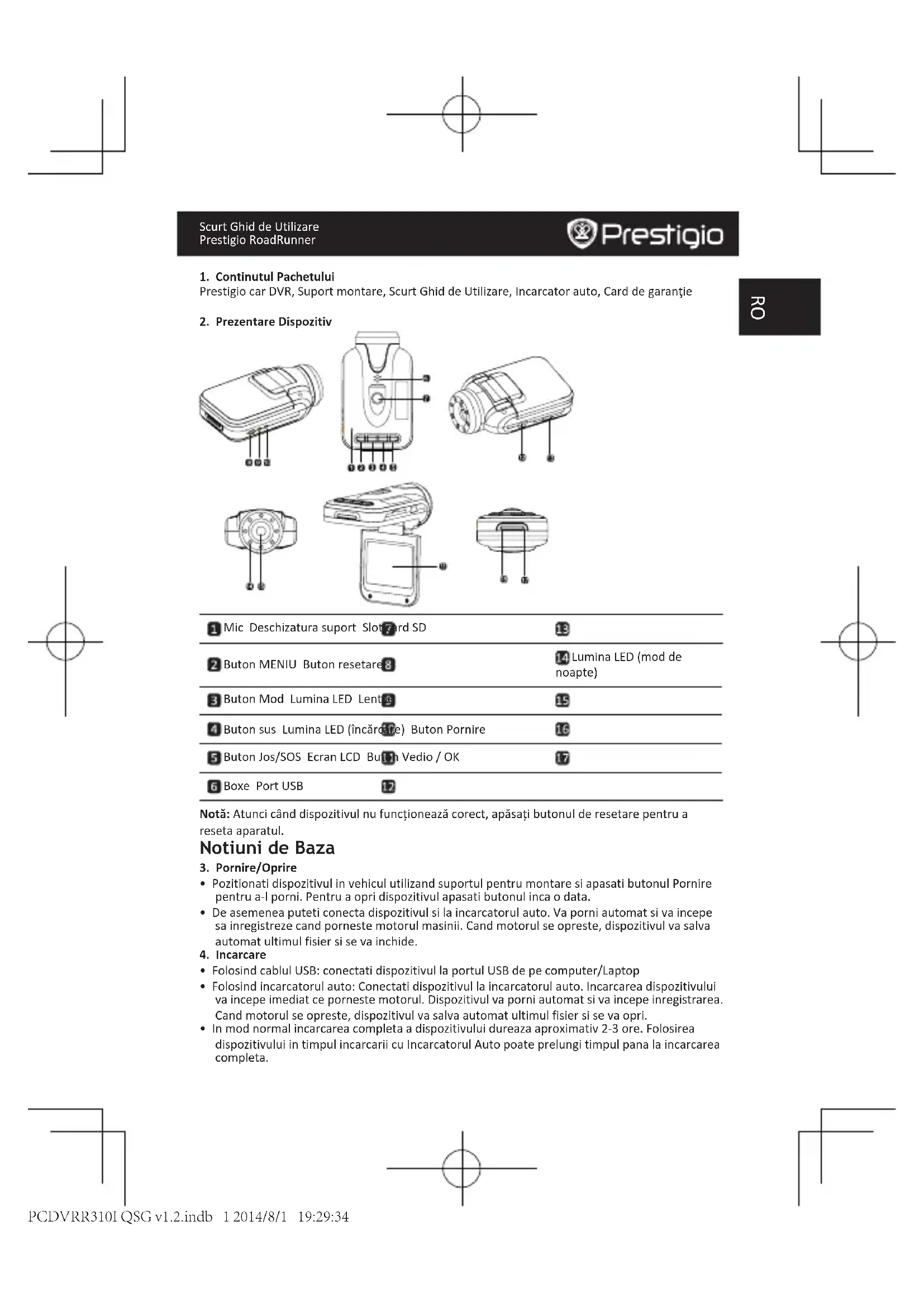 Mic Deschizatura suport Slot card SD Buton MENIU Buton resetare Lumina LED (mod de noapte) Buton Mod Lumina LED Lentile Buton sus Lumina LED (încărcare) Buton Pornire Buton Jos/SOS Ecran LCD Buton Vedio / OK Boxe Port USB Notă: Atunci când dispozitivul nu funcționează corect, apăsați butonul de resetare pentru a reseta aparatul. Notiuni de Baza
