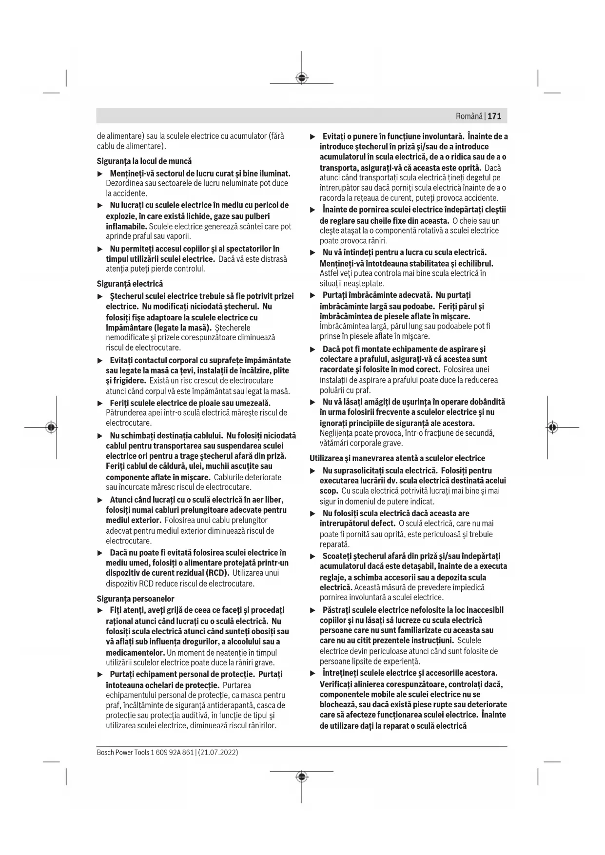 Ұсынылған литий-иондық аккумуляторлар қауіпті тауарларға қойылатын талаптарға бағынады. Пайдаланушы аккумуляторларды көшеде қосымша құжаттарсыз тасымалдай алады. Үшінші тұлғалар (мысалы, әуе көлігі немесе жіберу) орамаға және маркаларға қойылатын арнайы талаптарды сақтау керек. Жіберуге дайындау кезінде қауіпті жүктерді тасымалдау маманымен хабарласу керек. Аккумуляторды корпусы зақымдалған болса ғана жіберіңіз. Ашық түйіспелерді желімдеңіз және аккумуляторды орамада қозғалмайтындай ораңыз. Қажет болса, қосымша ұлттық ережелерді сақтаңыз. Кәдеге жарату Электр құралдарды, аккумуляторларды, керек-жарақтарды және орау материалдарын экологиялық тұрғыдан дұрыс утилизациялауға тапсыру керек. Электр құралдарды және аккумуляторларды/батареяларды үй қоқысына тастамаңыз! Тек қана ЕО елдері үшін: Ескі электрлік және электрондық құрылғылар туралы 2012/19/EU еуропалық директивасы және оның ұлттық заңнамада қолданылуы бойынша пайдалануға бұдан былай жарамсыз электрлік құралдарды және 2006/66/ ЕC еуропалық директивасы бойынша зақымдалған немесе ескірген аккумуляторларды/батареяларды бөлек жинап, қоршаған орта үшін қауіпсіз жолмен қайта өңдеуге жіберу қажет. Қате жолмен кәдеге жаратылған ескі электрлік және электрондық құрылғылар қауіпті заттардың болу мүмкіндігіне байланысты қоршаған ортаға және адам денсаулығына зиянды әсер тигізуі мүмкін. Аккумуляторлар/батареялар: Литий-иондық: Тасымалдау бөліміндегі нұсқауларды орындаңыз (қараңыз „Тасымалдау“, Бет170). Română Instrucţiuni de siguranţă Instrucţiuni generale de siguranţă pentru scule electrice AVERTIS- MENT Citiţi toate avertizările, instrucţiunile, ilustraţiile şi specificaţiile puse la dispoziţie împreună cu această sculă electrică. Nerespectarea instrucţiunilor menţionate mai jos poate duce la electrocutare, incendiu şi/sau vătămări corporale grave. Păstraţi toate indicaţiile de avertizare şi instrucţiunile în vederea utilizărilor viitoare. Termenul "sculă electrică" folosit în indicaţiile de avertizare se referă la sculele electrice alimentate de la reţea (cu cablu 1 609 92A 861 | (21.07.2022) Bosch Power ToolsRomână | 171 de alimentare) sau la sculele electrice cu acumulator (fără cablu de alimentare). Siguranţa la locul de muncă u Menţineţi‑vă sectorul de lucru curat şi bine iluminat. Dezordinea sau sectoarele de lucru neluminate pot duce la accidente. u Nu lucraţi cu sculele electrice în mediu cu pericol de explozie, în care există lichide, gaze sau pulberi inflamabile. Sculele electrice generează scântei care pot aprinde praful sau vaporii. u Nu permiteţi accesul copiilor şi al spectatorilor în timpul utilizării sculei electrice. Dacă vă este distrasă atenţia puteţi pierde controlul. Siguranţă electrică u Ştecherul sculei electrice trebuie să fie potrivit prizei electrice. Nu modificaţi niciodată ştecherul. Nu folosiţi fişe adaptoare la sculele electrice cu împământare (legate la masă). Ştecherele nemodificate şi prizele corespunzătoare diminuează riscul de electrocutare. u Evitaţi contactul corporal cu suprafeţe împământate sau legate la masă ca ţevi, instalaţii de încălzire, plite şi frigidere. Există un risc crescut de electrocutare atunci când corpul vă este împământat sau legat la masă. u Feriţi sculele electrice de ploaie sau umezeală. Pătrunderea apei într‑o sculă electrică măreşte riscul de electrocutare. u Nu schimbaţi destinaţia cablului. Nu folosiţi niciodată cablul pentru transportarea sau suspendarea sculei electrice ori pentru a trage ştecherul afară din priză. Feriţi cablul de căldură, ulei, muchii ascuţite sau componente aflate în mişcare. Cablurile deteriorate sau încurcate măresc riscul de electrocutare. u Atunci când lucraţi cu o sculă electrică în aer liber, folosiţi numai cabluri prelungitoare adecvate pentru mediul exterior. Folosirea unui cablu prelungitor adecvat pentru mediul exterior diminuează riscul de electrocutare. u Dacă nu poate fi evitată folosirea sculei electrice în mediu umed, folosiţi o alimentare protejată printr-un dispozitiv de curent rezidual (RCD). Utilizarea unui dispozitiv RCD reduce riscul de electrocutare. Siguranţa persoanelor u Fiţi atenţi, aveţi grijă de ceea ce faceţi şi procedaţi raţional atunci când lucraţi cu o sculă electrică. Nu folosiţi scula electrică atunci când sunteţi obosiţi sau vă aflaţi sub influenţa drogurilor, a alcoolului sau a medicamentelor. Un moment de neatenţie în timpul utilizării sculelor electrice poate duce la răniri grave. u Purtaţi echipament personal de protecţie. Purtaţi întoteauna ochelari de protecţie. Purtarea echipamentului personal de protecţie, ca masca pentru p