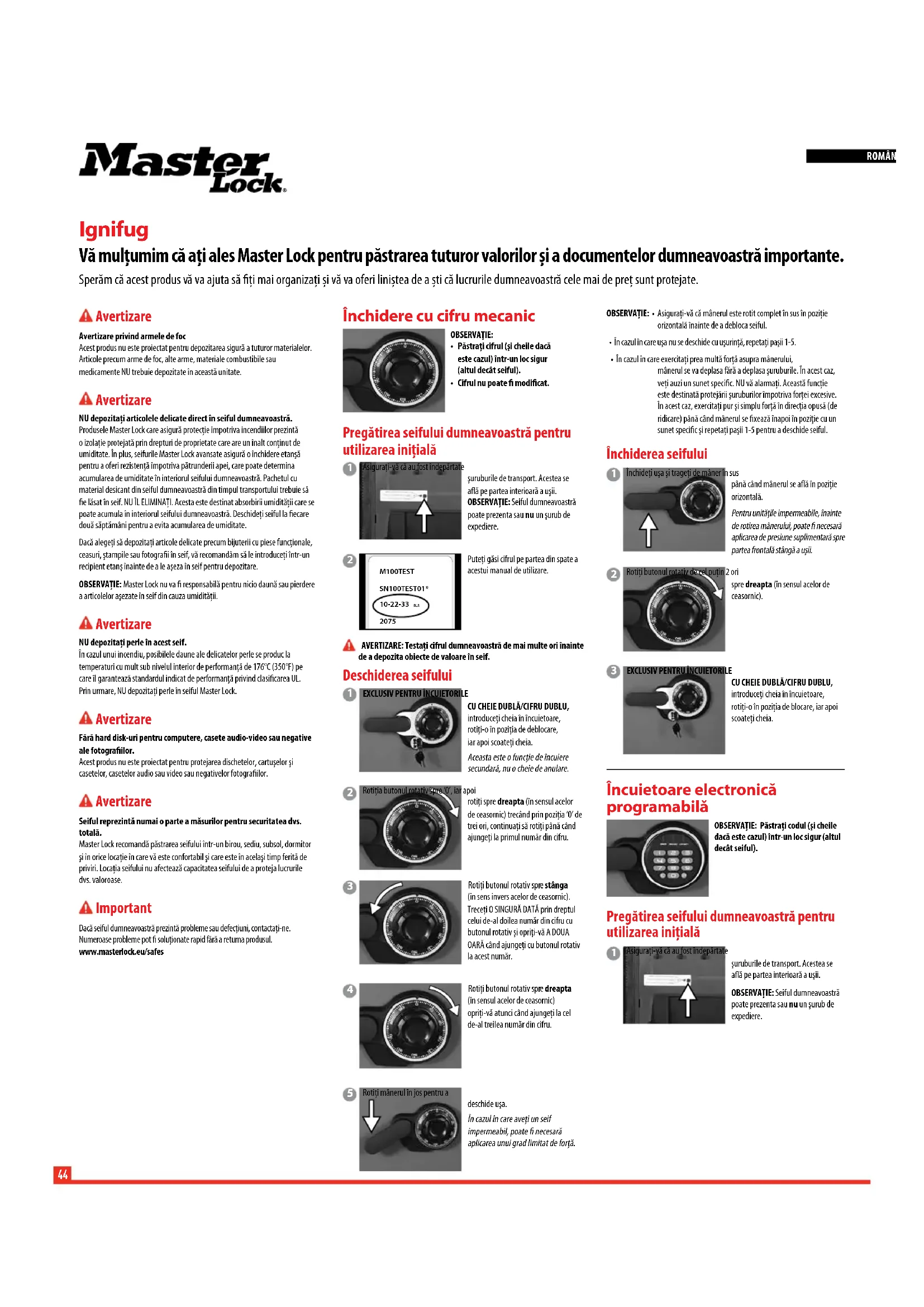 Vâ mulṭumim āa Āi ales Master Lock pentru păstrarea tuturor valorilor Şi a documentelor dumneavoastră importante.