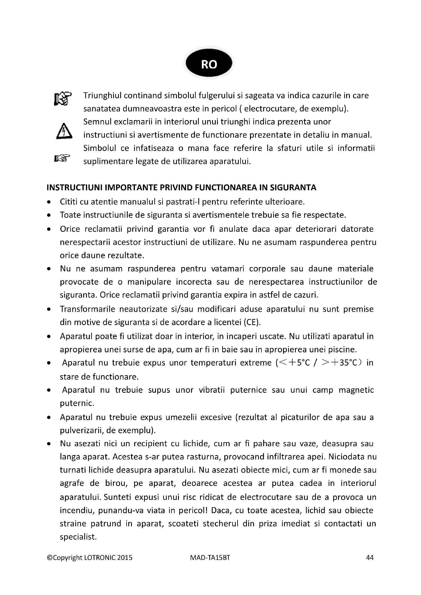 Simbolul alăturat indică faptul că deșeurile de echipamente electrice și electronice nu se reciclează împreună cu deșeurile menajere. Pentru a preveni un posibil pericol față de mediul inconjurător sau față de sănătatea dumneavoastră din cauza reciclarii necontrolate a deșeurilor, vă rugăm să separați acest produs de alte tipuri de deșeuri și să-l reciclați în mod responsabil. Reciclarea controlată a aparatelor de uz casnic joacă un rol vital în refolosirea, recuperarea și reciclarea echipamentelor electrice și electronice.©Copyright LOTRONIC 2015 MAD-TA15BT 52
