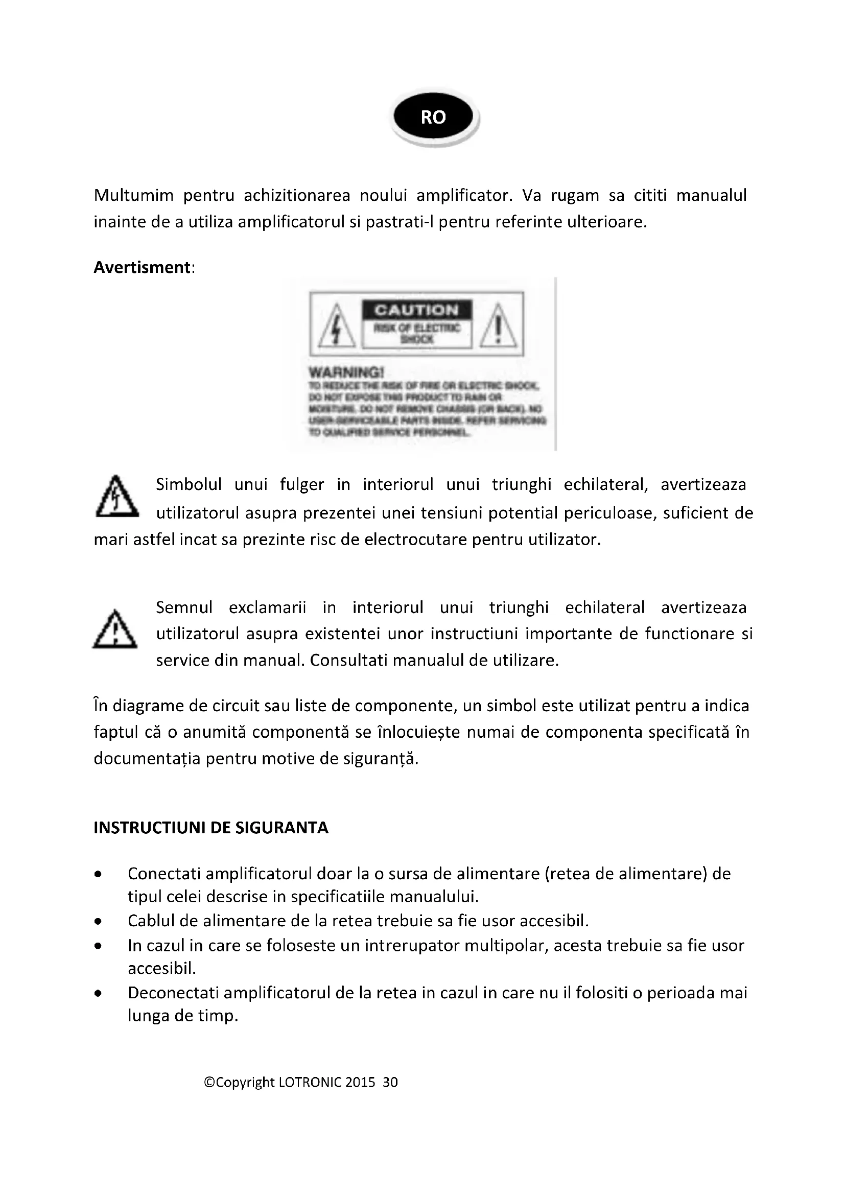 Multumim pentru achizitionarea noului amplificator. Va rugam sa cititi manualul inainte de a utiliza amplificatorul si pastrati-l pentru referinte ulterioare. Avertisment:
