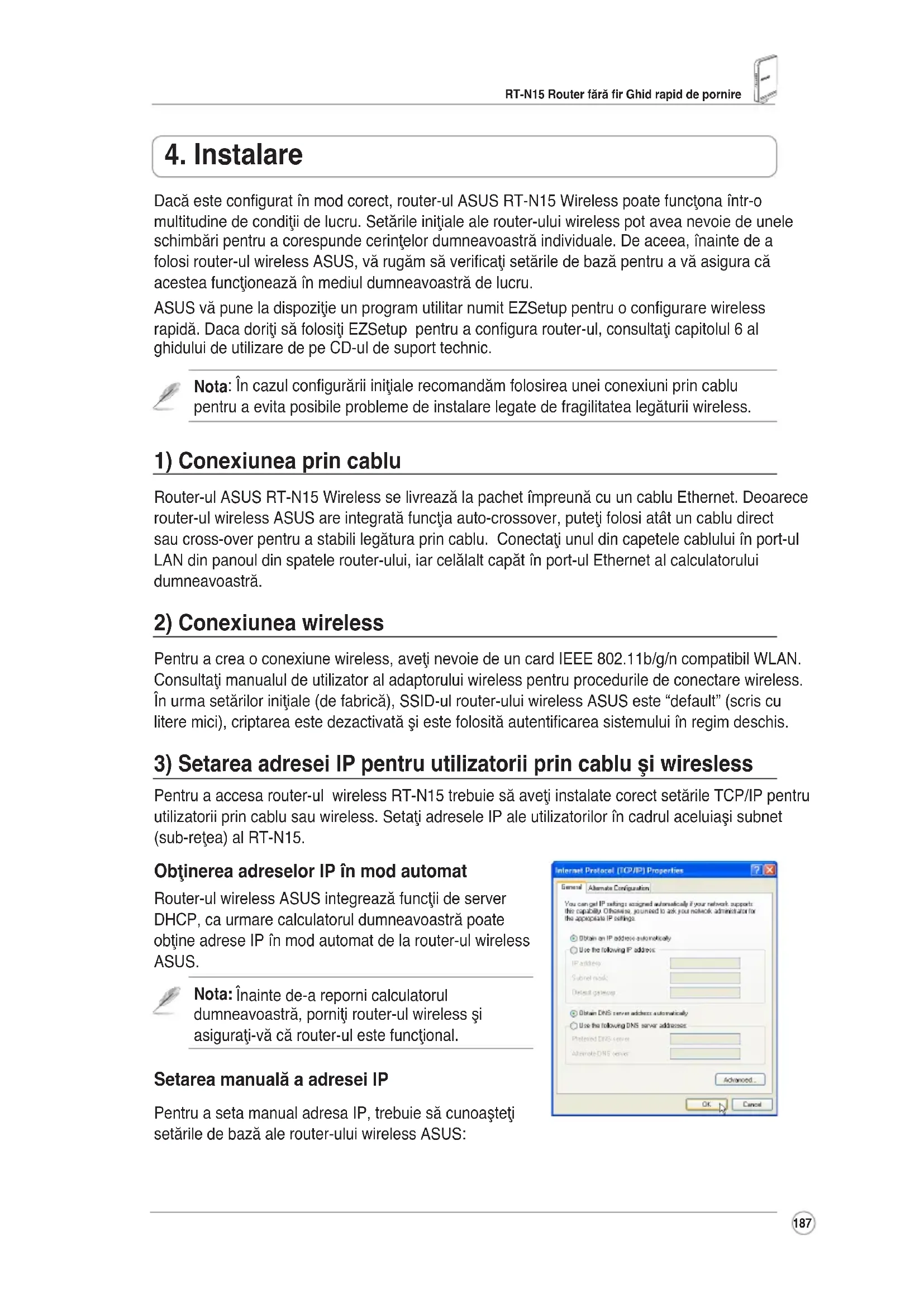 Pentruaaccesarouter-ulwirelessRT-N15trebuiesăaveţiinstalatecorectsetărileTCP/IPpentru utilizatoriiprincablusauwireless.SetaţiadreseleIPaleutilizatorilorîncadrulaceluiaşisubnet (sub-reţea)alRT-N15. Obţinerea adreselor IP în mod automat Router-ulwirelessASUSintegreazăfuncţiideserver DHCP,caurmarecalculatoruldumneavoastrăpoate obţineadreseIPînmodautomatdelarouter-ulwireless ASUS. Nota: Înaintede-arepornicalculatorul dumneavoastră,porniţirouter-ulwirelessşi asiguraţi-văcărouter-ulestefuncţional. Setarea manuală a adresei IP PentruasetamanualadresaIP,trebuiesăcunoaşteţi setăriledebazăalerouter-uluiwirelessASUS: