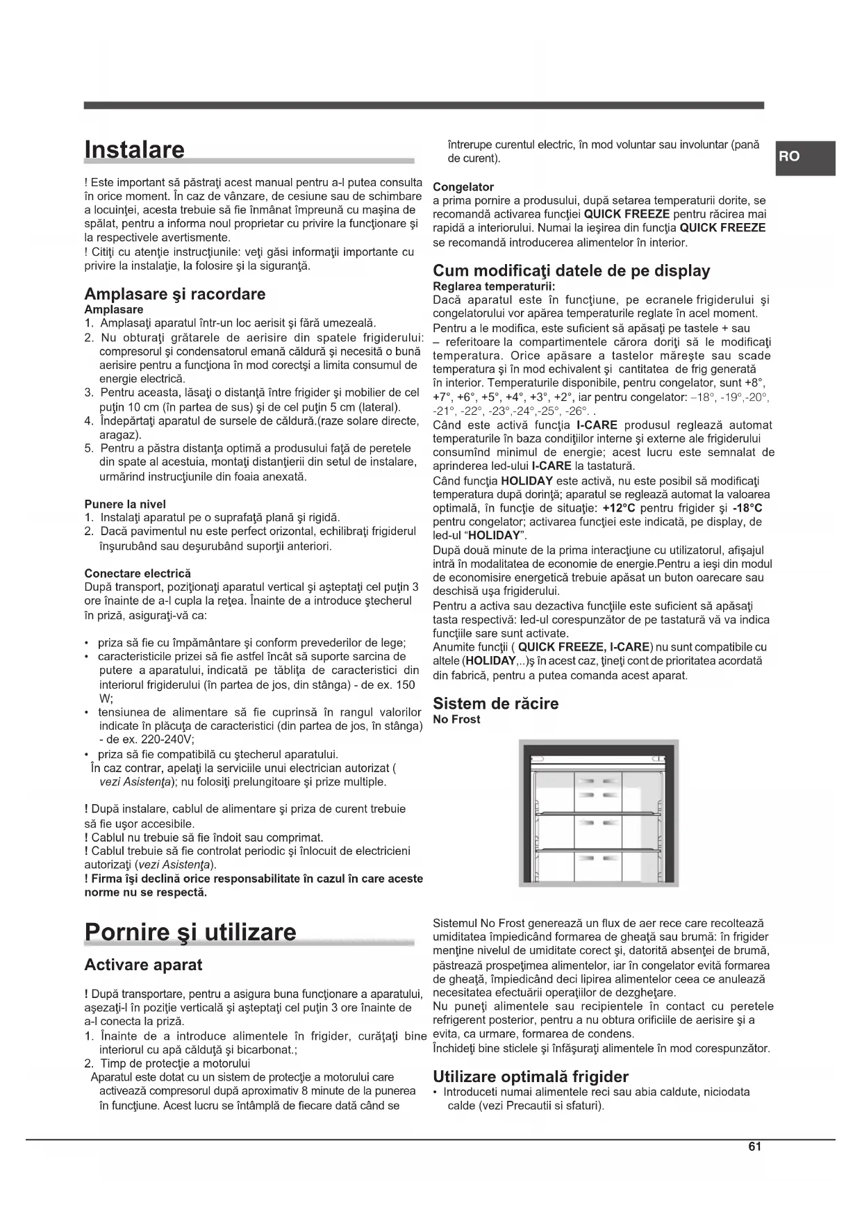 Aparatul este dotat cu un sistem de protecţie a motorului care activează compresorul după aproximativ 8 minute de la punerea în funcţiune. Acest lucru se întâmplă de ecare dată când se întrerupe curentul electric, în mod voluntar sau involuntar (pană de curent). Congelator a prima pornire a produsului, după setarea temperaturii dorite, se recomandă activarea funcţiei QUICK FREEZE pentru răcirea mai rapidă a interiorului. Numai la ieşirea din funcţia QUICK FREEZE se recomandă introducerea alimentelor în interior. Cum modicaţi datele de pe display Reglarea temperaturii: Dacă aparatul este în funcţiune, pe ecranele frigiderului şi congelatorului vor apărea temperaturile reglate în acel moment. Pentru a le modica, este sucient să apăsaţi pe tastele + sau – referitoare la compartimentele cărora doriţi să le modicaţi temperatura. Orice apăsare a tastelor măreşte sau scade temperatura şi în mod echivalent şi cantitatea de frig generată în interior. Temperaturile disponibile, pentru congelator, sunt +8°, +7°, +6°, +5°, +4°, +3°, +2°, iar pentru congelator: –18°,-19°,-20°, -21°,-22°,-23°,-24°,-25°,-26°.. Când este activă funcţia I-CARE produsul reglează automat temperaturile în baza condiţiilor interne şi externe ale frigiderului consumînd minimul de energie; acest lucru este semnalat de aprinderea led-ului I-CARE la tastatură. Când funcţia HOLIDAY este activă, nu este posibil să modicaţi temperatura după dorinţă; aparatul se reglează automat la valoarea optimală, în funcţie de situaţie: +12°C pentru frigider şi -18°C pentru congelator; activarea funcţiei este indicată, pe display, de led-ul “HOLIDAY”. După două minute de la prima interacţiune cu utilizatorul, aşajul intră în modalitatea de economie de energie.Pentru a ieşi din modul de economisire energetică trebuie apăsat un buton oarecare sau deschisă uşa frigiderului. Pentru a activa sau dezactiva funcţiile este sucient să apăsaţi tasta respectivă: led-ul corespunzător de pe tastatură vă va indica funcţiile sare sunt activate. Anumite funcţii ( QUICK FREEZE, I-CARE) nu sunt compatibile cu altele (HOLIDAY,..)ş în acest caz, ţineţi cont de prioritatea acordată din fabrică, pentru a putea comanda acest aparat. Sistem de răcire No Frost Sistemul No Frost generează un ux de aer rece care recoltează umiditatea împiedicând formarea de gheaţă sau brumă: în frigider menţine nivelul de umiditate corect şi, datorită absenţei de brumă, păstrează prospeţimea alimentelor, iar în congelator evită formarea de gheaţă, împiedicând deci lipirea alimentelor ceea ce anulează necesitatea efectuării operaţiilor de dezgheţare. Nu puneţi alimentele sau recipientele în contact cu peretele refrigerent posterior, pentru a nu obtura oriciile de aerisire şi a evita, ca urmare, formarea de condens. Închideţi bine sticlele şi înfăşuraţi alimentele în mod corespunzător. Utilizare optimală frigider