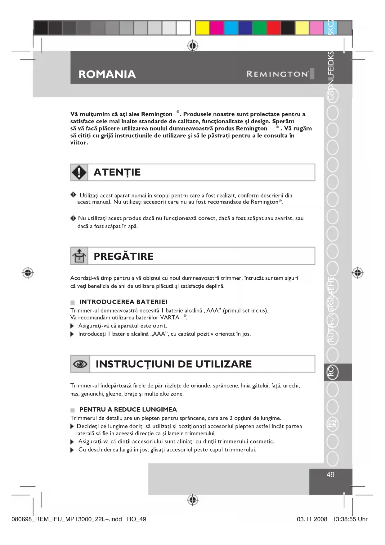 Produsul este alimentat de către o baterie alcalină. Nu aruncaţi aparatul de ras odată cu celelalte resturi menajere la sfârşitul duratei sale de viaţă. Înlăturarea acestuia poate fi făcută la un centru de colectare corespunzător. ATENŢIE: Nu aruncaţi în foc şi nu distrugeţi bateriile, întrucât acestea pot exploda sau elibera substanţe toxice. Pentru mai multe informaţii despre reciclare puteţi vizita www.remington-europe.com 080698_REM_IFU_MPT3000_22L+.indd RO_50080698_REM_IFU_MPT3000_22L+.indd RO_50 03.11.2008 13:38:55 Uhr03.11.2008 13:38:55 UhrROMANIA