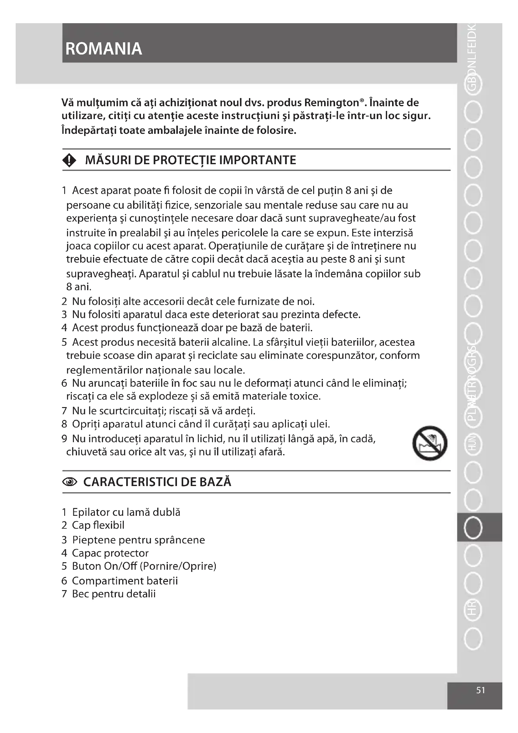 Vă mulţumim că aţi achiziţionat noul dvs. produs Remington®. Înainte de utilizare, citiţi cu atenţie aceste instrucţiuni şi păstraţi-le într-un loc sigur. Îndepărtaţi toate ambalajele înainte de folosire. F MĂSURI DE PROTECŢIE IMPORTANTE 1 Acest aparat poate fi folosit de copii în vârstă de cel puţin 8 ani şi de persoane cu abilităţi fizice, senzoriale sau mentale reduse sau care nu au experienţa şi cunoştinţele necesare doar dacă sunt supravegheate/au fost instruite în prealabil şi au înţeles pericolele la care se expun. Este interzisă joaca copiilor cu acest aparat. Operaţiunile de curăţare şi de întreţinere nu trebuie efectuate de către copii decât dacă aceştia au peste 8 ani şi sunt supravegheaţi. Aparatul şi cablul nu trebuie lăsate la îndemâna copiilor sub 8 ani. 2 Nu folosiţi alte accesorii decât cele furnizate de noi. 3 Nu folositi aparatul daca este deteriorat sau prezinta defecte. 4 Acest produs funcţionează doar pe bază de baterii. 5 Acest produs necesită baterii alcaline. La sfârșitul vieţii bateriilor, acestea trebuie scoase din aparat și reciclate sau eliminate corespunzător, conform reglementărilor naţionale sau locale. 6 Nu aruncaţi bateriile în foc sau nu le deformaţi atunci când le eliminaţi; riscaţi ca ele să explodeze și să emită materiale toxice. 7 Nu le scurtcircuitaţi; riscaţi să vă ardeţi. 8 Opriţi aparatul atunci când îl curăţaţi sau aplicaţi ulei. 9 Nu introduceţi aparatul în lichid, nu îl utilizaţi lângă apă, în cadă, chiuvetă sau orice alt vas, şi nu îl utilizaţi afară.