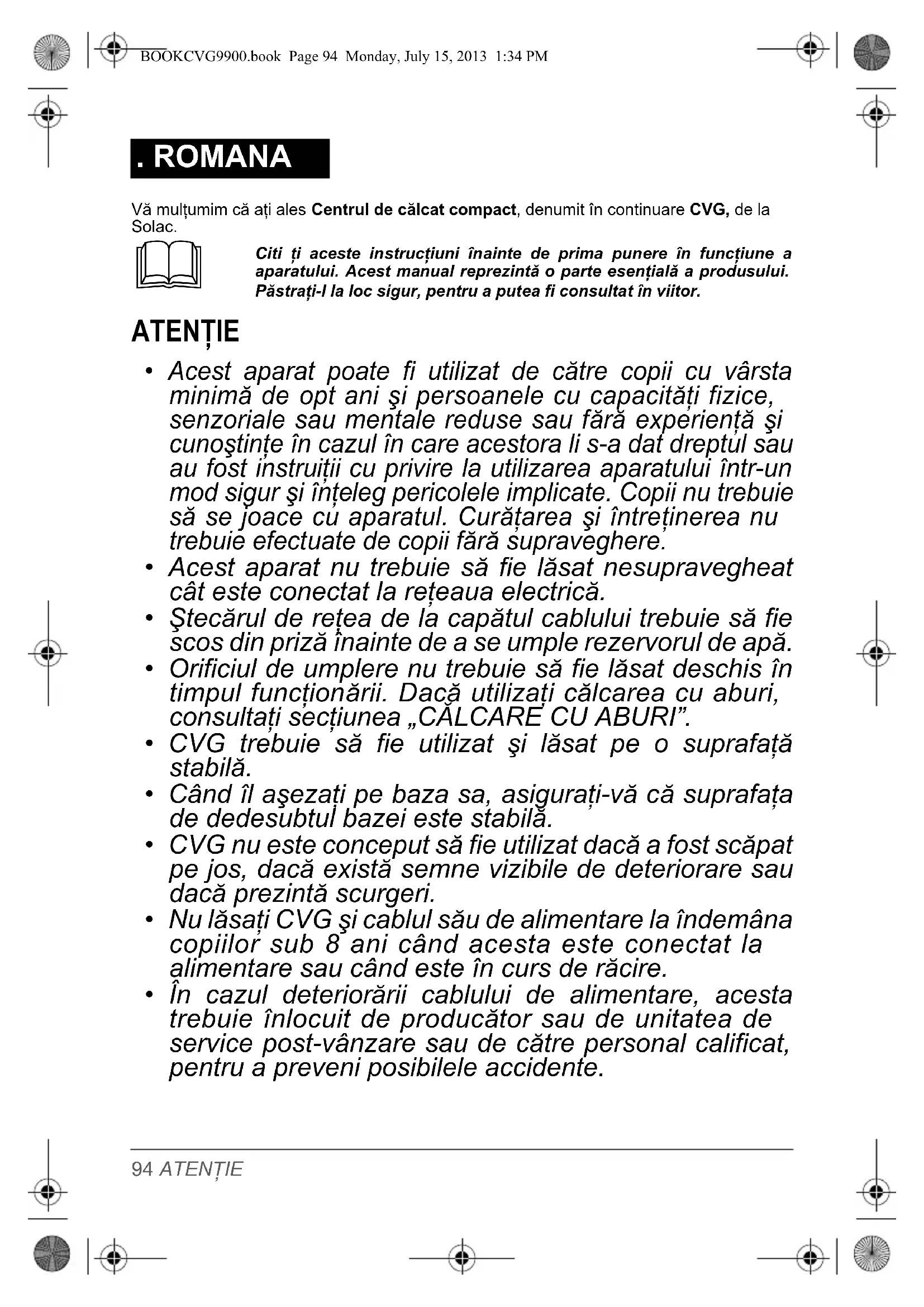 SISTEMUL ANTICALCAR CVG este prevăzut cu un sistem inovator anticalcar care poate fi înlocuit şi care constă intr- un filtru cu răşină, care reţine substanţele calcaroase din apă, împiedicând pătrunderea acestora in camera de aburi din talpa fierului de călcat şi mărind astfel durata de viaţă a aparatului. Existenţa acestui sistem nu înseamnă că puteţi neglija recomandările care privesc duritatea apei, pe care le puteţi consulta in secţiunea “INAINTE DE A INCEPE SĂ CĂLCAŢI”. BOOKCVG9900.book Page 99 Monday, July 15, 2013 1:34 PMBOOKCVG9900.book Page 101 Monday, July 15, 2013 1:34 PMTechnical data 220-240V, 50/60Hz, 2020-2400W Protection class I In conformity with the European directives BOOKCVG9900.book Page 102 Monday, July 15, 2013 1:34 PM