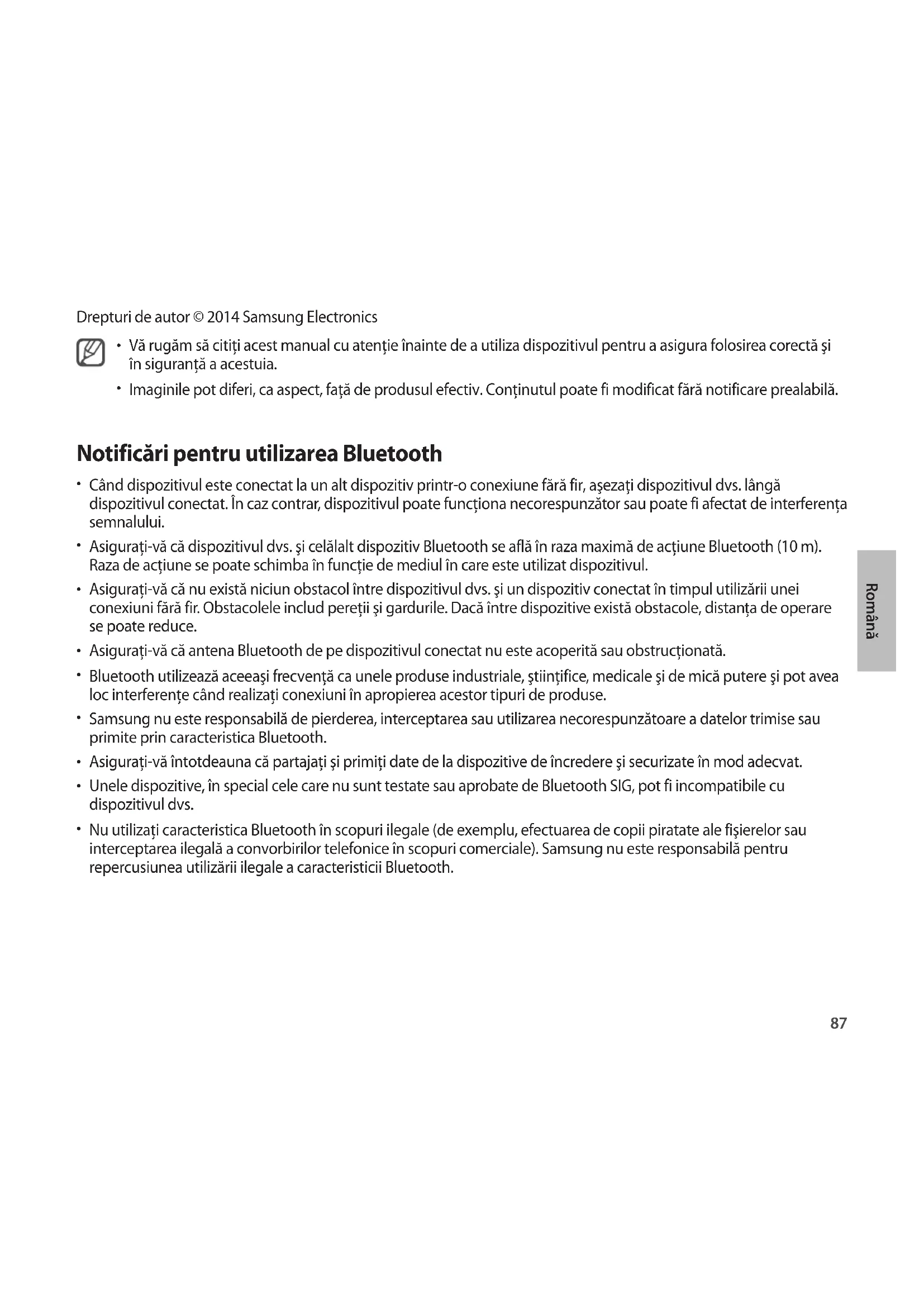 Samsung nu este responsabilă de pierderea, interceptarea sau utilizarea necorespunzătoare a datelor trimise sau primite prin caracteristica Bluetooth.