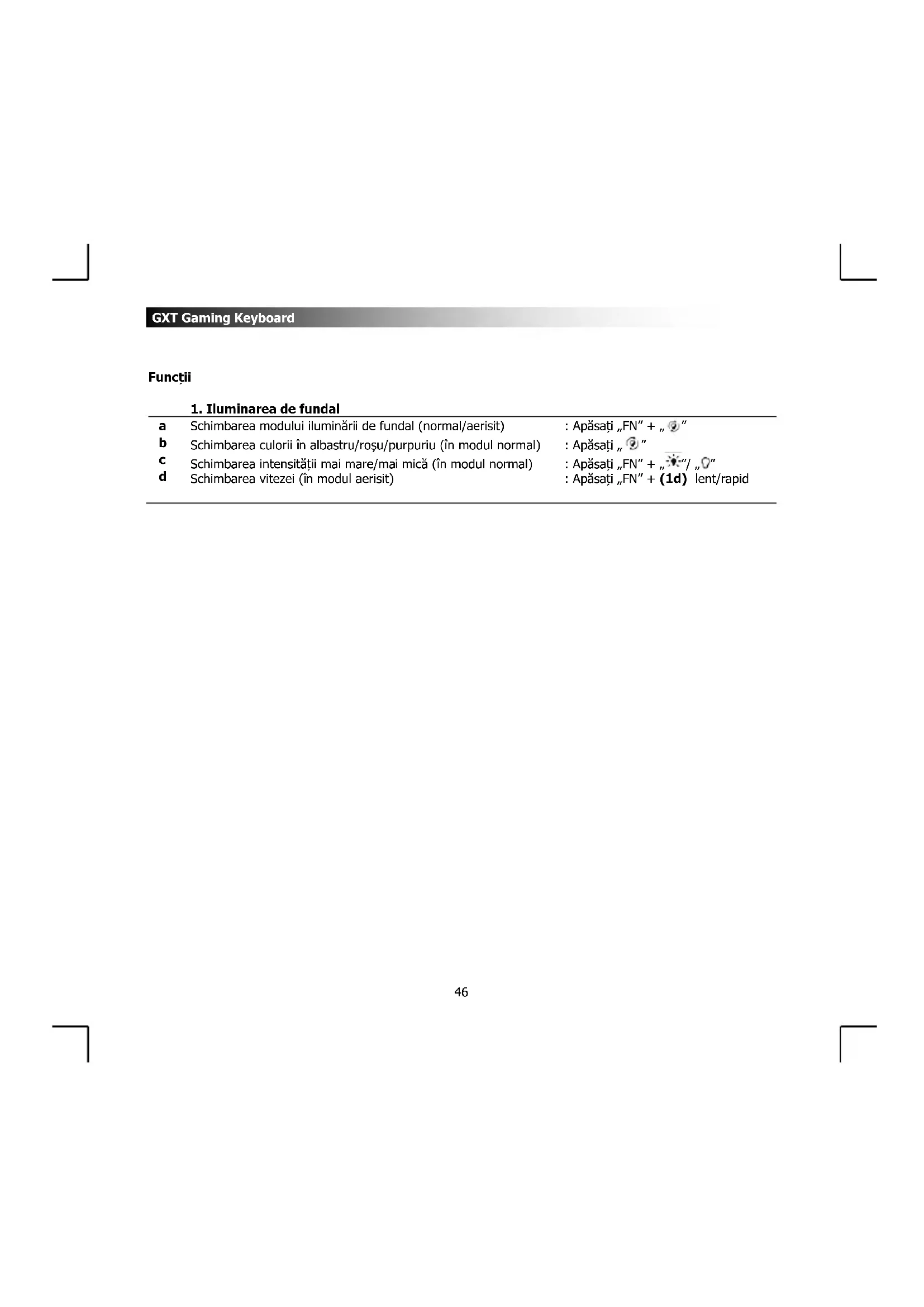 Schimbarea modului iluminării de fundal (normal/aerisit) : Apăsați „FN” + „ ” Schimbarea culorii în albastru/roșu/purpuriu (în modul normal) : Apăsați „ ” Schimbarea intensității mai mare/mai mică (în modul normal) : Apăsați „FN” + „ ”/ „ ” Schimbarea vitezei (în modul aerisit) : Apăsați „FN” + (1d) lent/rapidGXT Gaming Keyboard
