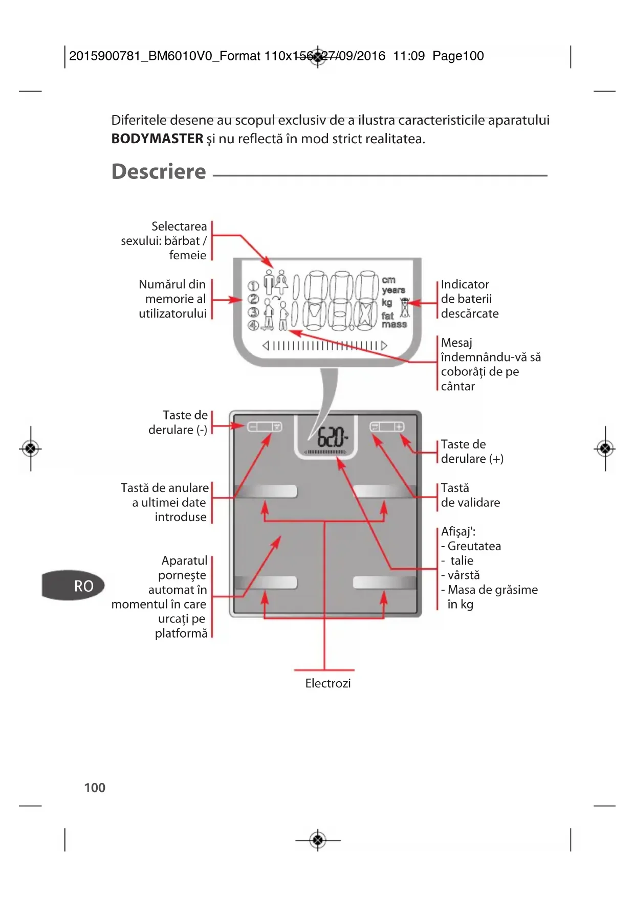 Diferitele desene au scopul exclusiv de a ilustra caracteristicile aparatului BODYMASTER şi nu reflectă în mod strict realitatea. Descriere Selectarea sexului: bărbat / femeie Numărul din memorie al utilizatorului Taste de derulare (-) Tastă de anulare a ultimei date introduse Aparatul porneşte automat în momentul în care urcaţi pe platformă Indicator de baterii descărcate Mesaj îndemnându-vă să coborâţi de pe cântar Taste de derulare (+) Tastă de validare Afişaj': - Greutatea - talie - vârstă - Masa de grăsime în kg Electrozi 2015900781_BM6010V0_Format 110x156 27/09/2016 11:09 Page100O nouă abordare a greutăţii Pentru un mai bun control al greutăţii şi siluetei dumneavoastră, este important să cunoaşteţi compoziţia corporală (apă, muşchi, oase şi masă de grăsime). Muşchii şi masa de grăsime, principalele componente ale greutăţii corporale, sunt responsabile de viaţă şi trebuie repartizate în mod echilibrat. Această repartizare variază în funcţie de sex, vârstă şi talie. Prezenţa muşchilor permite practicarea de activităţi fizice, ridicarea de greutăţi, deplasarea fără dificultate. Cu cât masa musculară este mai mare, cu atât aceasta consumă mai multă energie şi contribuie astfel la controlul greutăţii. Masa de grăsime are rol de izolator, de protecţie şi de rezervă de energie. Aceasta este inertă şi stochează caloriile excedentare dacă mâncaţi mai mult decât consumaţi. Exerciţiul fizic permite reducerea masei de grăsime, iar sedentarismul duce la creşterea acesteia. În cantităţi mari, masa de grăsime devine periculoasă pentru sănătate (riscuri cardiovasculare, colesterol etc.) Dacă urmaţi un regim, BODYMASTER vă ajută să controlaţi pierderea de masă de grăsime, veghind totodată la menţinerea masei musculare la un nivel corespunzător. Într-adevăr, un regim alimentar necorespunzător poate duce la pierderea de masă musculară. Şi tocmai muşchii sunt cei care consumă energie. Dacă scade masa musculară, se ard mai puţine calorii, iar corpul depozitează mai multă grăsime. Prin urmare, nu există o pierdere durabilă a masei de grăsime fără menţinerea masei musculare. BODYMASTER vă permite să vă controlaţi regimul şi să menţineţi echilibrul dumneavoastră corporal de-a lungul timpului. Pentru ca acest aparat să vă ofere o satisfacţie deplină, este necesar ca greutatea să fie măsurată întotdeauna în aceleaşi condiţii: – trebuie să fiţi în picioarele goale (contact direct cu pielea). Picioarele goale trebuie să fie uscate şi bine poziţionate pe electrozi (vezi pagina 2). Atenţie! Dacă pielea dumneavoastră prezintă multe calozităţi, există riscul ca datele să fie eronate. – de preferinţă o dată pe săptămână după deşteptare (pentru a nu lua în calcul fluctuaţiile de greutate din timpul zilei, legate de alimentaţie, digestie sau activitatea fizică a persoanei). – un sfert de oră după ridicarea din pat, astfel încât apa din corpul
