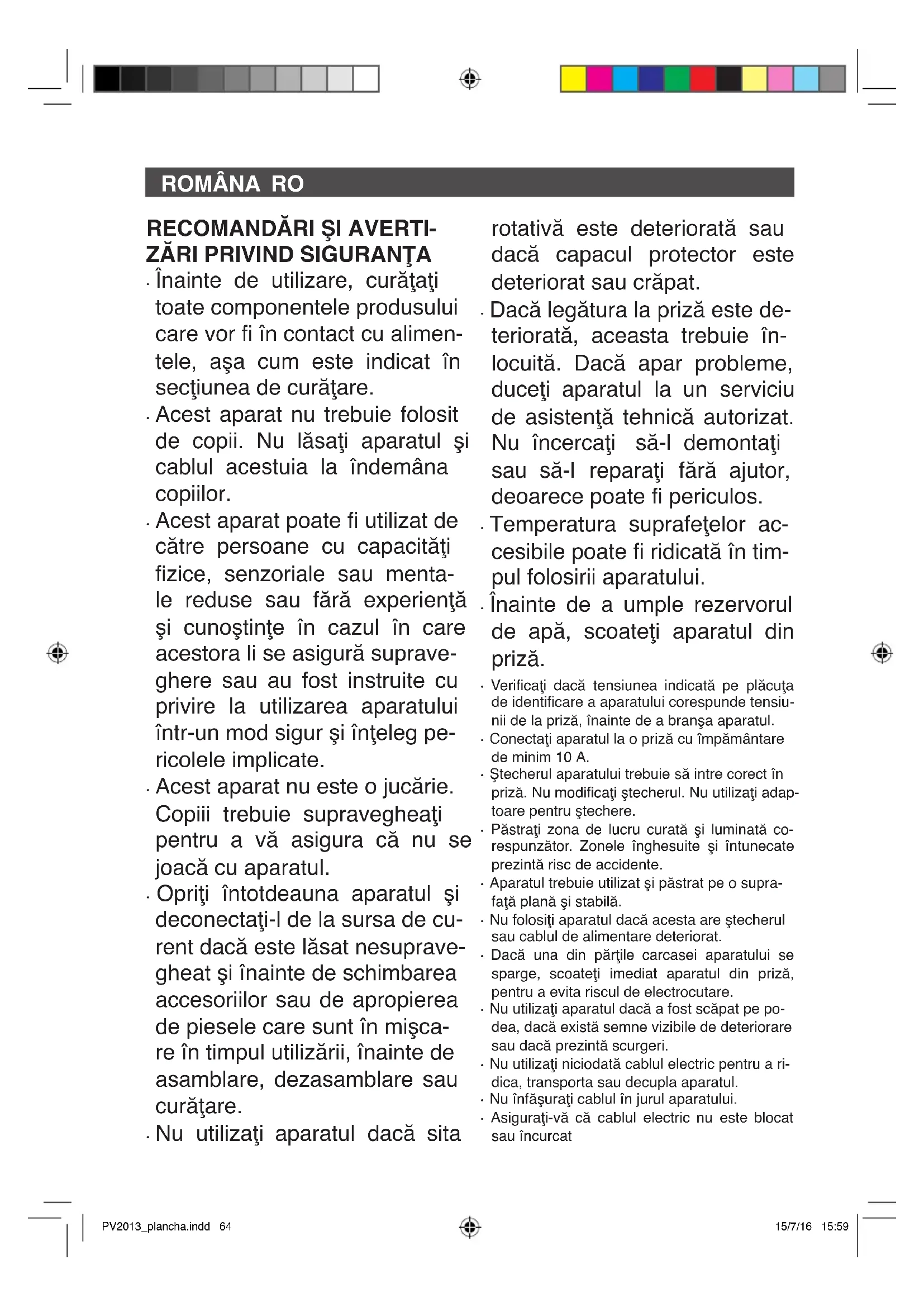 - Asiguraţi-vă că cablul electric nu este blocat sau încurcat PV2013_plancha.indd 64 15/7/16 15:59RO