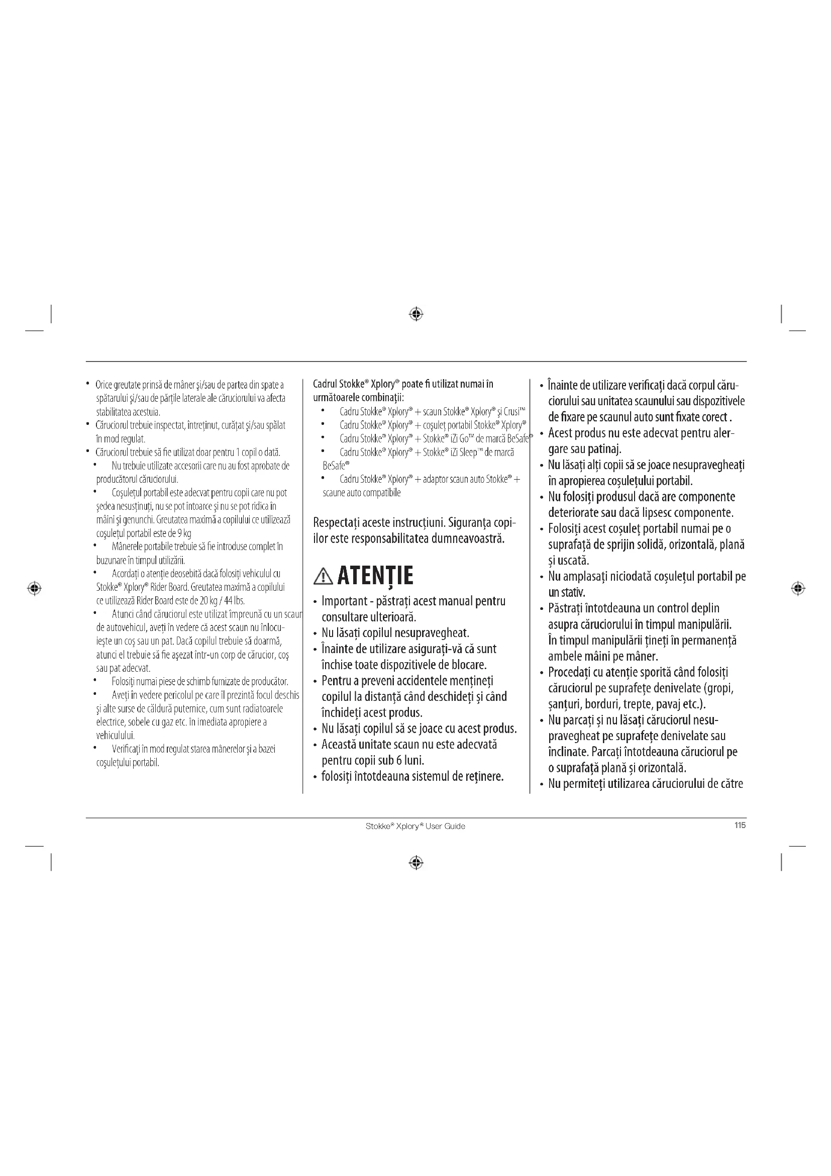 Orice greutate prinsă de mâner şi/sau de partea din spate a spătarului şi/sau de părţile laterale ale căruciorului va afecta stabilitatea acestuia. Căruciorul trebuie inspectat, întreţinut, curăţat şi/sau spălat în mod regulat. Căruciorul trebuie să e utilizat doar pentru 1 copil o dată. Nu trebuie utilizate accesorii care nu au fost aprobate de producătorul căruciorului. Coşuleţul portabil este adecvat pentru copii care nu pot şedea nesusţinuţi, nu se pot întoarce şi nu se pot ridica în mâini şi genunchi. Greutatea maximă a copilului ce utilizează coşuleţul portabil este de 9 kg Mânerele portabile trebuie să e introduse complet în buzunare în timpul utilizării. Acordaţi o atenţie deosebită dacă folosiţi vehiculul cu Stokke® Xplory® Rider Board. Greutatea maximă a copilului ce utilizează Rider Board este de 20 kg / 44 lbs. Atunci când căruciorul este utilizat împreună cu un scaun de autovehicul, aveţi în vedere că acest scaun nu înlocu- ieşte un coş sau un pat. Dacă copilul trebuie să doarmă, atunci el trebuie să e aşezat într-un corp de cărucior, coş sau pat adecvat. Folosiţi numai piese de schimb furnizate de producător. Aveţi în vedere pericolul pe care îl prezintă focul deschis şi alte surse de căldură puternice, cum sunt radiatoarele electrice, sobele cu gaz etc. în imediata apropiere a vehiculului. Vericaţi în mod regulat starea mânerelor şi a bazei coşuleţului portabil. Cadrul Stokke® Xplory® poate utilizat numai în următoarele combinaţii: Cadru Stokke® Xplory® + scaun Stokke® Xplory® şi Crusi™ Cadru Stokke® Xplory® + coşuleţ portabil Stokke® Xplory® Cadru Stokke® Xplory® + Stokke® iZi Go™ de marcă BeSafe® Cadru Stokke® Xplory® + Stokke® iZi Sleep™ de marcă BeSafe® Cadru Stokke® Xplory® + adaptor scaun auto Stokke® + scaune auto compatibile Respectaţi aceste instrucţiuni. Siguranţa copi- ilor este responsabilitatea dumneavoastră. ATENŢIE
