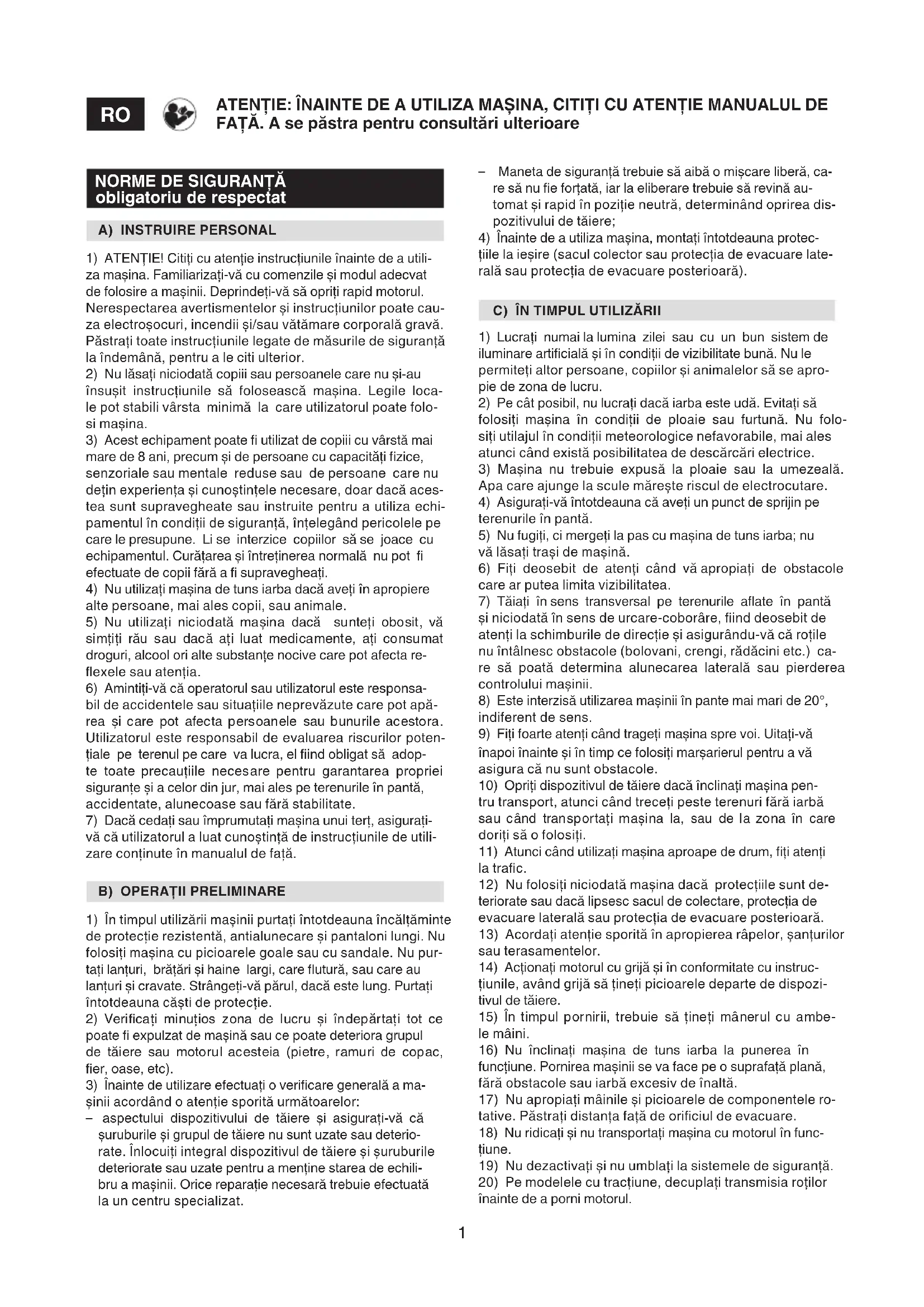 funcţiune. Pornirea mașinii se va face pe o suprafaţă plană, fără obstacole sau iarbă excesiv de înaltă.