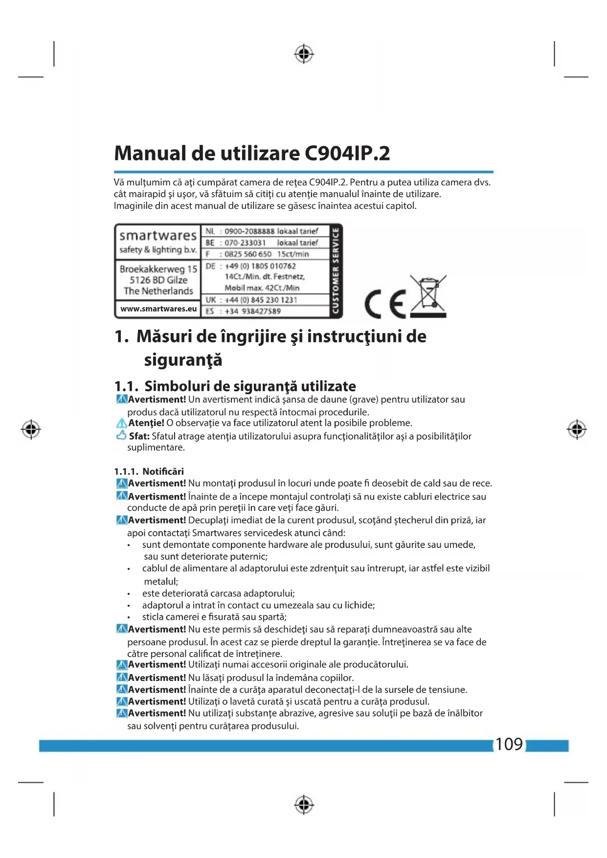 Erre a készülékre határozott idejű, 3 éves garancia érvényes. A garanciális feltételeket itt találja: www.smartwares.eu.109 Manual de utilizare C904IP.2 Vă mulţumim că aţi cumpărat camera de reţea C904IP.2. Pentru a putea utiliza camera dvs. cât mairapid şi uşor, vă sfătuim să citiţi cu atenţie manualul înainte de utilizare. Imaginile din acest manual de utilizare se găsesc înaintea acestui capitol. www.smartwares.eu