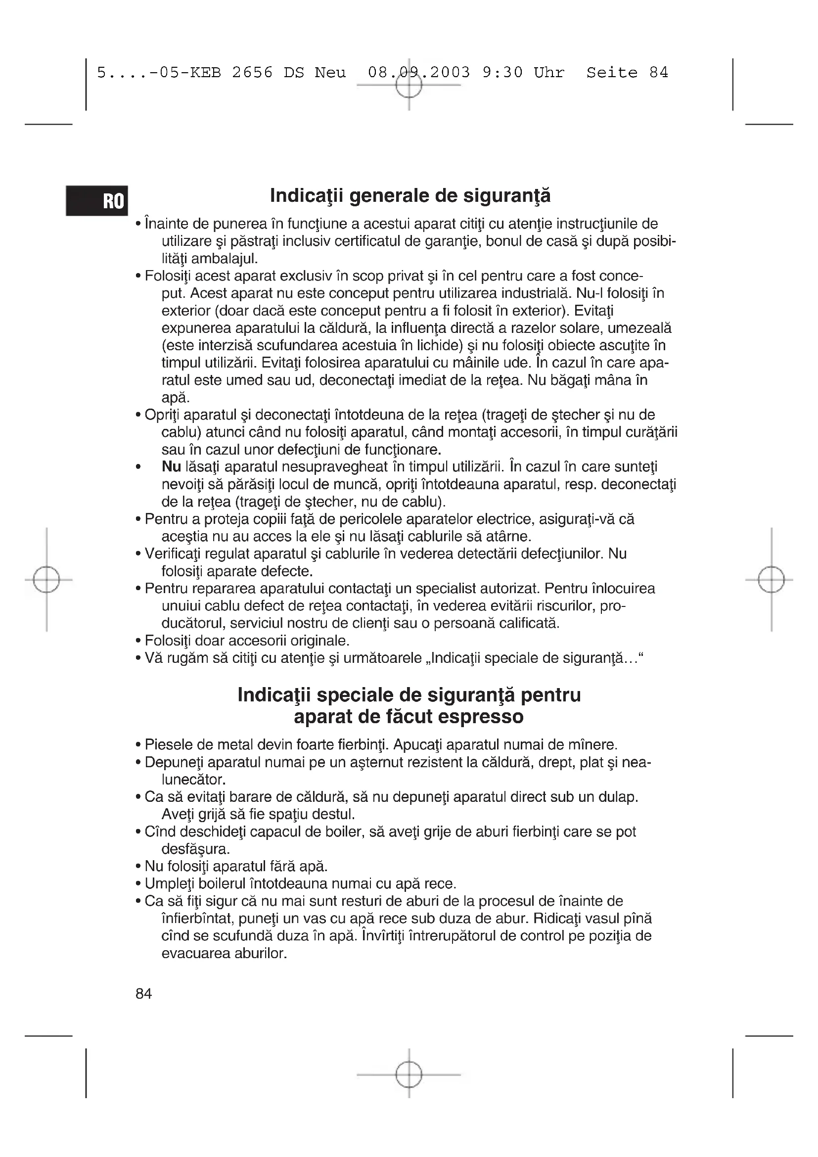 Zæbrele contra reværsare care se poate scoate j Adapter pentru 2 ceøti Esspresso/Cappuccino/Cafea de filtru 5....-05-KEB 2656 DS Neu 08.09.2003 9:30 Uhr Seite 85Atenflie - aparatul de preparat esspresso dezvoltæ presiune În timpul întrebuinflærii se dezvoltæ pe vasul de apæ presiune. De aceea sæ nu uitafli nici o datæ sæ deschidefli închizætorul pentru vas de apæ (a) sau deflinætorul de filtru numai dupæ ce nu mai este presiune pe vasul de apæ. Væ rugæm sæ urmafli indicafliile ca sæ constatafli dacæ aparatul mai este sub presiune. Urmætoarele indicaflii de siguranflæ trebuie sæ le urmærifli în timpul întrebuinflærii øi ca. 15 minute dupæ întrebuinflare: