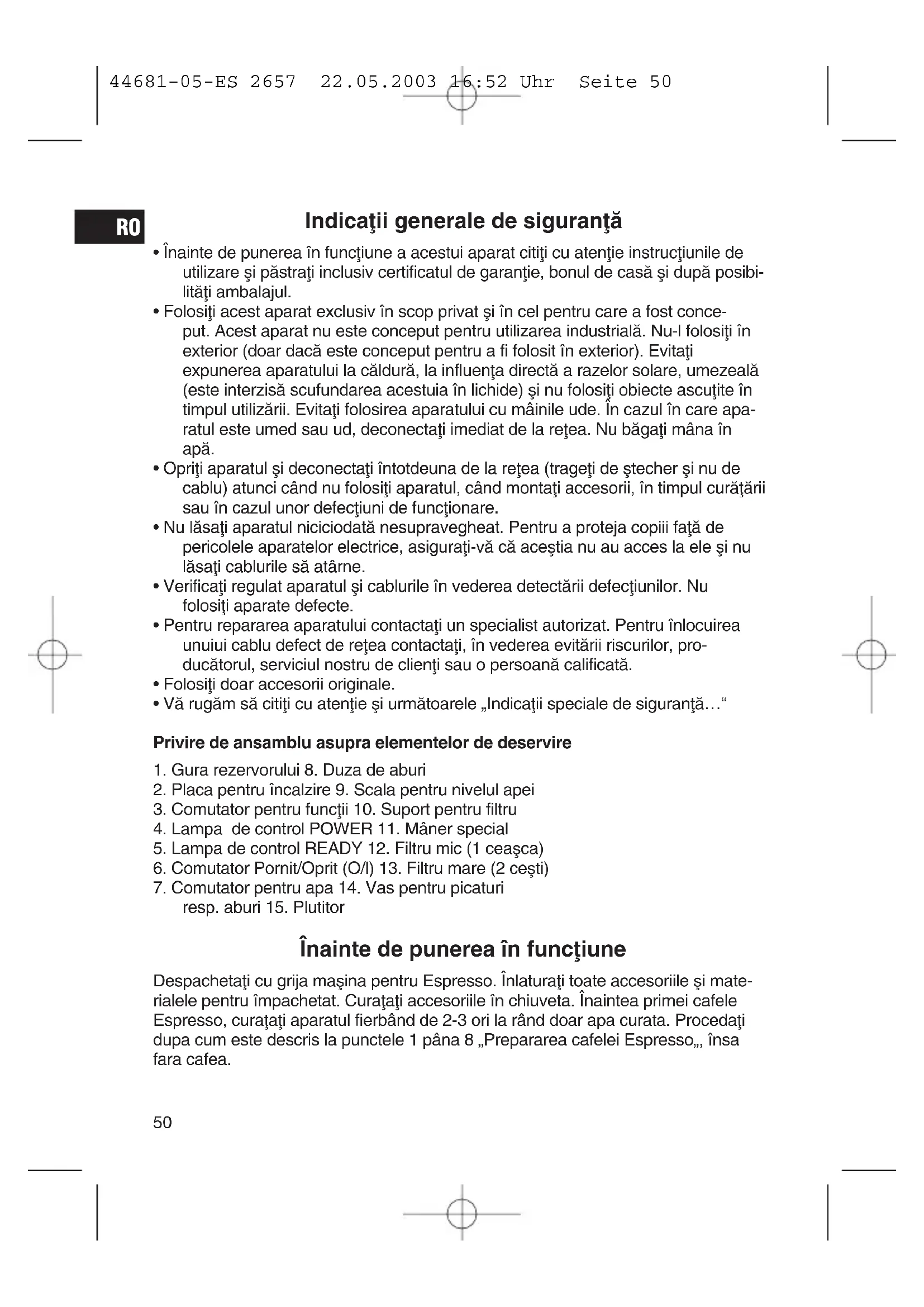 resp. aburi 15. Plutitor Înainte de punerea în funcfliune Despachetafli cu grija maøina pentru Espresso. Înlaturafli toate accesoriile øi mate- rialele pentru împachetat. Curaflafli accesoriile în chiuveta. Înaintea primei cafele Espresso, curaflafli aparatul fierbând de 2-3 ori la rând doar apa curata. Procedafli dupa cum este descris la punctele 1 pâna 8 „Prepararea cafelei Espresso„, însa fara cafea.