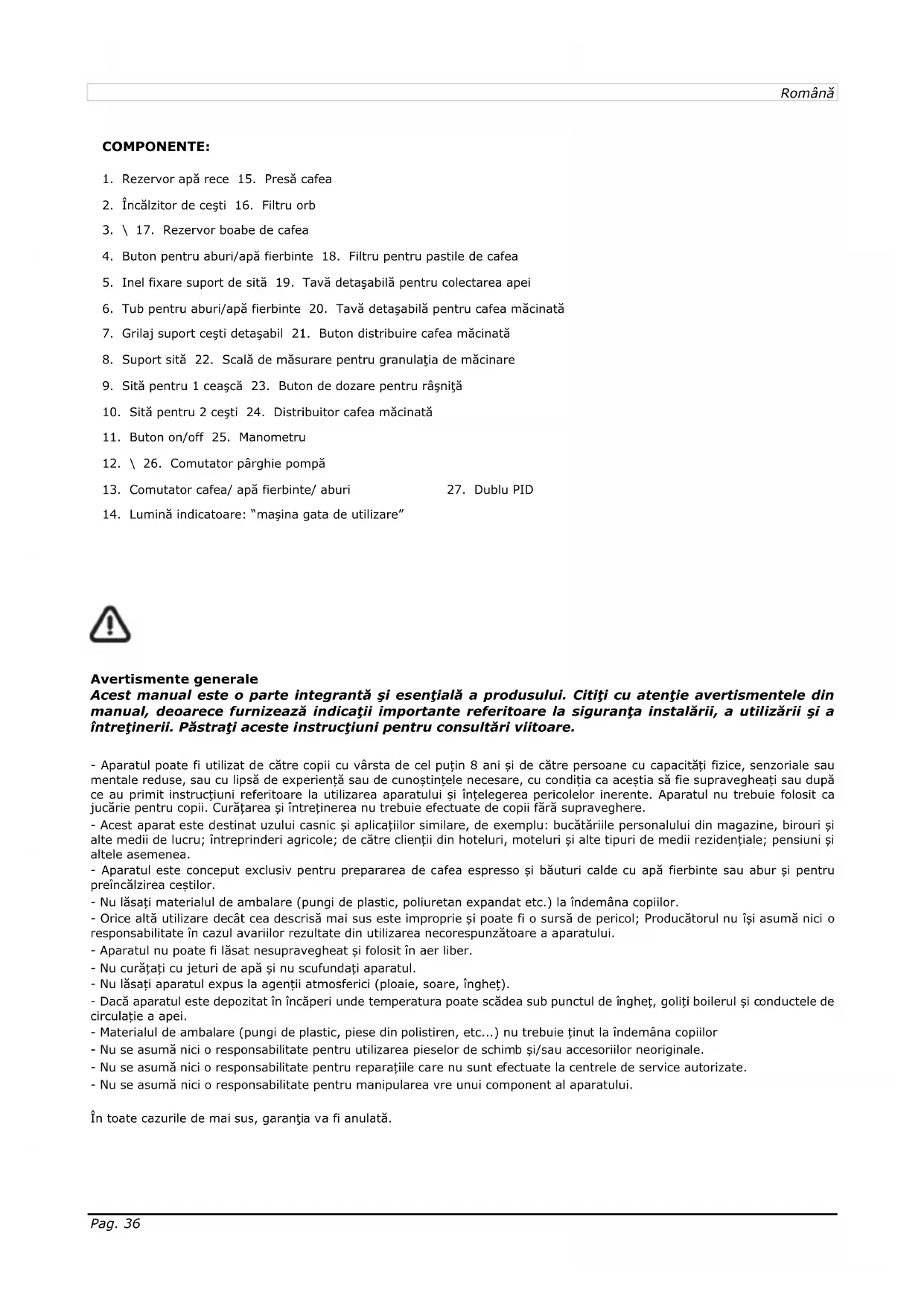 Avertismente generale Acest manual este o parte integrantă şi esenţială a produsului. Citiţi cu atenţie avertismentele din manual, deoarece furnizează indicaţii importante referitoare la siguranţa instalării, a utilizării şi a întreţinerii. Păstraţi aceste instrucţiuni pentru consultări viitoare. - Aparatul poate fi utilizat de către copii cu vârsta de cel puțin 8 ani și de către persoane cu capacități fizice, senzoriale sau mentale reduse, sau cu lipsă de experiență sau de cunoștințele necesare, cu condiția ca aceștia să fie supravegheați sau după ce au primit instrucțiuni referitoare la utilizarea aparatului și înțelegerea pericolelor inerente. Aparatul nu trebuie folosit ca jucărie pentru copii. Curățarea și întreținerea nu trebuie efectuate de copii fără supraveghere. - Acest aparat este destinat uzului casnic și aplicațiilor similare, de exemplu: bucătăriile personalului din magazine, birouri și alte medii de lucru; întreprinderi agricole; de către clienții din hoteluri, moteluri și alte tipuri de medii rezidențiale; pensiuni și altele asemenea. - Aparatul este conceput exclusiv pentru prepararea de cafea espresso și băuturi calde cu apă fierbinte sau abur și pentru preîncălzirea ceștilor. - Nu lăsați materialul de ambalare (pungi de plastic, poliuretan expandat etc.) la îndemâna copiilor. - Orice altă utilizare decât cea descrisă mai sus este improprie și poate fi o sursă de pericol; Producătorul nu își asumă nici o responsabilitate în cazul avariilor rezultate din utilizarea necorespunzătoare a aparatului. - Aparatul nu poate fi lăsat nesupravegheat și folosit în aer liber. - Nu curățați cu jeturi de apă și nu scufundați aparatul. - Nu lăsați aparatul expus la agenții atmosferici (ploaie, soare, îngheț). - Dacă aparatul este depozitat în încăperi unde temperatura poate scădea sub punctul de îngheț, goliți boilerul și conductele de circulație a apei. - Materialul de ambalare (pungi de plastic, piese din polistiren, etc...) nu trebuie ținut la îndemâna copiilor - Nu se asumă nici o responsabilitate pentru utilizarea pieselor de schimb și/sau accesoriilor neoriginale. - Nu se asumă nici o responsabilitate pentru reparațiile care nu sunt efectuate la centrele de service autorizate. - Nu se asumă nici o responsabilitate pentru manipularea vre unui component al aparatului. În toate cazurile de mai sus, garanţia va fi anulată.Pag. 37 Română