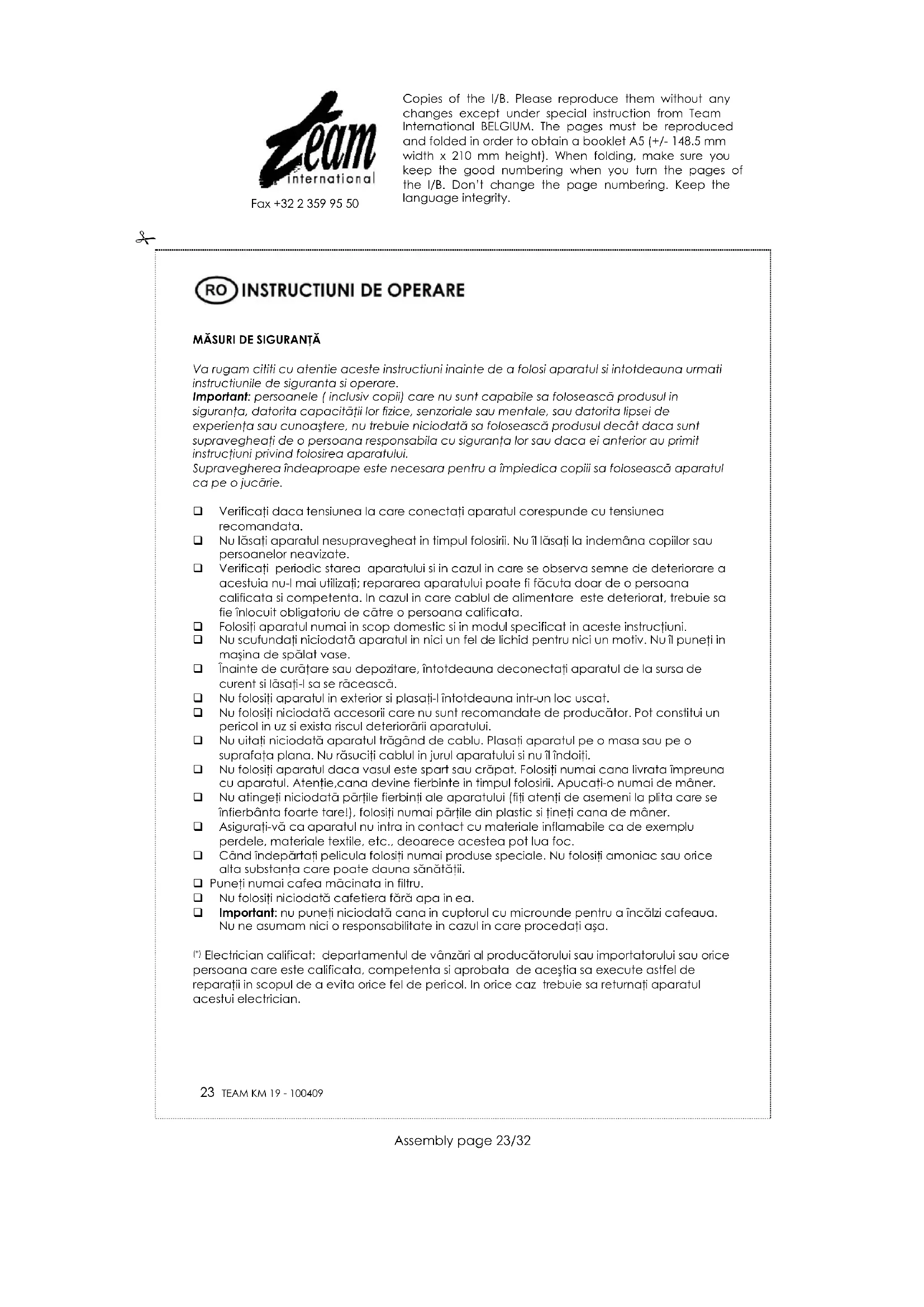Simbolul de pe tăbliţa cu datele tehnice înseamnă că produsul nu se poate arunca împreună cu alte reziduuri menajere. Legea pedepseşte cu amendă persoanele care aruncă aparatele electrice şi electronice împreună cu alte reziduuri. Debarasarea corespunzătoare a produselor uzate previne formarea unor efecte negative pentru mediul natural şi sănătatea umană, care pot fi produse de manipularea nepotrivită a reziduurilor rămase din uzarea aparatelor electronice. Copies of the I/B. Please reproduce them without any changes except under special instruction from Team International BELGIUM. The pages must be reproduced and folded in order to obtain a booklet A5 (+/- 148.5 mm width x 210 mm height). When folding, make sure you keep the good numbering when you turn the pages of the I/B. Don’t change the page numbering. Keep the language integrity.