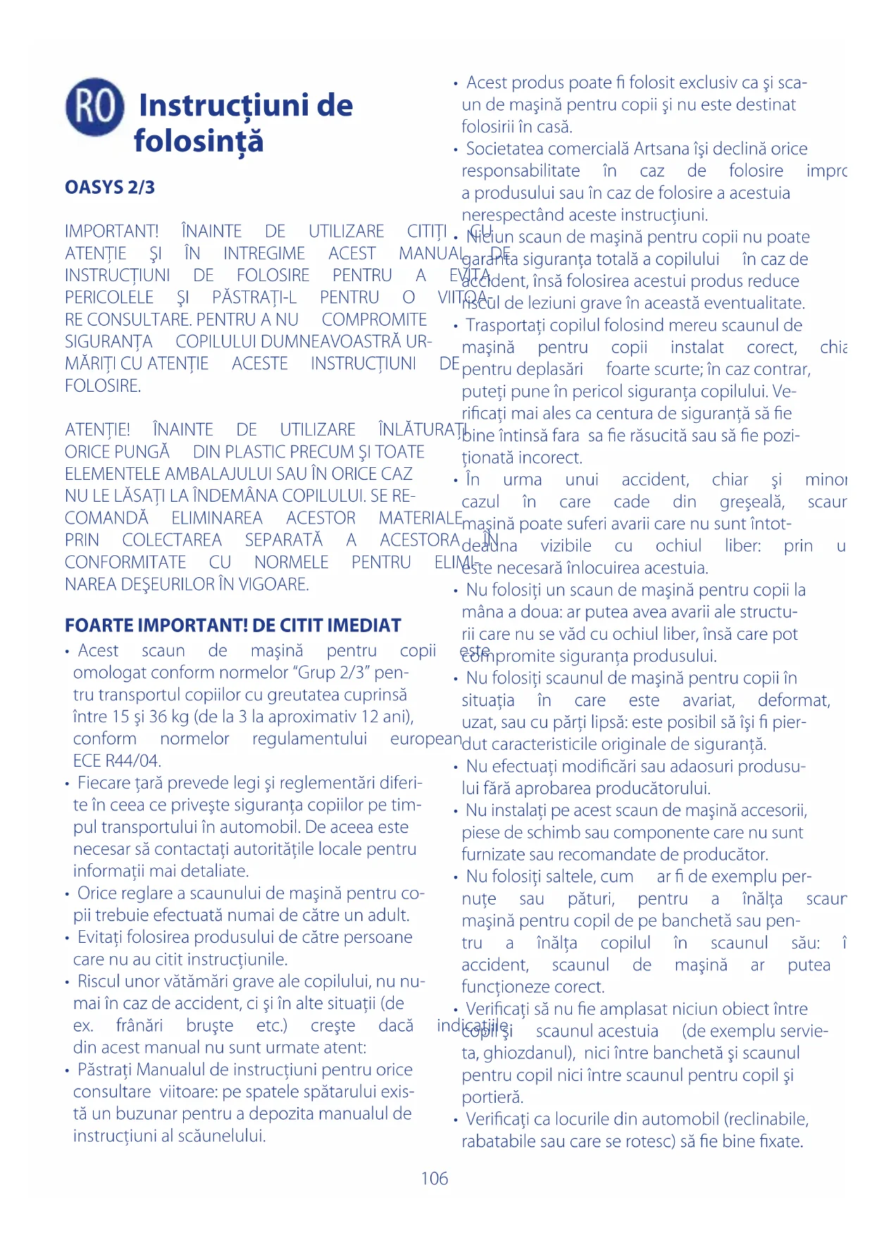 unpasager. ATENŢIE!Parteaposterioarăascaunuluidema- şinăpentrucopiitrebuiesăaibăofoartebună aderenţăpeloculautomobilului. 2.Aşezaţicopilulastfelîncâtsăaibăspatelebine sprijinitdespătarulscaunuluisău. 3.Vericaţi înălţimea spătarului (a se consulta paragraful„REGLAREAÎNĂLŢIMIISPĂTARULUI”). 4.Vericaţilăţimeaspătarului(asevedeapara- graful„REGLAREALĂŢIMIISPĂTARULUI”). 5.Introduceţiparteadiagonalăacenturiiauto- mobilului în ghidajul centurii diagonale (B). Asiguraţi-vă că butonul de deschidere/în- chidereaghidajuluicenturii(I)estecomplet închis,controlândcaliniaalbădereferinţăsă evizibilă(g.8). 6.Cuplaţicenturade siguranţă trecândpartea abdominală prin ghidajele de culoare roşie alecenturii (F) pedupăceledouăbraţeale scaunuluiiarparteaîndiagonalăpesubbra- ţuldepeparteacatarameidecuplare(g.9). 7.Trageţi în sus de partea centurii diagonale, pentruavăasiguracăesteintinsăcorectşică estelipităbinedetoraceleşipicioarelecopilu- luifărăînsăa-lstrângepreatare.(Fig.10). ATENŢIE!Asiguraţi-văcăcenturadesiguranţăa automobiluluiestepretensionatăcorect. ATENŢIE!Asiguraţi-văcăcenturadesiguranţăa automobiluluinuesterăsucită(Fig.11). ATENŢIE! Asiguraţi-vă că centura diagonală se sprijinăcorectpeumărulcopilului(Fig.10)şinu facepresiunepe gâtul acestuia;dacăestene- cesarreglaţiînălţimeaspătarului(aseconsulta paragraful„REGLAREAÎNĂLŢIMIISPĂTARULUI”). ATENŢIE!Asiguraţi-văcădispozitivuldereglare acenturiidesiguranţărămânemaiînspate(sau celpuţinaliniat)cuspătarulloculuidinautomo- bil(Fig.5). ATENŢIE!Nutreceţicenturadesiguranţăama- şiniiprinpoziţiidiferitefaţădeceleindicateîn acestmanualdeinstrucţiuni!(Fig.12). ATENŢIE!Controlaţicăaţiasiguratcorectcopilul înscaunulsău,astfelîncâtsănualuneceînfaţă. Instalarea scaunului de maşină fără copil Cândnutrebuiefolositpentrutransportulcopi- lului,scaunuldemaşinătrebuieînoricecazan- coratcucenturadesiguranţăîntreipunctede prindere,saupoatepusînportbagaj.Scaunul de maşină pentru copiilăsat neancorat poate constitui un pericol pentru pasageri în caz de accidentsaudefrânebruşte. Cum scoatem copilul din scaunul de maşină Estesucientsădesfacemcataramadelacentu- radesiguranţă,ţinând-opânălaînvârtireacom- pletăpedispozitivuldepretensionare. Dezinstalarea scaunului de maşină pen- tru copii din automobil ATENŢIE!Scoateţicopiluldinscaunuldemaşină înaintedeaîncepedezinstalareaacestuia. 1.Decuplaţicenturadesiguranţăaautomobilului. 2.Scoateţiparteadiagonală acenturiidinghi- dajeţinând-opânălaînvârtireacompletăpe dispozitivuldepretensionare. Instalare şi dezinstalare suport pahar Scaunuldemaşinăpentrucopiieste prevăzut cu2cuplaje,unulpedreaptaşiunulpestânga şezutuluipentruapermiteinstalareasuportului pentrupaharînfuncţiedenecesităţi. Pentruinstalaresuportpahar: 1.Introduceţisuportulpentrupaharînrespecti- vullocaş(Fig.13). 2.Împingeţi-lînjospânăcândsimţiţicăseblo- chează(Fig.14). ATENŢIE!Nuintroduceţiînsuportulpentrupa- harobiectedinsticlăsaulichidecalde,copilul s-arputeaaccidenta. Pentrua-ldezinstala: 1.Apăsaţi clapeta din spatele suportului şi ri- dicaţi-l,decuplându-lastfeldincuplajelere- spective(Fig.15). Cuplajele suportului pentrupahar sunt prevă- zutecuundispozitivconstruit în mod special pentrua-lmenţinemereuînpoziţieorizontală. Pentruaînvârtişiaşezaînpoziţiadorităsuportul pentrupahar: 1.Apăsaţiclapetadinspateşiînvârtiţisuportul pentrupaharpânălaobţinereapoziţieidorite. Reglarea înalţimii spătarului Înălţimeaspătaruluisepoatereglaîn10poziţii pentru a adapta cât mai bine scaunul pentru copiilaînălţimeacopilului. Atenţielacapul copilului, acesta trebuiesusţi-110 nutînmodcorectiarcenturadiagonalăaau- tomobilului trebuie să e sprijinită corect pe umărulacestuia. Înfazadereglareaînălţimiispătaruluiaveţigrijă capoziţiaghidajuluicenturiidiagonale(B)săe situatădeasupraumăruluila odistanţădecel mult2cm(g.16). Pentruaefectuareglarea: 1.Apăsaţicuomânămanetadereglareaînăl- ţimii spătarului (L) aată pe spatele tetierei (g.17). 2.Ridicaţi/apăsaţi în jos spătarul pentru a-l adaptalaînălţimeaspateluicopilului(g.18) 3.Lăsaţimanetavericândcuplareaacesteiaîn poziţiadorită. Reglarea lăţimii spătarului Lăţimea spătarului scaunui de maşină pentru copiipoatereglatăpentruaadaptamaibine scaunullamărimeacopilului. Pentruaefectuaaceastăreglareacţionaţiroata dereglajpentrulărgimeaspătarului(K)vizibilă deasupratetierei: 1.Învârtind în sens invers acelorceasornicului spătarulselărgeşte(g.19)iarînsensulace- lorceasorniculuiserestrânge(g.20). Reglarea înclinaţiei spătarului/şezutului Scaunuldemaşinăpentrucopiipoatereclinat acţionândbutonulcareregleazăinclinarea(H). Scaunul de maşină pentru copii are spătarul/ şezutul reclinabile în 4 poziţii pentru a putea permite copilului să călătorescă în poziţii cât maiconfortabile. Pentruareclinaspătarulestesucientsăapu- caţiparteafrontalăaşezutuluicumâna(g21) şisătrageţiînspredumneavoastră. Pentru a readuce scaunul copilului în poziţie verticală,apăsaţibutonuldereglareareclinării (H)împingândşezutulsprespătarulbanchetei automobilului. ATENŢIE!Nu reclinaţiscaunul copilului în tim- pul folosirii. Înainte de a efectua operaţii de reglaj al spătarului trebuie să scoateţi copilul dinscaunulsău.Dupăceaţireclinatsaureadus înpoziţieverticalăscaunulpentrucopiiOasys, vericaţi cacentura de siguranţă a maşinii cu prindereîntreipunctesăeîntinsăcorectşila odistanţădecelmult2cmdeasupraumărului copilului(g.16). Efectuaţiacesteoperaţiidoarcumaşinaoprită. Scoaterea tapiţeriei spătarului/şezutului Husascaunuluidemaşinăpentrucopiipoate înlăturatăcompletşisepoatespăla.Semulează pestructurăcuajutorulvelcrouluişialelasticu- lui(Fig.22). Ridicaţicompletspătarul(C)şislăbiţiaripioa