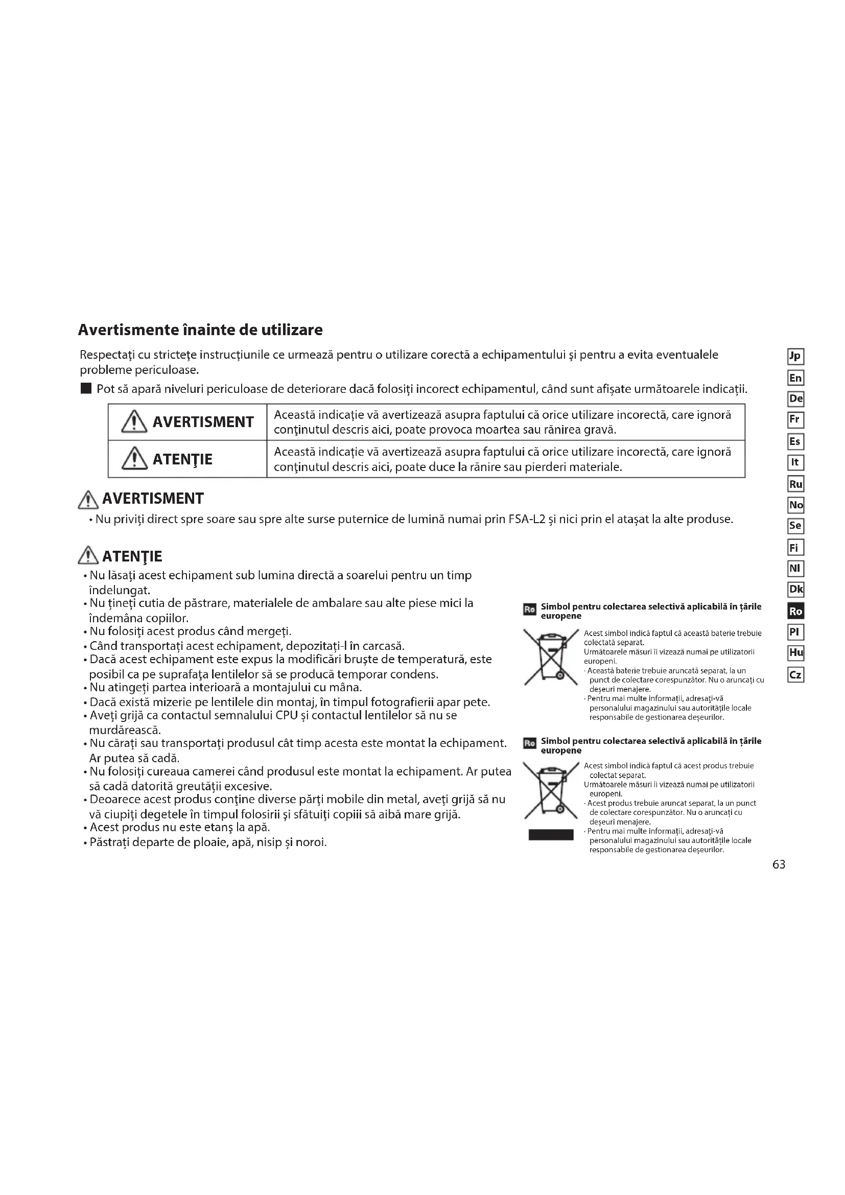 - Nu priviți direct spre soare sau spre alte surse puternice de lumină numai prin FSA-L2 și nici prin el atașat la alte produse. Simbol pentru colectarea selectivă aplicabilă în țările europene Acest simbol indică faptul că această baterie trebuie colectată separat. Următoarele măsuri îi vizează numai pe utilizatorii europeni.· Această baterie trebuie aruncată separat, la un punct de colectare corespunzător. Nu o aruncați cu deșeuri menajere. · Pentru mai multe informații, adresați-vă personalului magazinului sau autoritățile locale responsabile de gestionarea deșeurilor. Simbol pentru colectarea selectivă aplicabilă în țările europene Acest simbol indică faptul că acest produs trebuie colectat separat. Următoarele măsuri îi vizează numai pe utilizatorii europeni.· Acest produs trebuie aruncat separat, la un punct de colectare corespunzător. Nu o aruncați cu deșeuri menajere. · Pentru mai multe informații, adresați-vă personalului magazinului sau autoritățile locale responsabile de gestionarea deșeurilor.64