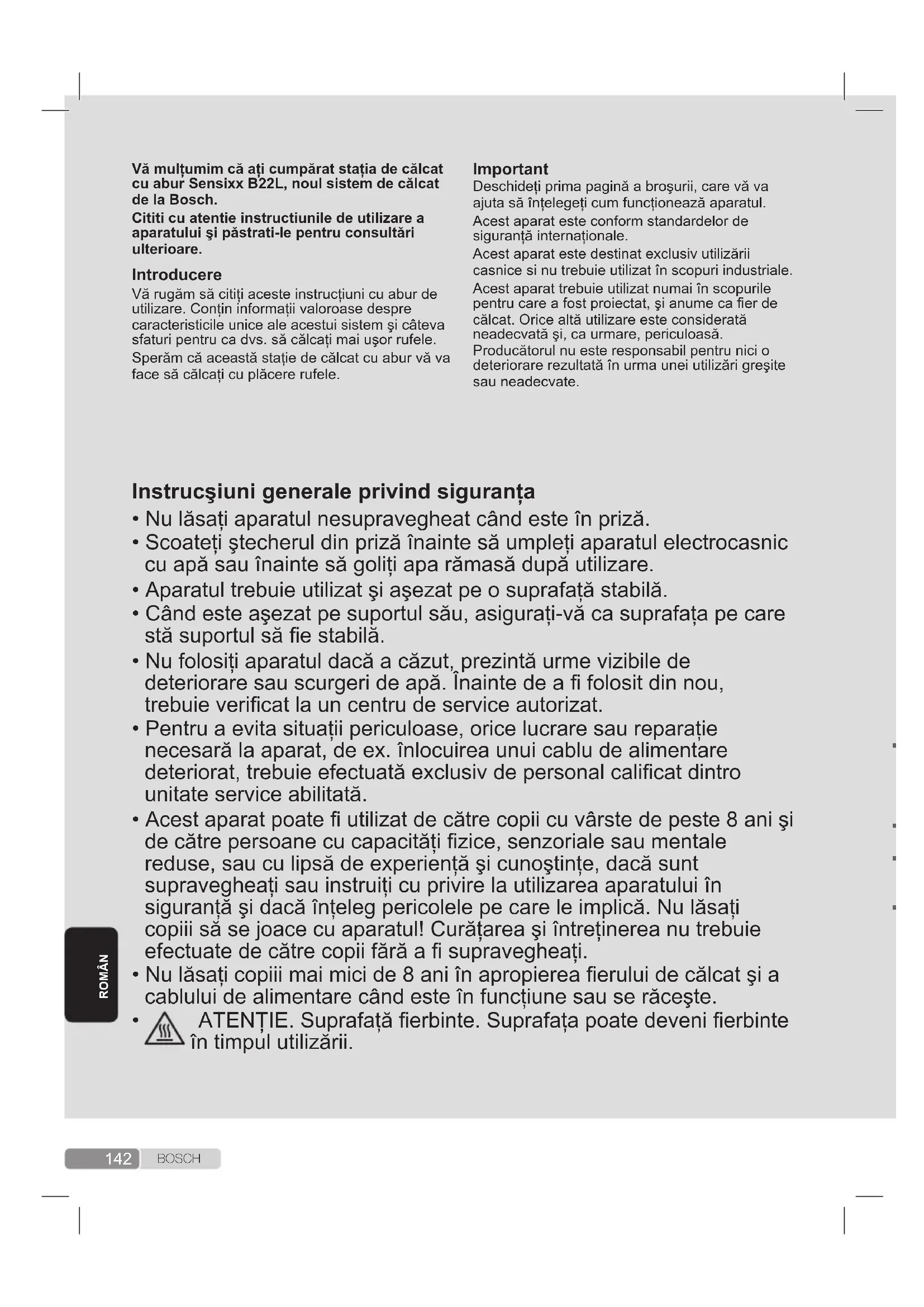 În timpul utilizării, acest aparat ajunge la temperaturi înalte şi produce abur, ceea ce poate cauza opăriri sau arsuri daca nu este folosit corespunzator. Furtunul de abur, staţia de bază, plăcuţa metalică de pe fundul suportului metalic detaşabil (2) dar mai ales erul de călcat se pot încinge în timpul utilizării. Acest lucru este normal. Nu îndreptaţi niciodată jetul de abur spre oameni sau animale. Nu permiteţi cablului să vină în contact cu talpa erului de călcat, atîta timp cât aceasta este încă erbinte. Nu uitaţi că sistemul poate continua să elibereze abur pe o durată scurtă după eliberarea butonului de declanşare a aburului. Aceasta reprezintă o funcţie normală.143 B O S C H Deschideţi prima pagină a broşurii, care vă va ajuta să înţelegeţi cum funcţionează aparatul.Acest aparat este conform standardelor de siguranţă internaţionale.Acest aparat este destinat exclusiv utilizării casnice si nu trebuie utilizat în scopuri industriale.Acest aparat trebuie utilizat numai în scopurile pentru care a fost proiectat, şi anume ca er de călcat. Orice altă utilizare este considerată neadecvată şi, ca urmare, periculoasă. Producătorul nu este responsabil pentru nici o deteriorare rezultată în urma unei utilizări greşite sau neadecvate.