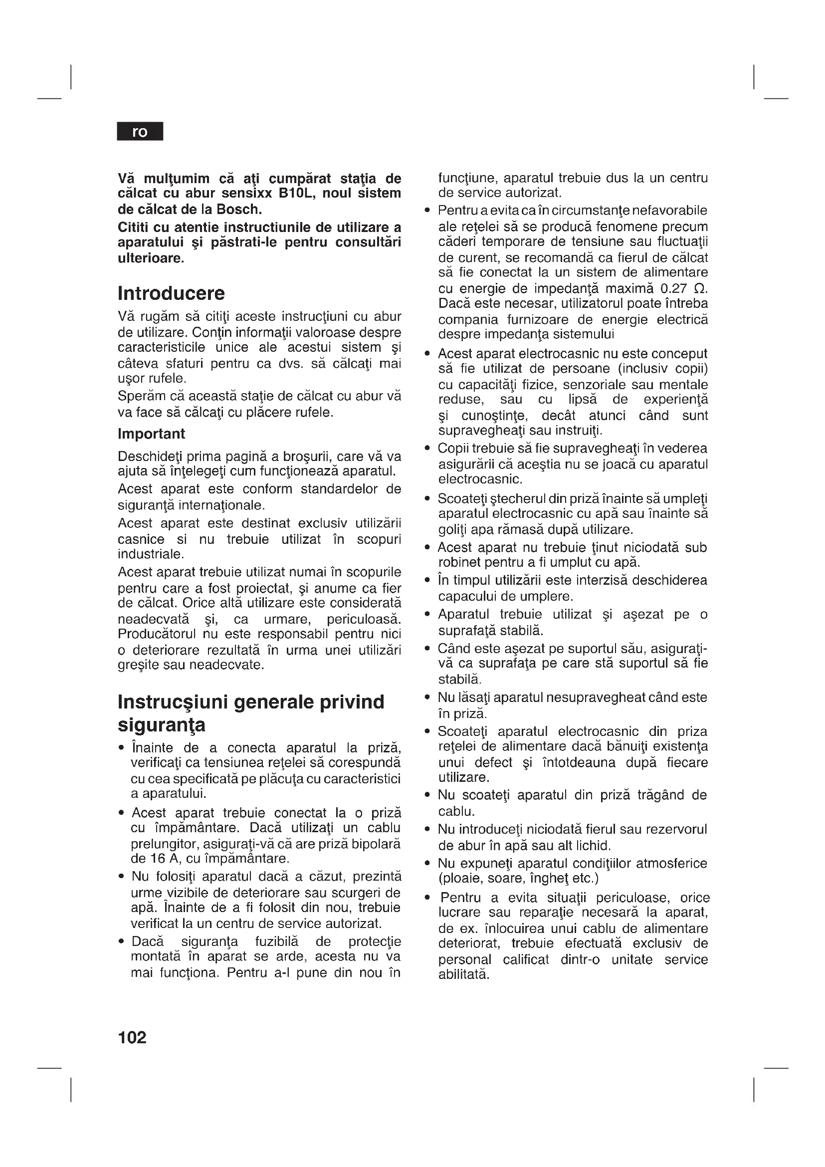 анное руководство можно скачать с веб-страницы Bosch для Вашей страны.102 Vă mulţumim că aţi cumpărat staţia de călcat cu abur sensixx B10L, noul sistem de călcat de la Bosch. Cititi cu atentie instructiunile de utilizare a aparatului şi păstrati-le pentru consultări ulterioare. Introducere Vă rugăm să citiţi aceste instrucţiuni cu abur de utilizare. Conţin informaţii valoroase despre caracteristicile unice ale acestui sistem şi câteva sfaturi pentru ca dvs. să călcaţi mai uşor rufele. Sperăm că această staţie de călcat cu abur vă va face să călcaţi cu plăcere rufele. Important Deschideţi prima pagină a broşurii, care vă va ajuta să înţelegeţi cum funcţionează aparatul. Acest aparat este conform standardelor de siguranţă internaţionale. Acest aparat este destinat exclusiv utilizării casnice si nu trebuie utilizat în scopuri industriale. Acest aparat trebuie utilizat numai în scopurile pentru care a fost proiectat, şi anume ca fier de călcat. Orice altă utilizare este considerată neadecvată şi, ca urmare, periculoasă. Producătorul nu este responsabil pentru nici o deteriorare rezultată în urma unei utilizări greşite sau neadecvate. Instrucşiuni generale privind siguranţa