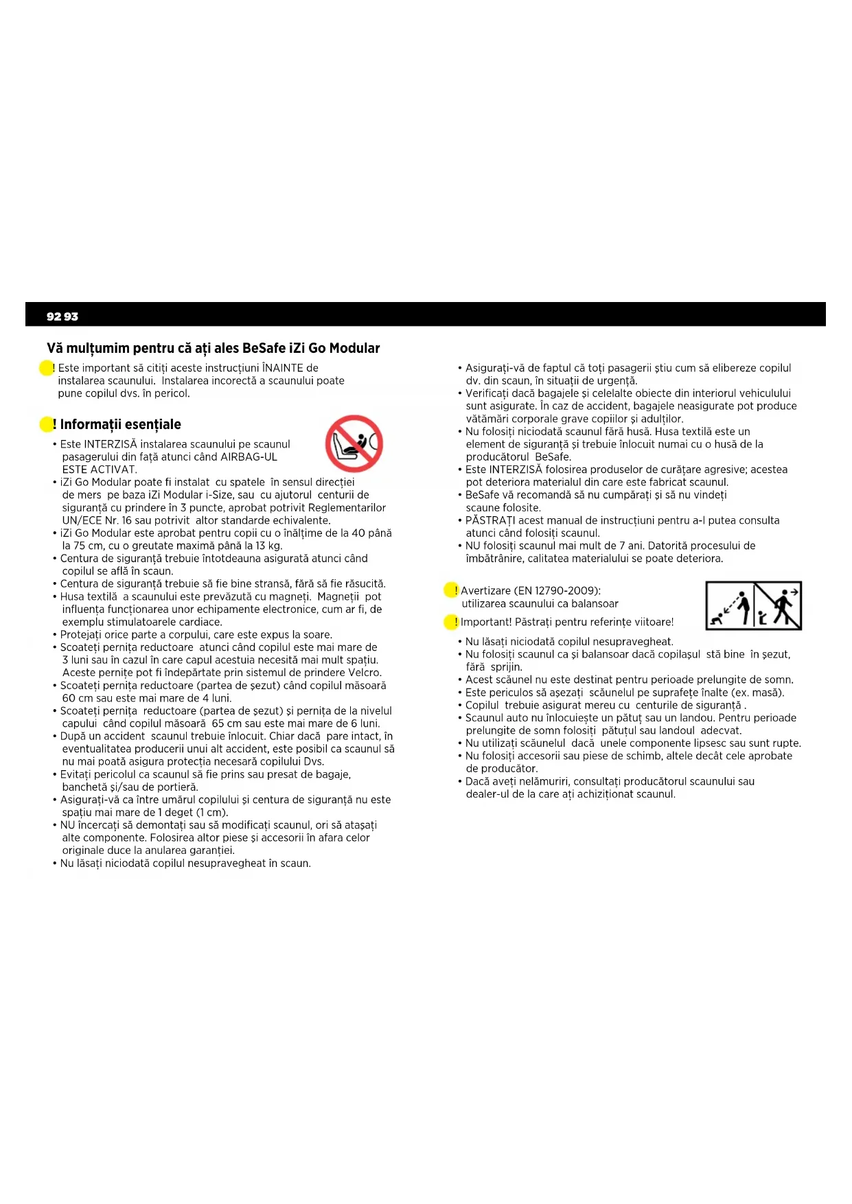 - Nu lăsaţi niciodată copilul nesupravegheat în scaun. Vă mulţumim pentru că aţi ales BeSafe iZi Go Modular ! Este important să citiţi aceste instrucţiuni ÎNAINTE de instalarea scaunului. Instalarea incorectă a scaunului poate pune copilul dvs. în pericol.