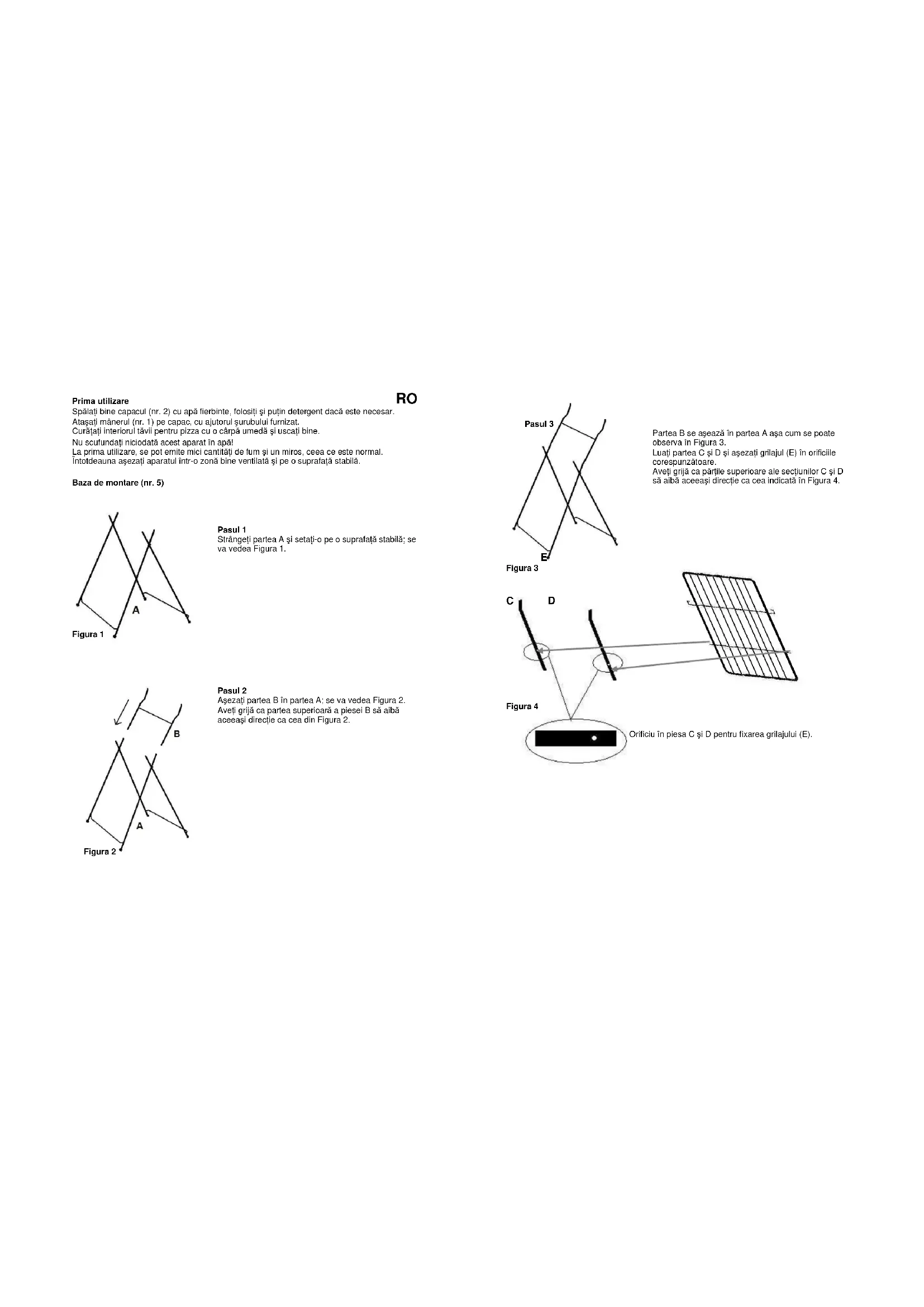 Pasul 3 Partea B se aşează în partea A aşa cum se poate observa în Figura 3. LuaŃi partea C şi D şi aşezaŃi grilajul (E) în orificiile corespunzătoare. AveŃi grijă ca părŃile superioare ale secŃiunilor C şi D să aibă aceeaşi direcŃie ca cea indicată în Figura 4.