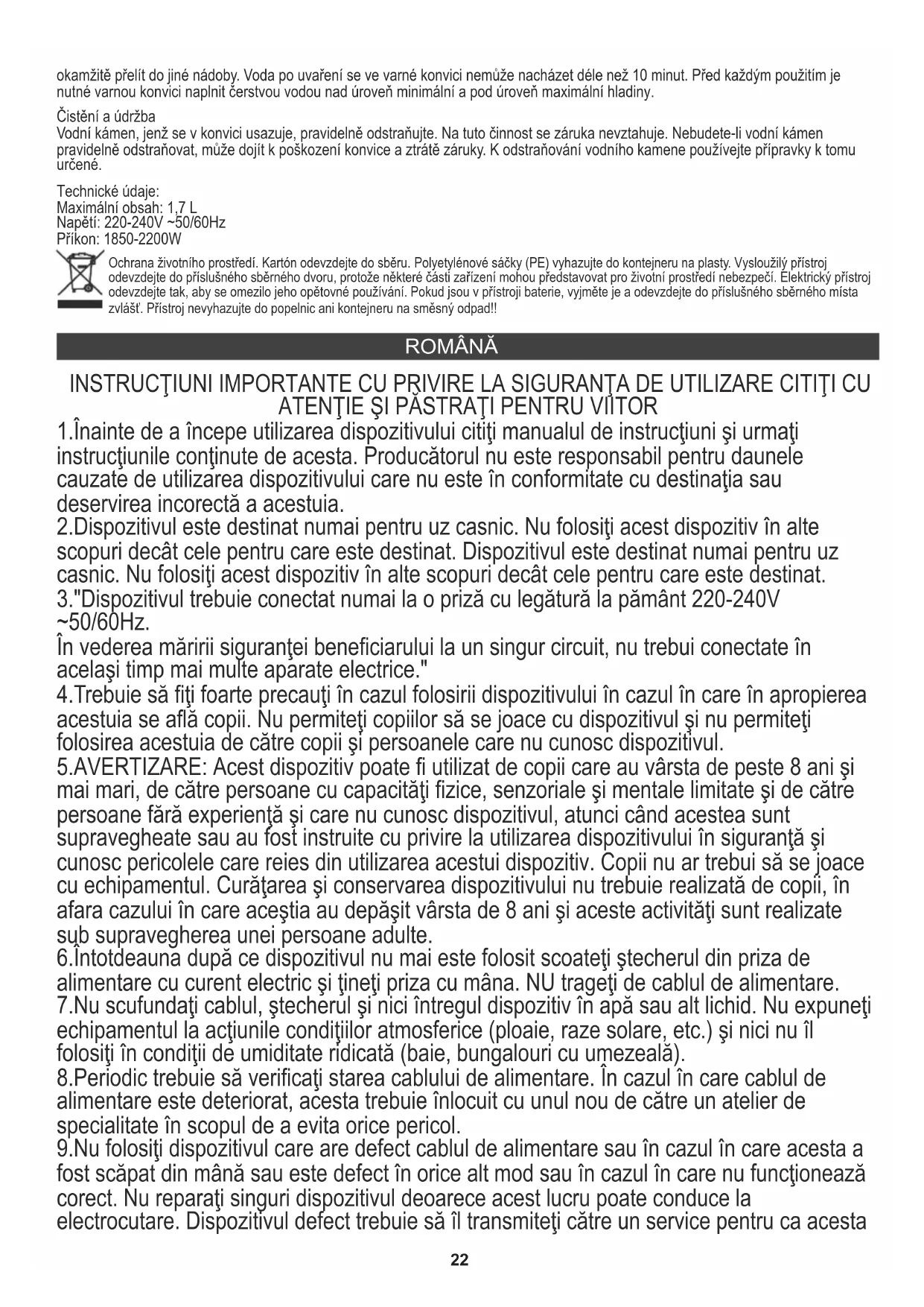 11. Varná konvice je elektrickým spotřebičem, který není určen k přechovávání vody nebo jiných tekutin. Po uvaření je nutné vodu22 ROMÂNĂ INSTRUCŢIUNI IMPORTANTE CU PRIVIRE LA SIGURANŢA DE UTILIZARE CITIŢI CU ATENŢIE ŞI PĂSTRAŢI PENTRU VIITOR 1.Înainte de a începe utilizarea dispozitivului citiţi manualul de instrucţiuni şi urmaţi instrucţiunile conţinute de acesta. Producătorul nu este responsabil pentru daunele cauzate de utilizarea dispozitivului care nu este în conformitate cu destinaţia sau deservirea incorectă a acestuia. 2.Dispozitivul este destinat numai pentru uz casnic. Nu folosiţi acest dispozitiv în alte scopuri decât cele pentru care este destinat. Dispozitivul este destinat numai pentru uz casnic. Nu folosiţi acest dispozitiv în alte scopuri decât cele pentru care este destinat. 3."Dispozitivul trebuie conectat numai la o priză cu legătură la pământ 220-240V ~50/60Hz. În vederea măririi siguranţei beneficiarului la un singur circuit, nu trebui conectate în acelaşi timp mai multe aparate electrice." 4.Trebuie să fiţi foarte precauţi în cazul folosirii dispozitivului în cazul în care în apropierea acestuia se află copii. Nu permiteţi copiilor să se joace cu dispozitivul şi nu permiteţi folosirea acestuia de către copii şi persoanele care nu cunosc dispozitivul. 5.AVERTIZARE: Acest dispozitiv poate fi utilizat de copii care au vârsta de peste 8 ani şi mai mari, de către persoane cu capacităţi fizice, senzoriale şi mentale limitate şi de către persoane fără experienţă şi care nu cunosc dispozitivul, atunci când acestea sunt supravegheate sau au fost instruite cu privire la utilizarea dispozitivului în siguranţă şi cunosc pericolele care reies din utilizarea acestui dispozitiv. Copii nu ar trebui să se joace cu echipamentul. Curăţarea şi conservarea dispozitivului nu trebuie realizată de copii, în afara cazului în care aceştia au depăşit vârsta de 8 ani şi aceste activităţi sunt realizate sub supravegherea unei persoane adulte. 6.Întotdeauna după ce dispozitivul nu mai este folosit scoateţi ştecherul din priza de alimentare cu curent electric şi ţineţi priza cu mâna. NU trageţi de cablul de alimentare. 7.Nu scufundaţi cablul, ştecherul şi nici întregul dispozitiv în apă sau alt lichid. Nu expuneţi echipamentul la acţiunile condiţiilor atmosferice (ploaie, raze solare, etc.) şi nici nu îl folosiţi în condiţii de umiditate ridicată (baie, bungalouri cu umezeală). 8.Periodic trebuie să verificaţi starea cablului de alimentare. În cazul în care cablul de alimentare este deteriorat, acesta trebuie înlocuit cu unul nou de către un atelier de specialitate în scopul de a evita orice pericol. 9.Nu folosiţi dispozitivul care are defect cablul de alimentare sau în cazul în care acesta a fost scăpat din mână sau este defect în orice alt mod sau în cazul în care nu funcţionează corect. Nu reparaţi singuri dispozitivul deoarece acest lucru poate conduce la electrocutare. Dispozitivul defect trebuie să îl transmiteţi către un service pentru ca acesta okamžitě přelít do jiné nádoby. Voda po uvaření se ve varné konvici nemůže nacházet déle než 10 minut. Před každým použitím je nutné varnou konvici naplnit čerstvou vodou nad úroveň minimální a pod úroveň maximální hladiny. Čistění a údržba Vodní kámen, jenž se v konvici usazuje, pravidelně odstraňujte. Na tuto činnost se záruka nevztahuje. Nebudete-li vodní kámen pravidelně odstraňovat, může dojít k poškození konvice a ztrátě záruky. K odstraňování vodního kamene používejte přípravky k tomu určené. Technické údaje: Maximální obsah: 1,7 L Napětí: 220-240V ~50/60Hz Příkon: 1850-2200W Ochrana životního prostředí. Kartón odevzdejte do sběru. Polyetylénové sáčky (PE) vyhazujte do kontejneru na plasty. Vysloužilý přístroj odevzdejte do příslušného sběrného dvoru, protože některé části zařízení mohou představovat pro životní prostředí nebezpečí. Elektrický přístroj odevzdejte tak, aby se omezilo jeho opětovné používání. Pokud jsou v přístroji baterie, vyjměte je a odevzdejte do příslušného sběrného místa zvlášť. Přístroj nevyhazujte do popelnic ani kontejneru na směsný odpad!!23 să fie verificat şi în caz de nevoie reparat. Toate reparaţiile pot fi efectuate numai de către punctele de service care posedă autorizaţie. Reparaţia care nu este realizată incorect poate cauza pericol grav pentru beneficiar. 10.Dispozitivul trebuie amplasat pe o suprafaţă stabilă, netedă, departe de dispozitivele de bucătărie care redau căldură, aşa cum ar fi: aragazul electric şi cel pe gaz etc. 11.Nu folosiţi dispozitivul în apropierea materialelor combustibile. 12.Cablul de alimentare nu poate să atârne peste marginea mesei sau să atingă suprafeţele fierbinţi. 13.Nu se permite lăsarea dispozitivului pornit şi nici a alimentatorului în priză fără supraveghere. 14.Pentru a asigura o protecţie suplimentară, se recomandă instalarea pe circuitul electric a unui dispozitiv cu curent diferenţial (RCD) cu curent alternativ diferenţial care nu va depăşi 30 mA. În acest sens trebuie să vă adresaţi unui electrician specialist.