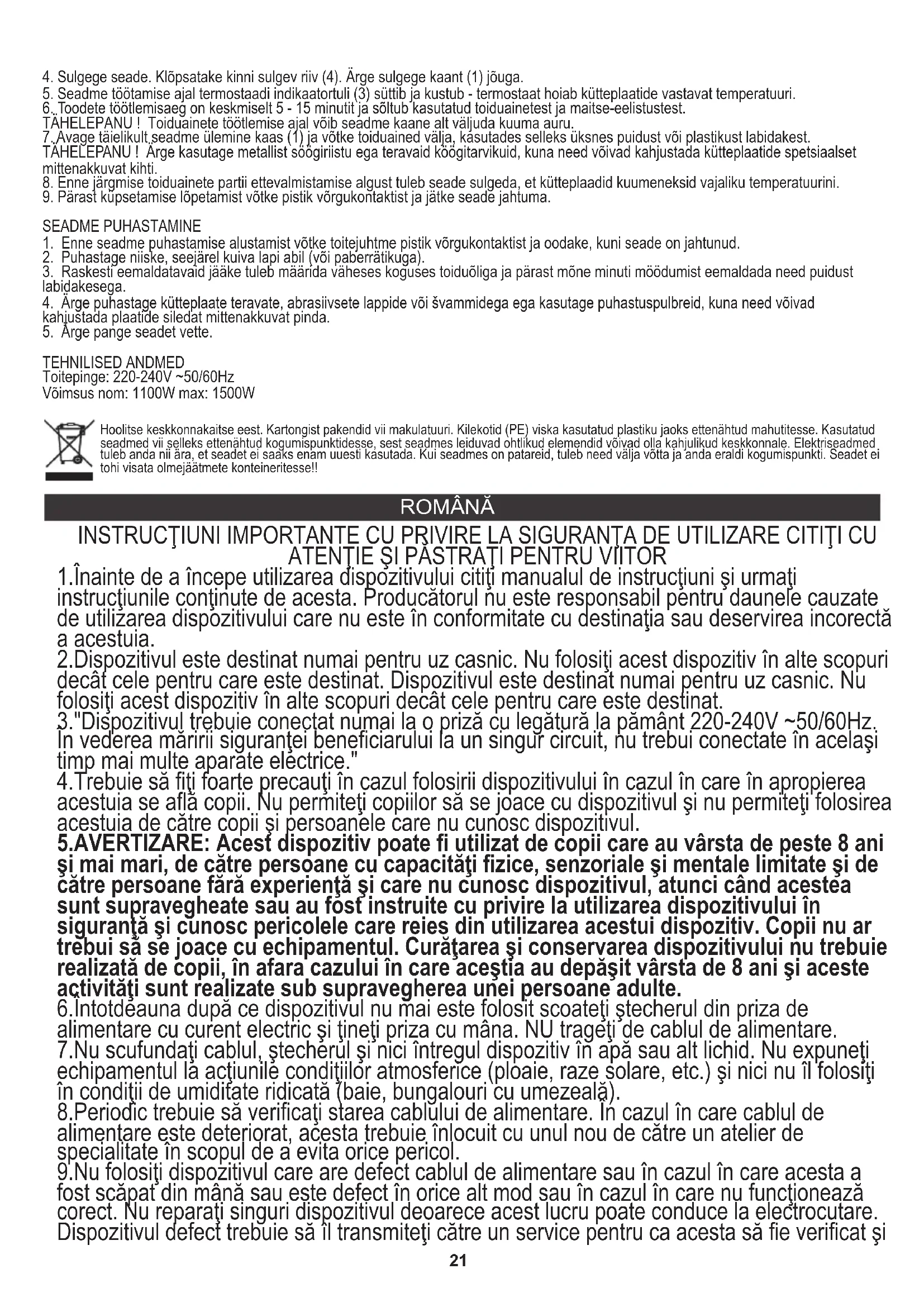 7. Avage täielikult seadme ülemine kaas (1) ja võtke toiduained välja, kasutades selleks üksnes puidust või plastikust labidakest. ROMÂNĂ Hoolitse keskkonnakaitse eest. Kartongist pakendid vii makulatuuri. Kilekotid (PE) viska kasutatud plastiku jaoks ettenähtud mahutitesse. Kasutatud seadmed vii selleks ettenähtud kogumispunktidesse, sest seadmes leiduvad ohtlikud elemendid võivad olla kahjulikud keskkonnale. Elektriseadmed tuleb anda nii ära, et seadet ei saaks enam uuesti kasutada. Kui seadmes on patareid, tuleb need välja võtta ja anda eraldi kogumispunkti. Seadet ei tohi visata olmejäätmete konteineritesse!! INSTRUCŢIUNI IMPORTANTE CU PRIVIRE LA SIGURANŢA DE UTILIZARE CITIŢI CU ATENŢIE ŞI PĂSTRAŢI PENTRU VIITOR 3."Dispozitivul trebuie conectat numai la o priză cu legătură la pământ 220-240V ~50/60Hz. 1.Înainte de a începe utilizarea dispozitivului citiţi manualul de instrucţiuni şi urmaţi instrucţiunile conţinute de acesta. Producătorul nu este responsabil pentru daunele cauzate de utilizarea dispozitivului care nu este în conformitate cu destinaţia sau deservirea incorectă a acestuia. 2.Dispozitivul este destinat numai pentru uz casnic. Nu folosiţi acest dispozitiv în alte scopuri decât cele pentru care este destinat. Dispozitivul este destinat numai pentru uz casnic. Nu folosiţi acest dispozitiv în alte scopuri decât cele pentru care este destinat. 5.AVERTIZARE: Acest dispozitiv poate fi utilizat de copii care au vârsta de peste 8 ani şi mai mari, de către persoane cu capacităţi fizice, senzoriale şi mentale limitate şi de către persoane fără experienţă şi care nu cunosc dispozitivul, atunci când acestea sunt supravegheate sau au fost instruite cu privire la utilizarea dispozitivului în siguranţă şi cunosc pericolele care reies din utilizarea acestui dispozitiv. Copii nu ar trebui să se joace cu echipamentul. Curăţarea şi conservarea dispozitivului nu trebuie realizată de copii, în afara cazului în care aceştia au depăşit vârsta de 8 ani şi aceste activităţi sunt realizate sub supravegherea unei persoane adulte. 8.Periodic trebuie să verificaţi starea cablului de alimentare. În cazul în care cablul de alimentare este deteriorat, acesta trebuie înlocuit cu unul nou de către un atelier de specialitate în scopul de a evita orice pericol. 6.Întotdeauna după ce dispozitivul nu mai este folosit scoateţi ştecherul din priza de alimentare cu curent electric şi ţineţi priza cu mâna. NU trageţi de cablul de alimentare. 7.Nu scufundaţi cablul, ştecherul şi nici întregul dispozitiv în apă sau alt lichid. Nu expuneţi echipamentul la acţiunile condiţiilor atmosferice (ploaie, raze solare, etc.) şi nici nu îl folosiţi în condiţii de umiditate ridicată (baie, bungalouri cu umezeală). 9.Nu folosiţi dispozitivul care are defect cablul de alimentare sau în cazul în care acesta a fost scăpat din mână sau este defect în orice alt mod sau în cazul în care nu funcţionează corect. Nu reparaţi singuri dispozitivul deoarece acest lucru poate conduce la electrocutare. Dispozitivul defect trebuie să îl transmiteţi către un service pentru ca acesta să fie verificat şi 4.Trebuie să fiţi foarte precauţi în cazul folosirii dispozitivului în cazul în care în apropierea acestuia se află copii. Nu permiteţi copiilor să se joace cu dispozitivul şi nu permiteţi folosirea acestuia de către copii şi persoanele care nu cunosc dispozitivul. În vederea măririi siguranţei beneficiarului la un singur circuit, nu trebui conectate în acelaşi timp mai multe aparate electrice."22