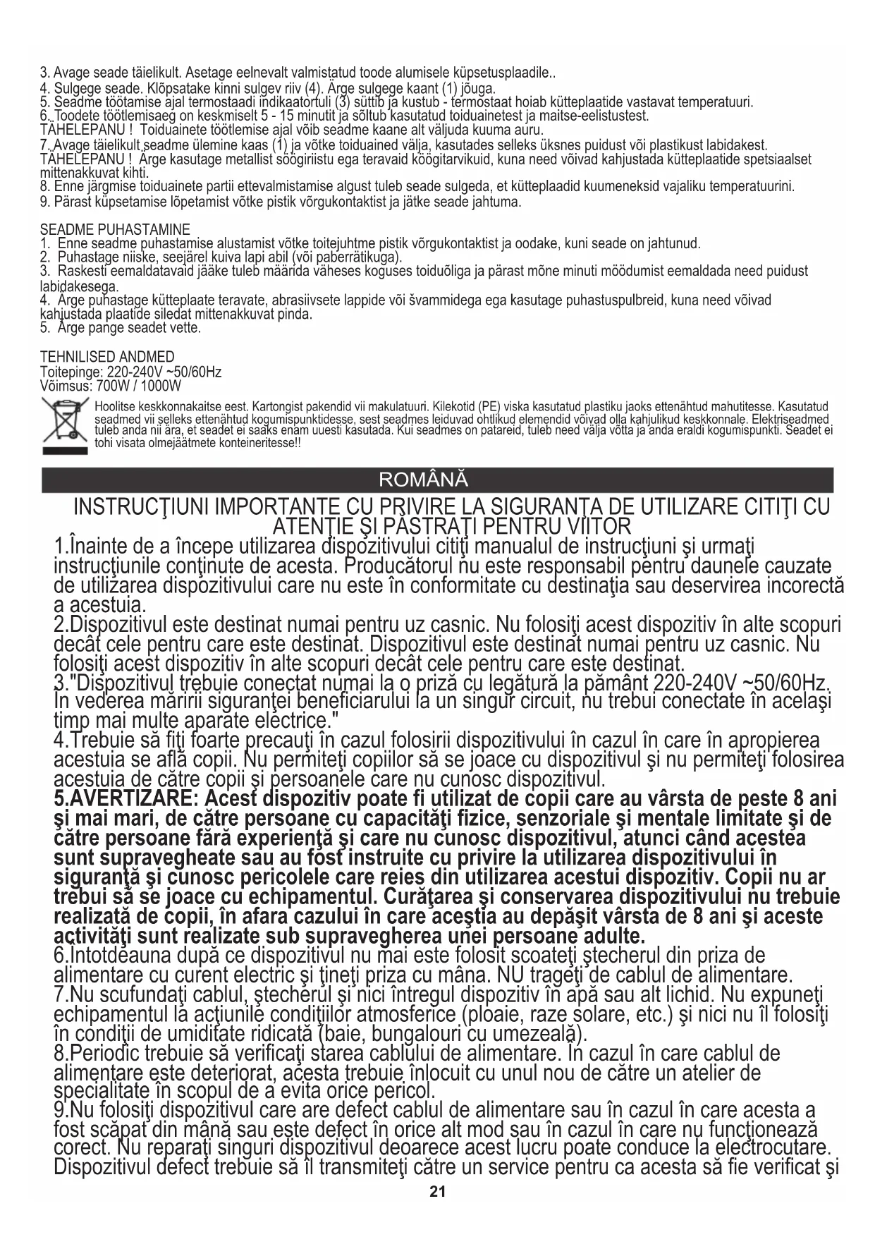 3. Raskesti eemaldatavaid jääke tuleb määrida väheses koguses toiduõliga ja pärast mõne minuti möödumist eemaldada need puidust labidakesega. 4. Ärge puhastage kütteplaate teravate, abrasiivsete lappide või švammidega ega kasutage puhastuspulbreid, kuna need võivad kahjustada plaatide siledat mittenakkuvat pinda. Toitepinge: 220-240V ~50/60Hz Võimsus: 700W / 1000W ROMÂNĂ Hoolitse keskkonnakaitse eest. Kartongist pakendid vii makulatuuri. Kilekotid (PE) viska kasutatud plastiku jaoks ettenähtud mahutitesse. Kasutatud seadmed vii selleks ettenähtud kogumispunktidesse, sest seadmes leiduvad ohtlikud elemendid võivad olla kahjulikud keskkonnale. Elektriseadmed tuleb anda nii ära, et seadet ei saaks enam uuesti kasutada. Kui seadmes on patareid, tuleb need välja võtta ja anda eraldi kogumispunkti. Seadet ei tohi visata olmejäätmete konteineritesse!! 1.Înainte de a începe utilizarea dispozitivului citiţi manualul de instrucţiuni şi urmaţi instrucţiunile conţinute de acesta. Producătorul nu este responsabil pentru daunele cauzate de utilizarea dispozitivului care nu este în conformitate cu destinaţia sau deservirea incorectă a acestuia. 3."Dispozitivul trebuie conectat numai la o priză cu legătură la pământ 220-240V ~50/60Hz. 8.Periodic trebuie să verificaţi starea cablului de alimentare. În cazul în care cablul de alimentare este deteriorat, acesta trebuie înlocuit cu unul nou de către un atelier de specialitate în scopul de a evita orice pericol. INSTRUCŢIUNI IMPORTANTE CU PRIVIRE LA SIGURANŢA DE UTILIZARE CITIŢI CU ATENŢIE ŞI PĂSTRAŢI PENTRU VIITOR 4.Trebuie să fiţi foarte precauţi în cazul folosirii dispozitivului în cazul în care în apropierea acestuia se află copii. Nu permiteţi copiilor să se joace cu dispozitivul şi nu permiteţi folosirea acestuia de către copii şi persoanele care nu cunosc dispozitivul. În vederea măririi siguranţei beneficiarului la un singur circuit, nu trebui conectate în acelaşi timp mai multe aparate electrice." 6.Întotdeauna după ce dispozitivul nu mai este folosit scoateţi ştecherul din priza de alimentare cu curent electric şi ţineţi priza cu mâna. NU trageţi de cablul de alimentare. 7.Nu scufundaţi cablul, ştecherul şi nici întregul dispozitiv în apă sau alt lichid. Nu expuneţi echipamentul la acţiunile condiţiilor atmosferice (ploaie, raze solare, etc.) şi nici nu îl folosiţi în condiţii de umiditate ridicată (baie, bungalouri cu umezeală). 5.AVERTIZARE: Acest dispozitiv poate fi utilizat de copii care au vârsta de peste 8 ani şi mai mari, de către persoane cu capacităţi fizice, senzoriale şi mentale limitate şi de către persoane fără experienţă şi care nu cunosc dispozitivul, atunci când acestea sunt supravegheate sau au fost instruite cu privire la utilizarea dispozitivului în siguranţă şi cunosc pericolele care reies din utilizarea acestui dispozitiv. Copii nu ar trebui să se joace cu echipamentul. Curăţarea şi conservarea dispozitivului nu trebuie realizată de copii, în afara cazului în care aceştia au depăşit vârsta de 8 ani şi aceste activităţi sunt realizate sub supravegherea unei persoane adulte. 2.Dispozitivul este destinat numai pentru uz casnic. Nu folosiţi acest dispozitiv în alte scopuri decât cele pentru care este destinat. Dispozitivul este destinat numai pentru uz casnic. Nu folosiţi acest dispozitiv în alte scopuri decât cele pentru care este destinat. 9.Nu folosiţi dispozitivul care are defect cablul de alimentare sau în cazul în care acesta a fost scăpat din mână sau este defect în orice alt mod sau în cazul în care nu funcţionează corect. Nu reparaţi singuri dispozitivul deoarece acest lucru poate conduce la electrocutare. Dispozitivul defect trebuie să îl transmiteţi către un service pentru ca acesta să fie verificat şi22