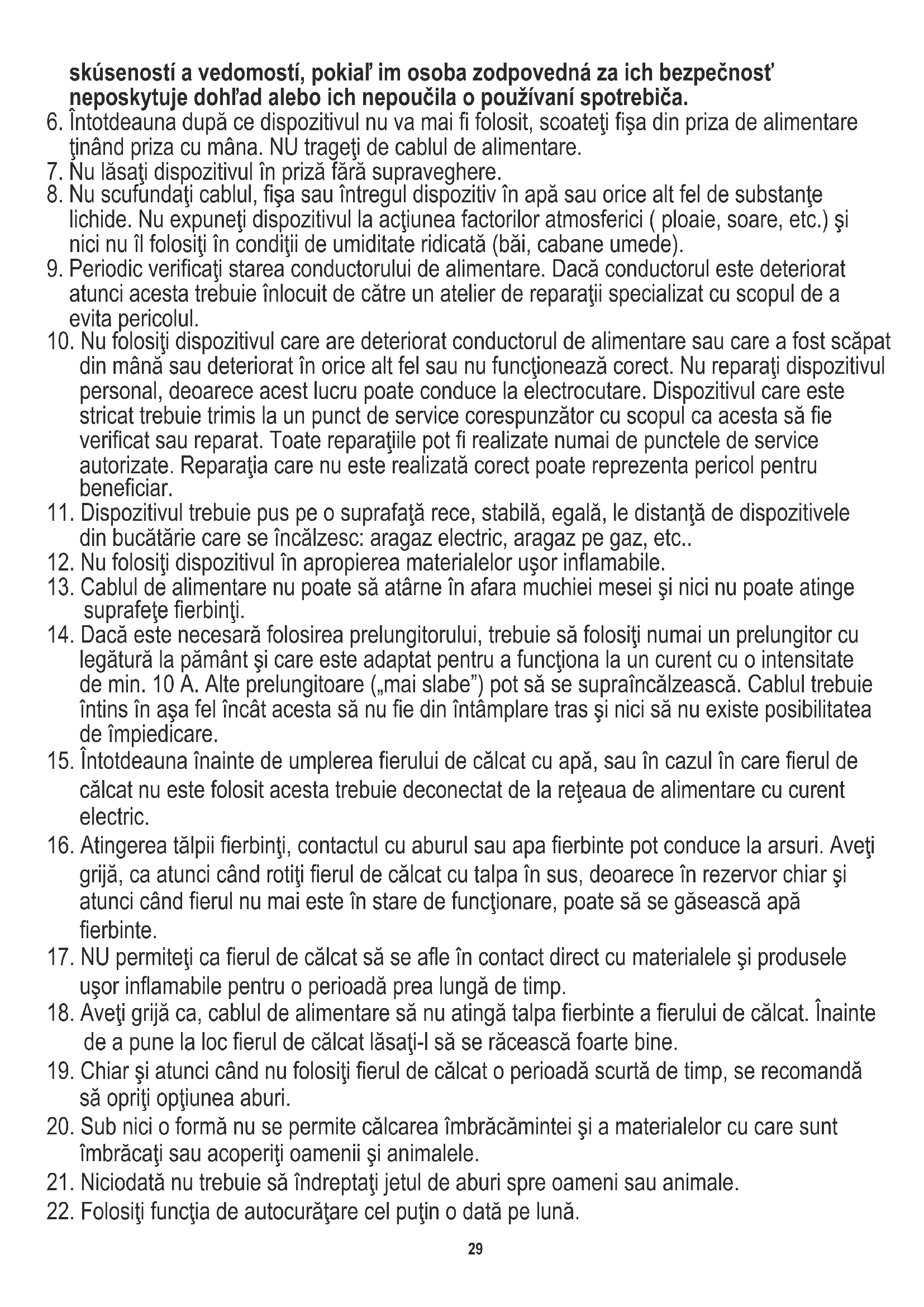 16. Atingerea tălpii fierbinţi, contactul cu aburul sau apa fierbinte pot conduce la arsuri. Aveţi