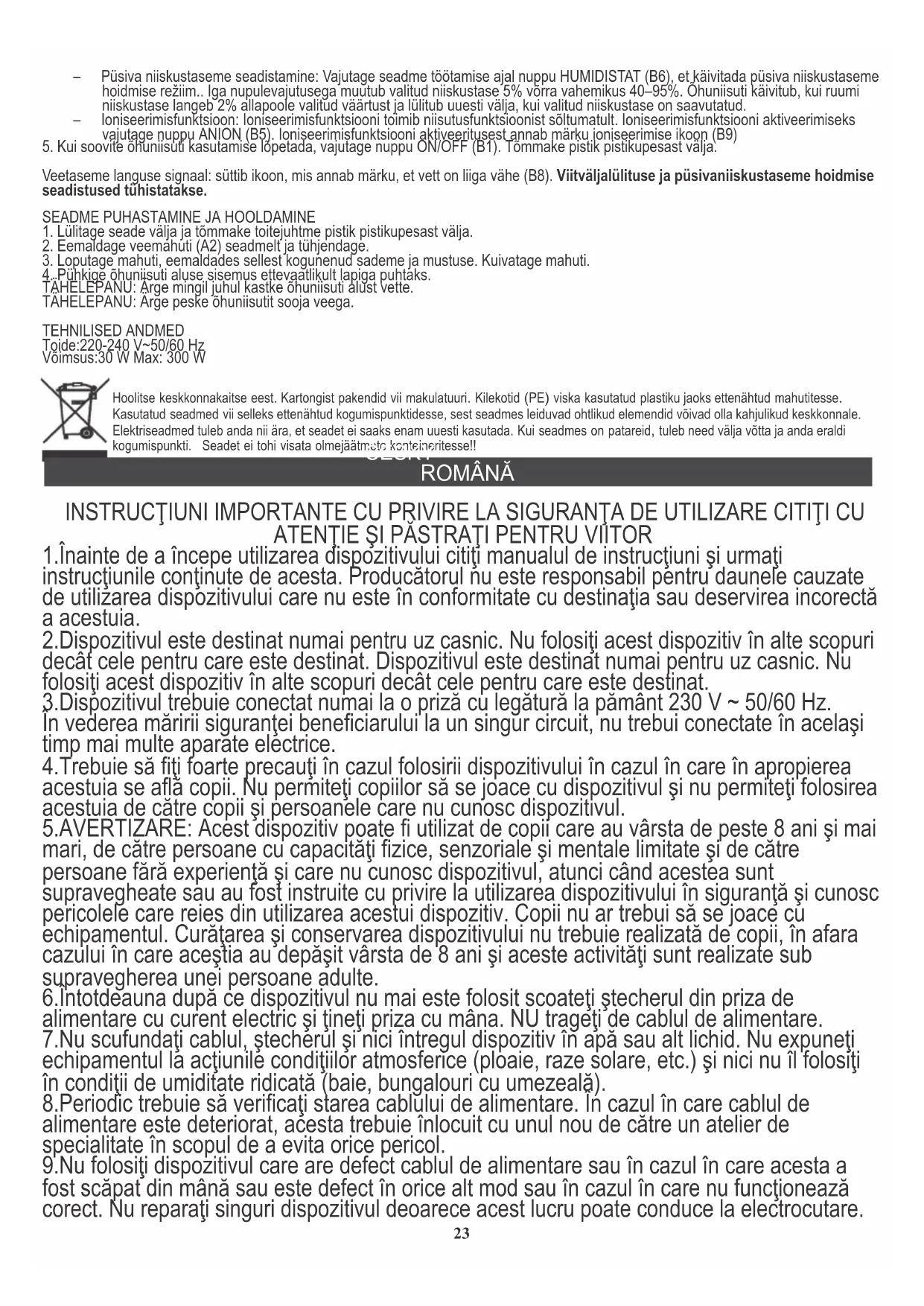 NOTĂ: Nu permiteţi ca suportul bază a umidificatorului să fie udat cu apă. NOTĂ: Nu spălați umidificatorul cu apă caldă. DATE TEHNICE Alimentare: 220-240V~50/60Hz Putere: 30W Max: 300W Din grija pentru mediul înconjurător. Ambalajele din carton vă rugăm să le transmiteţi şa centrele de maculatură. Sacii din polietilenă (PE) trebuie aruncate în recipientele pentru materialele plastice. Dispozitivul uzat trebuie transmis la punctul corespunzător de depozitare, deoarece componentele periculoase care se găsesc în dispozitiv pot fi foarte periculoase pentru mediul înconjurător. Dispozitivul electric trebuie transmis în aşa fel încât să se limiteze utilizarea lui repetată. Dacă în dispozitiv se găsesc baterii acestea trebuiesc scoase şi transmise către punctul de depozitare a acestora, separat. 25OPŠTI USLOVI BEZBJEDNOSTI. VAŽNE UPUTE KOJE SE TIČU BEZBJEDNOSTI UPOTREBE. PROČITAJTE IH PAŽLJIVO I SAČUTOVAJTE KAKO BISTE IH