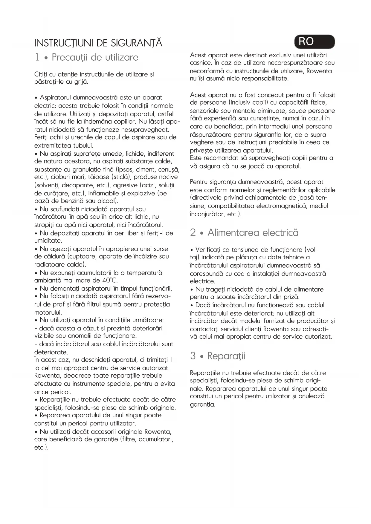 - Nu utilizaţi decât accesorii originale Rowenta, care beneficiază de garanţie (filtre, acumulatori, etc.). Acest aparat este destinat exclusiv unei utilizări casnice. În caz de utilizare necorespunzătoare sau neconformă cu instrucţiunile de utilizare, Rowenta nu îşi asumă nicio responsabilitate. Acest aparat nu a fost conceput pentru a fi folosit de persoane (inclusiv copii) cu capacităfli fizice, senzoriale sau mentale diminuate, saude persoane fără experienflă sau cunoştinţe, numai în cazul în care au beneficiat, prin intermediul unei persoane răspunzătoare pentru siguranfla lor, de o supra- veghere sau de instrucţiuni prealabile în ceea ce priveşte utilizarea aparatului. Este recomandat să supravegheaţi copiii pentru a vă asigura că nu se joacă cu aparatul. Pentru siguranţa dumneavoastră, acest aparat este conform normelor şi reglementărilor aplicabile (directivele privind echipamentele de joasă ten- siune, compatibilitatea electromagnetică, mediul înconjurător, etc.). 2 • Alimentarea electrică
