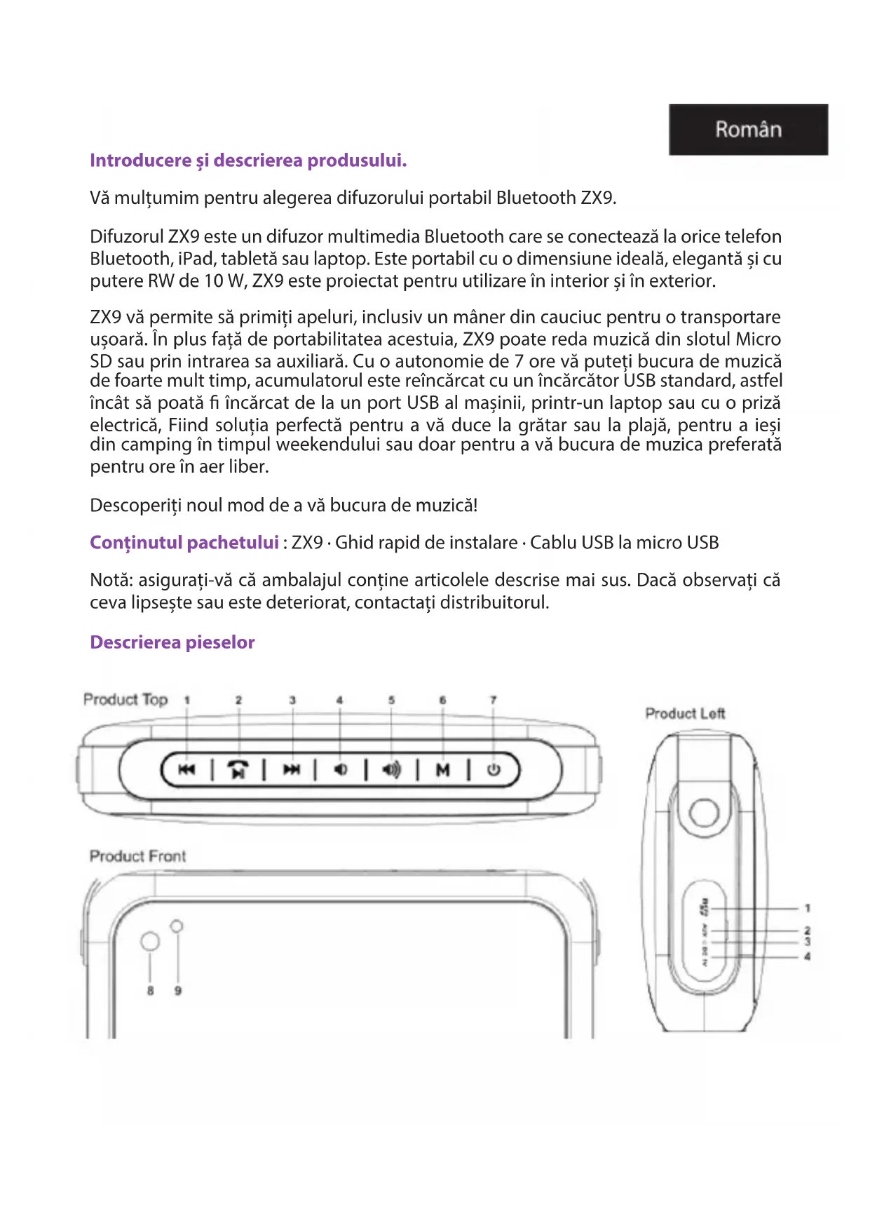 completamente a bateria, faça cobranças periódicas. Suporte técnico. Visite nosso site www.billowtechnology.com para obter mais informações sobre a instalação e conguração deste produto.Introducere și descrierea produsului. Vă mulțumim pentru alegerea difuzorului portabil Bluetooth ZX9. Difuzorul ZX9 este un difuzor multimedia Bluetooth care se conectează la orice telefon Bluetooth, iPad, tabletă sau laptop. Este portabil cu o dimensiune ideală, elegantă și cu putere RW de 10 W, ZX9 este proiectat pentru utilizare în interior și în exterior. ZX9 vă permite să primiți apeluri, inclusiv un mâner din cauciuc pentru o transportare ușoară. În plus față de portabilitatea acestuia, ZX9 poate reda muzică din slotul Micro SD sau prin intrarea sa auxiliară. Cu o autonomie de 7 ore vă puteți bucura de muzică de foarte mult timp, acumulatorul este reîncărcat cu un încărcător USB standard, astfel încât să poată încărcat de la un port USB al mașinii, printr-un laptop sau cu o priză electrică, Fiind soluția perfectă pentru a vă duce la grătar sau la plajă, pentru a ieși din camping în timpul weekendului sau doar pentru a vă bucura de muzica preferată pentru ore în aer liber. Descoperiți noul mod de a vă bucura de muzică! Conținutul pachetului : ZX9 · Ghid rapid de instalare · Cablu USB la micro USB Notă: asigurați-vă că ambalajul conține articolele descrise mai sus. Dacă observați că ceva lipsește sau este deteriorat, contactați distribuitorul. Descrierea pieselor1. Cântecul anterior