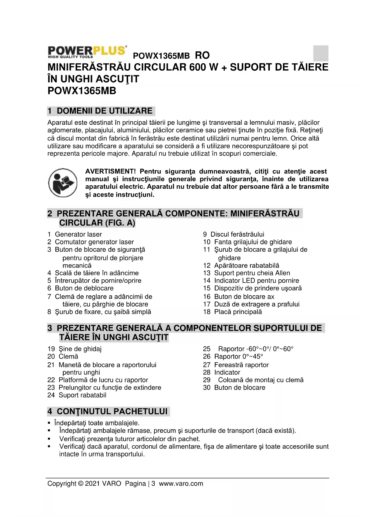 AVERTISMENT: Tăiaţi întotdeauna spre înainte. Nu trageţi niciodată spre înapoi aparatul. Dacă sunteţi utilizator începător, exersaţi tăind lemn subţire până deveniţi expert. Reglaţi unghiul de tăiere al bancului de lucru. (vezi secţiunea Reglarea unghiului de tăiere) Aşezaţi piesa de prelucrat pe bancul de lucru şi strângeţi-o cu clemei (20). (Vezi secţiunea Montarea şi reglarea clemei) NOTĂ: Dacă lungimea piesei de prelucrat este mai mare decât valoarea normală, puteţi utiliza funcţia de extindere a prelungitorului (23); ţineţi suportul rabatabil (24) şi trageţi prelungitorul într-o poziţie potrivită pentru piesa de prelucrat. (vezi fig. 9 şi fig. 10) Montaţi un disc corespunzător, asigurându-vă că este ascuţit şi nu este avariat. Reglaţi adâncimea de tăiere. (Vezi secţiunea „Reglarea adâncimii de tăiere”) Apucaţi cu fermitate aparatul (vezi secţiunea „Apucarea şi pornirea şi oprirea”), porniţi aparatul şi aşteptaţi câteva momente pentru ca discul să atingă turaţia de funcţionare. Apoi apăsaţi butonul de blocare de siguranţă (3) şi plonjaţi discul în material, lent şi cuPOWX1365MB RO Copyright © 2021 VARO Pagina | 12 www.varo.com grijă, dar cu fermitate. Apoi împingeţi aparatul spre înainte de-a lungul şinelor de ghidaj (19). NOTĂ: Nu trageţi niciodată spre înapoi aparatul. După terminarea tăierii, ridicaţi aparatul de pe bancul de lucru înainte de a-l opri. Dacă s-a produs mult praf, menţineţi aparatul pornit câteva secunde în plus pentru a permite degajarea prafului de lângă aparat. NOTĂ: Dacă efectuaţi tăierea fără bancul de lucru, puteţi consulta descrierile de mai jos: Montaţi un disc corespunzător, asigurându-vă că este ascuţit şi nu este avariat. Reglaţi adâncimea de tăiere, porniţi aparatul şi aşteptaţi câteva momente pentru ca discul să ajungă la turaţia de funcţionare. Apăsaţi şi ţineţi apăsat butonul de blocare de siguranţă (3) şi plonjaţi discul în material, lent şi cu grijă, dar cu fermitate. Împingeţi aparatul spre înainte de-a lungul liniei de tăiere. Dacă este necesar, porniţi generatorul de laser (1). (consultaţi secţiunea Generatorul fasciculului laser)