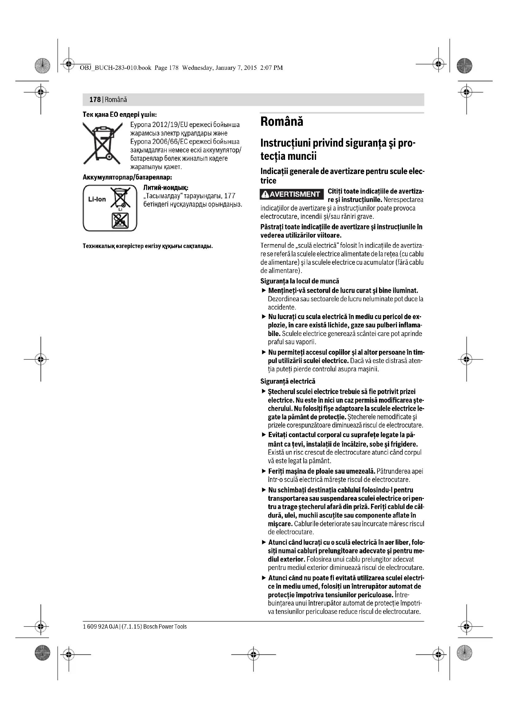 Ştecherul sculei electrice trebuie să fie potrivit prizei electrice. Nu este în nici un caz permisă modificarea şte- cherului. Nu folosiţi fişe adaptoare la sculele electrice le- gate la pământ de protecţie. Ştecherele nemodificate şi prizele corespunzătoare diminuează riscul de electrocutare. Evitaţi contactul corporal cu suprafeţe legate la pă- mânt ca ţevi, instalaţii de încălzire, sobe şi frigidere. Există un risc crescut de electrocutare atunci când corpul vă este legat la pământ. Feriţi maşina de ploaie sau umezeală. Pătrunderea apei într-o sculă electrică măreşte riscul de electrocutare. Nu schimbaţi destinaţia cablului folosindu-l pentru transportarea sau suspendarea sculei electrice ori pen- tru a trage ştecherul afară din priză. Feriţi cablul de căl- dură, ulei, muchii ascuţite sau componente aflate în mişcare. Cablurile deteriorate sau încurcate măresc riscul de electrocutare. Atunci când lucraţi cu o sculă electrică în aer liber, folo- siţi numai cabluri prelungitoare adecvate şi pentru me- diul exterior. Folosirea unui cablu prelungitor adecvat pentru mediul exterior diminuează riscul de electrocutare. Atunci când nu poate fi evitată utilizarea sculei electri- ce în mediu umed, folosiţi un întrerupător automat de protecţie împotriva tensiunilor periculoase. Între- buinţarea unui întrerupător automat de protecţie împotri- va tensiunilor periculoase reduce riscul de electrocutare. AVERTISMENT OBJ_BUCH-283-010.book Page 178 Wednesday, January 7, 2015 2:07 PMRomână | 179 Bosch Power Tools 1 609 92A 0JA | (7.1.15) Siguranţa persoanelor Fiţi atenţi, aveţi grijă de ceea ce faceţi şi procedaţi raţi- onal atunci când lucraţi cu o sculă electrică. Nu folosiţi scula electrică atunci când sunteţi obosiţi sau vă aflaţi sub influenţa drogurilor, a alcoolului sau a medicamen- telor. Un moment de neatenţie în timpul utilizării maşinii poate duce la răniri grave. Purtaţi echipament personal de protecţie şi întotdeau- na ochelari de protecţie. Purtarea echipamentului perso- nal de protecţie, ca masca pentru praf, încălţăminte de si- guranţă antiderapantă, casca de protecţie sau protecţia auditivă, în funcţie de tipul şi utilizarea sculei electrice, diminuează riscul rănirilor. Evitaţi o punere în funcţiune involuntară. Înainte de a introduce ştecherul în priză şi/sau de a introduce acu- mulatorul în scula electrică, de a o ridica sau de a o transporta, asiguraţi-vă că aceasta este oprită. Dacă atunci când transportaţi scula electrică ţineţi degetul pe întrerupător sau dacă porniţi scula electrică înainte de a o racorda la reţeaua de curent, puteţi provoca accidente. Înainte de pornirea sculei electrice îndepărtaţi dispozi- tivele de reglare sau cheile fixe din aceasta. Un dispozi- tiv sau o cheie lăsată într-o componentă de maşină care se roteşte poate duce la răniri. Evitaţ i o ţinută corporală nefirească. Adoptaţi o poziţie stabilă şi menţineţi-vă întotdeauna echilibrul. Astfel veţi putea controla mai bine maşina în situaţii neaşteptate. Purtaţi îmbrăcăminte adecvată. Nu purtaţi îmbrăcă- minte largă sau podoabe. Feriţi părul, îmbrăcămintea şi mănuşile de piesele aflate în mişcare. Îmbrăcămintea largă, părul lung sau podoabele pot fi prinse în piesele afla- te în mişcare. Dacă pot fi montate echipamente de aspirare şi colec- tare a prafului, asiguraţi-vă că acestea sunt racordate şi folosite în mod corect. Folosirea unei instalaţii de aspi- rare a prafului poate duce la reducerea poluării cu praf. Utilizarea şi manevrarea atentă a sculelor electrice Nu suprasolicitaţi maşina. Folosiţi pentru executarea lucrării dv. scula electrică destinată acelui scop. Cu scula electrică potrivită lucraţi mai bine şi mai sigur în do- meniul de putere indicat. Nu folosiţi scula elecrică dacă aceasta are întrerupăto- rul defect. O sculă electrică, care nu mai poate fi pornită sau oprită, este periculoasă şi trebuie reparată. Scoateţi ştecherul afară din priză şi/sau îndepărtaţi acumulatorul, înainte de a executa reglaje, a schimba accesorii sau de a pune maşina la o parte. Această măsu- ră de prevedere împiedică pornirea involuntară a sculei electrice. Păstraţi sculele electrice nefolosite la loc inaccesibil copiilor. Nu lăsaţi să lucreze cu maşina persoane care nu sunt familiarizate cu aceasta sau care nu au citit a- ceste instrucţiuni. Sculele electrice devin periculoase atunci când sunt folosite de persoane lipsite de experien- ţă. Întreţineţi-vă scula electrică cu grijă. Controlaţi dacă componentele mobile ale sculei electrice funcţionează impecabil şi dacă nu se blochează, sau dacă există pie- se rupte sau deteriorate astfel încât să afecteze funcţi- onarea sculei electrice. Înainte de utilizare daţi la repa- rat piesele deteriorate. Cauza multor accidente a fost în- treţinerea necorespunzătoare a sculelor electrice. Menţineţi bine ascuţite şi curate dispozitivele de tăie- re. Dispozitivele de tăiere întreţinute cu grijă, cu tăişuri as- cuţite se înţepenesc în mai mică măsură şi pot fi conduse mai uşor. Folosiţi scula electrică, accesoriile, dispozitivele de lu- cru etc. conform prezentelor instrucţiuni. Ţineţi cont de condiţiile de lucru şi de activitatea care trebuie des- făşurată. Folosirea sculelor electrice în alt scop decât pen- tru utilizările prevăzute, poate duce la situaţii periculoase. Manevrarea şi utilizarea atentă a sculelor electrice cu acu- mulator Încărcaţi acumulatorii numai în încărcătoarele reco- mandate de producător. Dacă un încărcător destinat unui anumit tip de acumulator este folosit la încărcarea altor ti- puri de acumulator decât cele prevăzute pentru el, există pericol de incendiu. Folosiţi numai acumulatori special destinaţi sculelor 