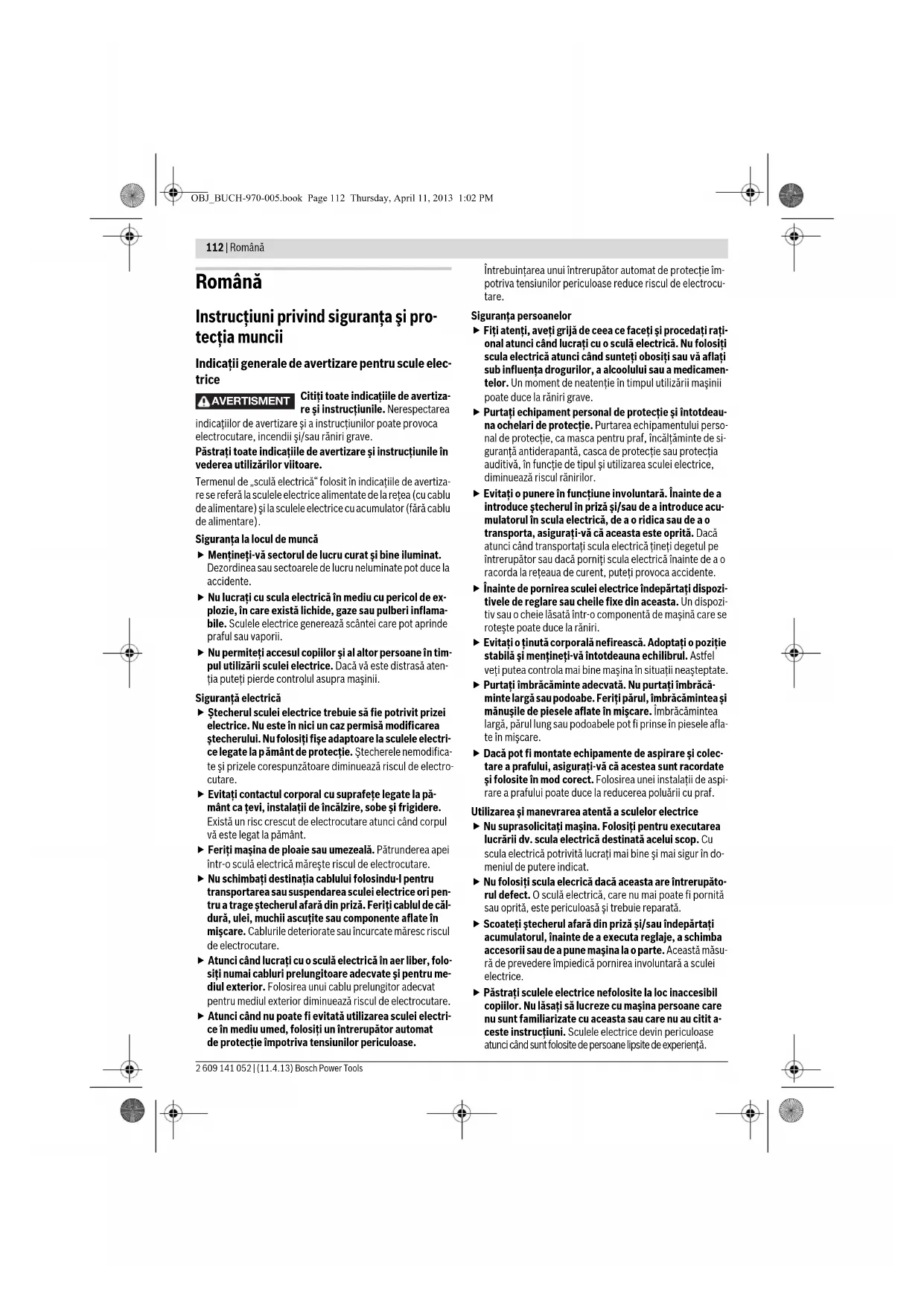 Batrec AG 3752 Wimmis BE Аккумуляторлар/батареялар: Литий-иондық: „Тасымалдау“ тарауындағы, 111 бетіндегі нұсқауларды орындаңыз. Техникалық өзгерістер енгізу құқығы сақталады. OBJ_BUCH-970-005.book Page 111 Thursday, April 11, 2013 1:02 PM112 | Română 2 609 141 052 | (11.4.13) Bosch Power Tools Română Instrucţiuni privind siguranţa şi pro- tecţia muncii Indicaţii generale de avertizare pentru scule elec- trice Citiţi toate indicaţiile de avertiza- re şi instrucţiunile. Nerespectarea indicaţiilor de avertizare şi a instrucţiunilor poate provoca electrocutare, incendii şi/sau răniri grave. Păstraţi toate indicaţiile de avertizare şi instrucţiunile în vederea utilizărilor viitoare. Termenul de „sculă electrică“ folosit în indicaţiile de avertiza- re se referă la sculele electrice alimentate de la reţea (cu cablu de alimentare) şi la sculele electrice cu acumulator (fără cablu de alimentare). Siguranţa la locul de muncă Menţineţi-vă sectorul de lucru curat şi bine iluminat. Dezordinea sau sectoarele de lucru neluminate pot duce la accidente. Nu lucraţi cu scula electrică în mediu cu pericol de ex- plozie, în care există lichide, gaze sau pulberi inflama- bile. Sculele electrice generează scântei care pot aprinde praful sau vaporii. Nu permiteţi accesul copiilor şi al altor persoane în tim- pul utilizării sculei electrice. Dacă vă este distrasă aten- ţia puteţi pierde controlul asupra maşinii. Siguranţă electrică Ştecherul sculei electrice trebuie să fie potrivit prizei electrice. Nu este în nici un caz permisă modificarea ştecherului. Nu folosiţi fişe adaptoare la sculele electri- ce legate la p ământ de protecţie. Ştecherele nemodifica- te şi prizele corespunzătoare diminuează riscul de electro- cutare. Evitaţi contactul corporal cu suprafeţe legate la pă- mânt ca ţevi, instalaţii de încălzire, sobe şi frigidere. Există un risc crescut de electrocutare atunci când corpul vă este legat la pământ. Feriţi maşina de ploaie sau umezeală. Pătrunderea apei într-o sculă electrică măreşte riscul de electrocutare. Nu schimbaţi destinaţia cablului folosindu-l pentru transportarea sau suspendarea sculei electrice ori pen- tru a trage ştecherul afară din priză. Feriţi cablul de căl- dură, ulei, muchii ascuţite sau componente aflate în mişcare. Cablurile deteriorate sau încurcate măresc riscul de electrocutare. Atunci când lucraţi cu o sculă electrică în aer liber, folo- siţi numai cabluri prelungitoare adecvate şi pentru me- diul exterior. Folosirea unui cablu prelungitor adecvat pentru mediul exterior diminuează riscul de electrocutare. Atunci când nu poate fi evitată utilizarea sculei electri- ce în mediu umed, folosiţi un întrerupător automat de protecţie împotriva tensiunilor periculoase. Întrebuinţarea unui întrerupător automat de protecţie îm- potriva tensiunilor periculoase reduce riscul de electrocu- tare. Siguranţa persoanelor Fiţi atenţi, aveţi grijă de ceea ce faceţi şi procedaţi raţi- onal atunci când lucraţi cu o sculă electrică. Nu folosiţi scula electrică atunci când sunteţi obosiţi sau vă aflaţi sub influenţa drogurilor, a alcoolului sau a medicamen- telor. Un moment de neatenţie în timpul utilizării maşinii poate duce la răniri grave. Purtaţi echipament personal de protecţie şi întotdeau- na ochelari de protecţie. Purtarea echipamentului perso- nal de protecţie, ca masca pentru praf, încălţăminte de si- guranţă antiderapantă, casca de protecţie sau protecţia auditivă, în funcţie de tipul şi utilizarea sculei electrice, diminuează riscul rănirilor. Evitaţi o punere în funcţiune involuntară. Înainte de a introduce ştecherul în priză şi/sau de a introduce acu- mulatorul în scula electrică, de a o ridica sau de a o transporta, asiguraţ i-vă că aceasta este oprită. Dacă atunci când transportaţi scula electrică ţineţi degetul pe întrerupător sau dacă porniţi scula electrică înainte de a o racorda la reţeaua de curent, puteţi provoca accidente. Înainte de pornirea sculei electrice îndepărtaţi dispozi- tivele de reglare sau cheile fixe din aceasta. Un dispozi- tiv sau o cheie lăsată într-o componentă de maşină care se roteşte poate duce la răniri. Evitaţi o ţinută corporală nefirească. Adoptaţi o poziţie stabilă şi menţineţi-vă întotdeauna echilibrul. Astfel veţi putea controla mai bine maşina în situaţii neaşteptate. Purtaţi îmbrăcăminte adecvată. Nu purtaţi îmbrăcă- minte largă sau podoabe. Feriţi părul, îmbrăc ămintea şi mănuşile de piesele aflate în mişcare. Îmbrăcămintea largă, părul lung sau podoabele pot fi prinse în piesele afla- te în mişcare. Dacă pot fi montate echipamente de aspirare şi colec- tare a prafului, asiguraţi-vă că acestea sunt racordate şi folosite în mod corect. Folosirea unei instalaţii de aspi- rare a prafului poate duce la reducerea poluării cu praf. Utilizarea şi manevrarea atentă a sculelor electrice Nu suprasolicitaţi maşina. Folosiţi pentru executarea lucrării dv. scula electrică destinată acelui scop. Cu scula electrică potrivită lucraţi mai bine şi mai sigur în do- meniul de putere indicat. Nu folosiţi scula elecrică dacă aceasta are întrerupăto- rul defect. O sculă electrică, care nu mai poate fi pornită sau oprită, este periculoasă şi trebuie reparată. Scoateţi ştecherul afară din priză şi/sau îndepărtaţi acumulatorul, înainte de a executa reglaje, a schimba accesorii sau de a pune maşina la o parte. Această măsu- ră de prevedere împiedică pornirea involuntară a sculei electrice. Păstraţi sculele electrice nefolosite la loc inaccesibil copiilor. Nu lăsaţi să lucreze cu maşina persoane care nu sunt familiarizate 